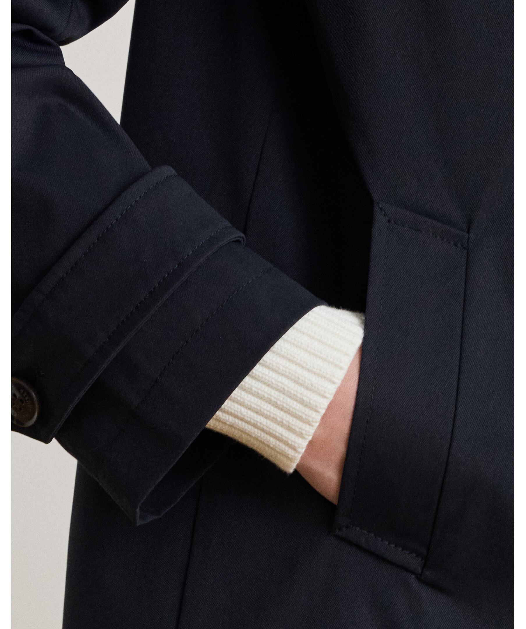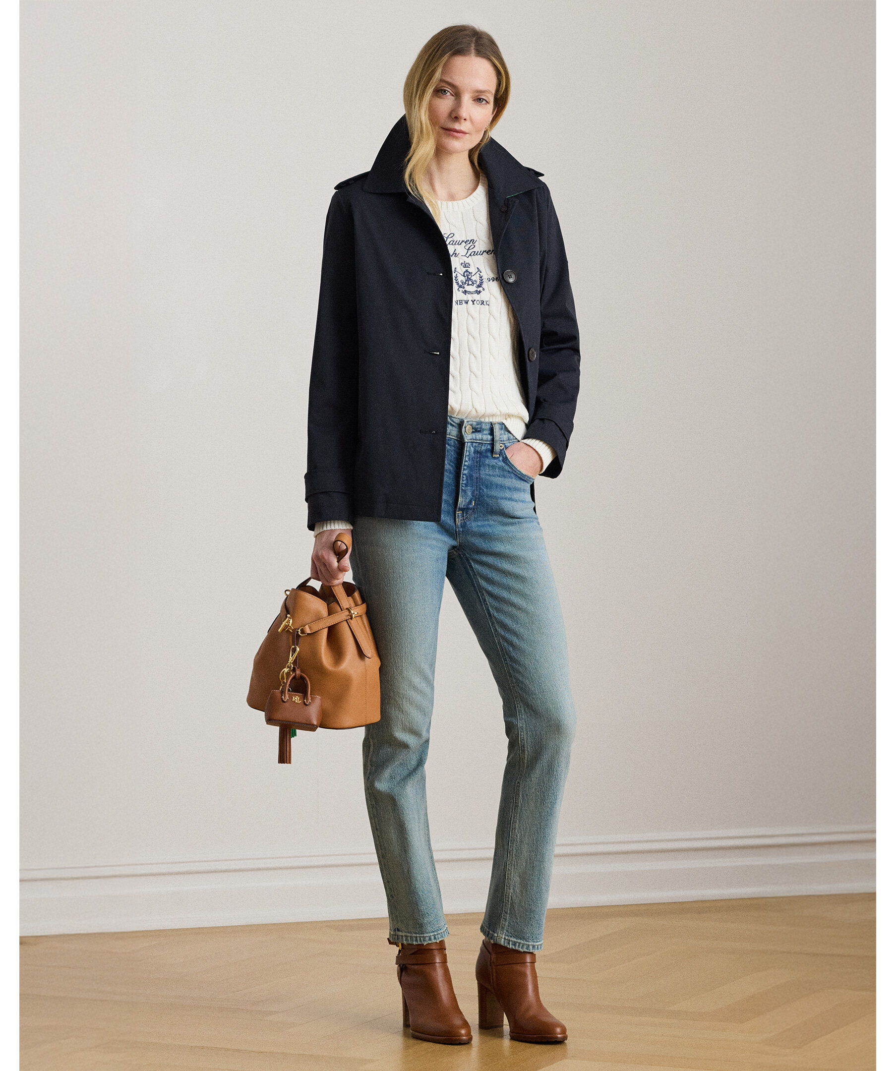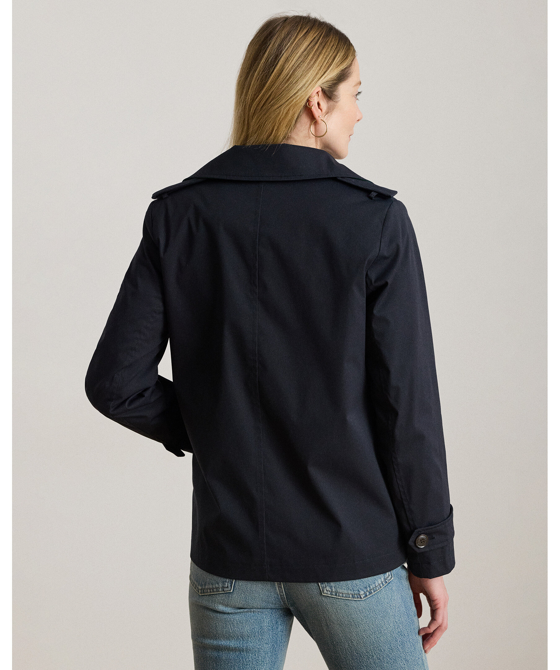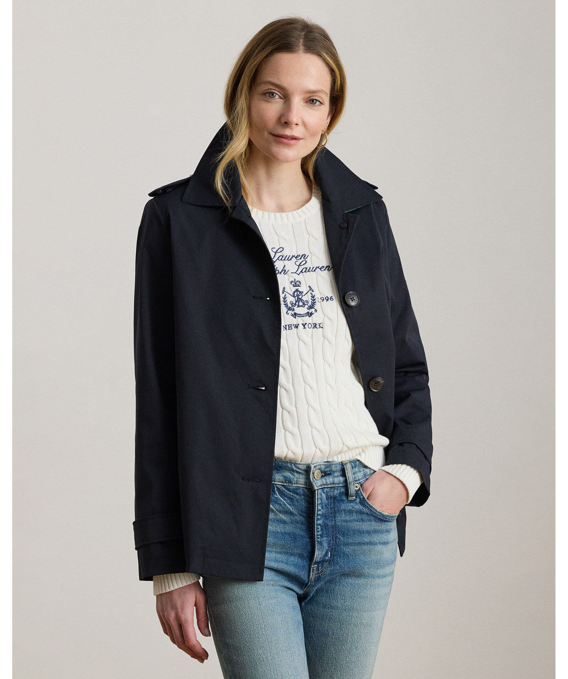 Mörkblå trenchcoat från Ralph Lauren i vattenavstötande twill med klassisk design och ton‑i‑ton broderad emblemdetalj på ärmen. Jackan har traditionella epåletter vid axlarna och horn‑effektknappar som ger en tidlös, elegant look — perfekt som ytterlager i övergångsväder.