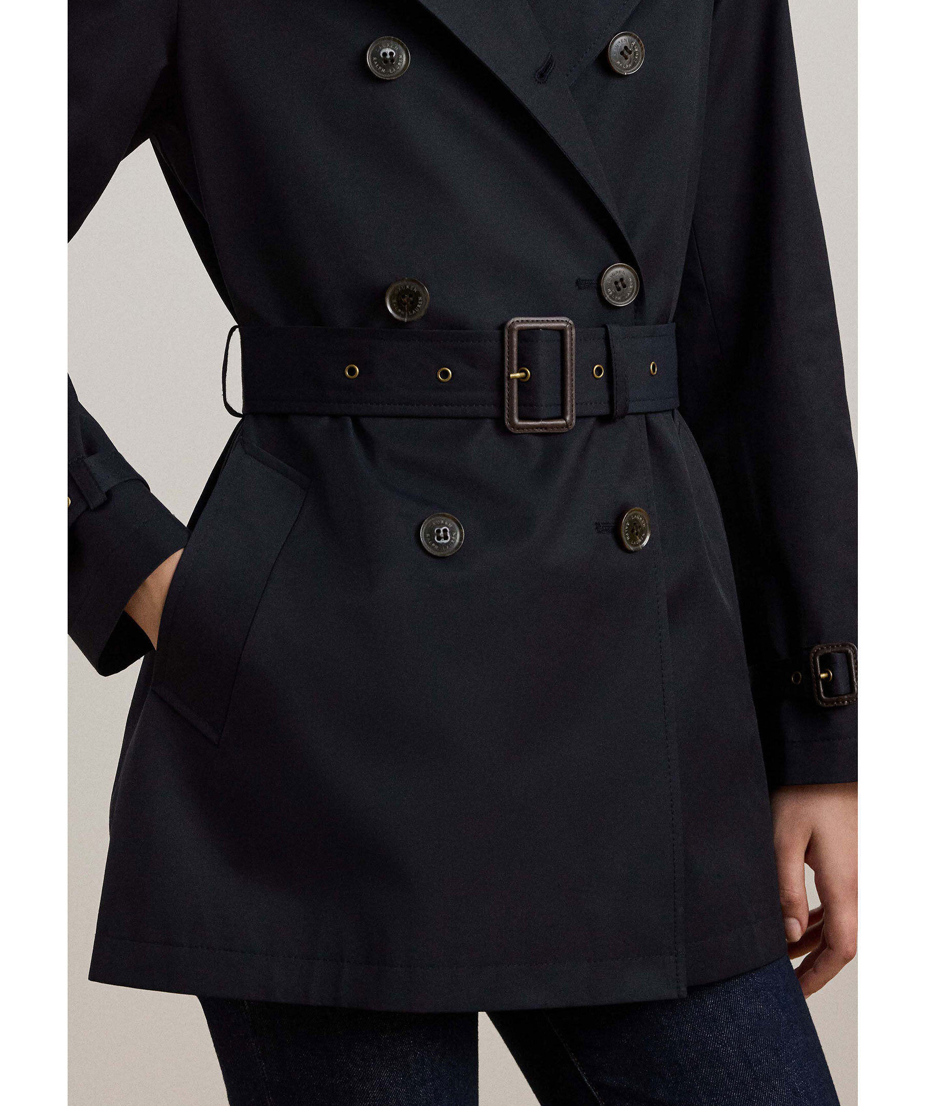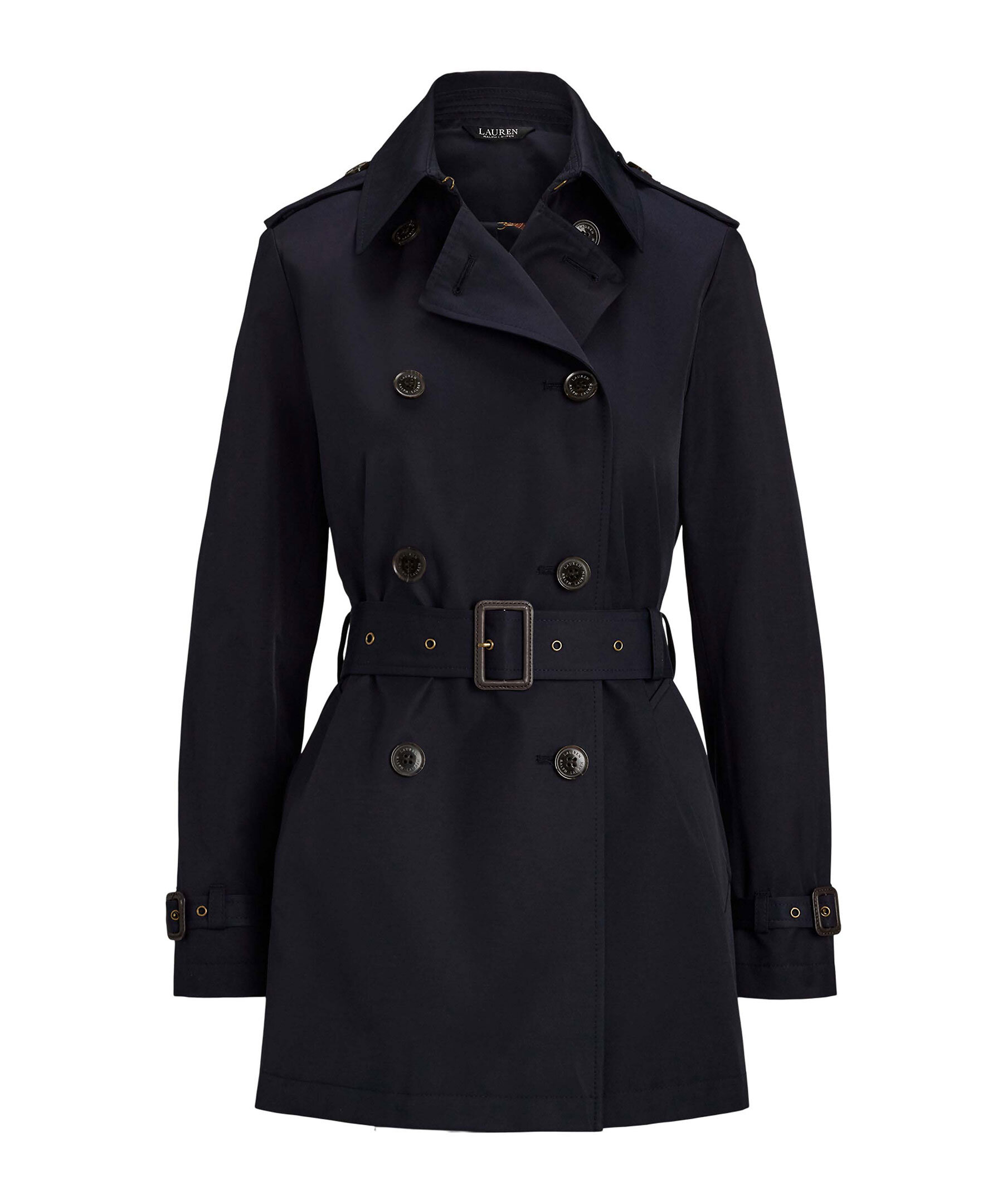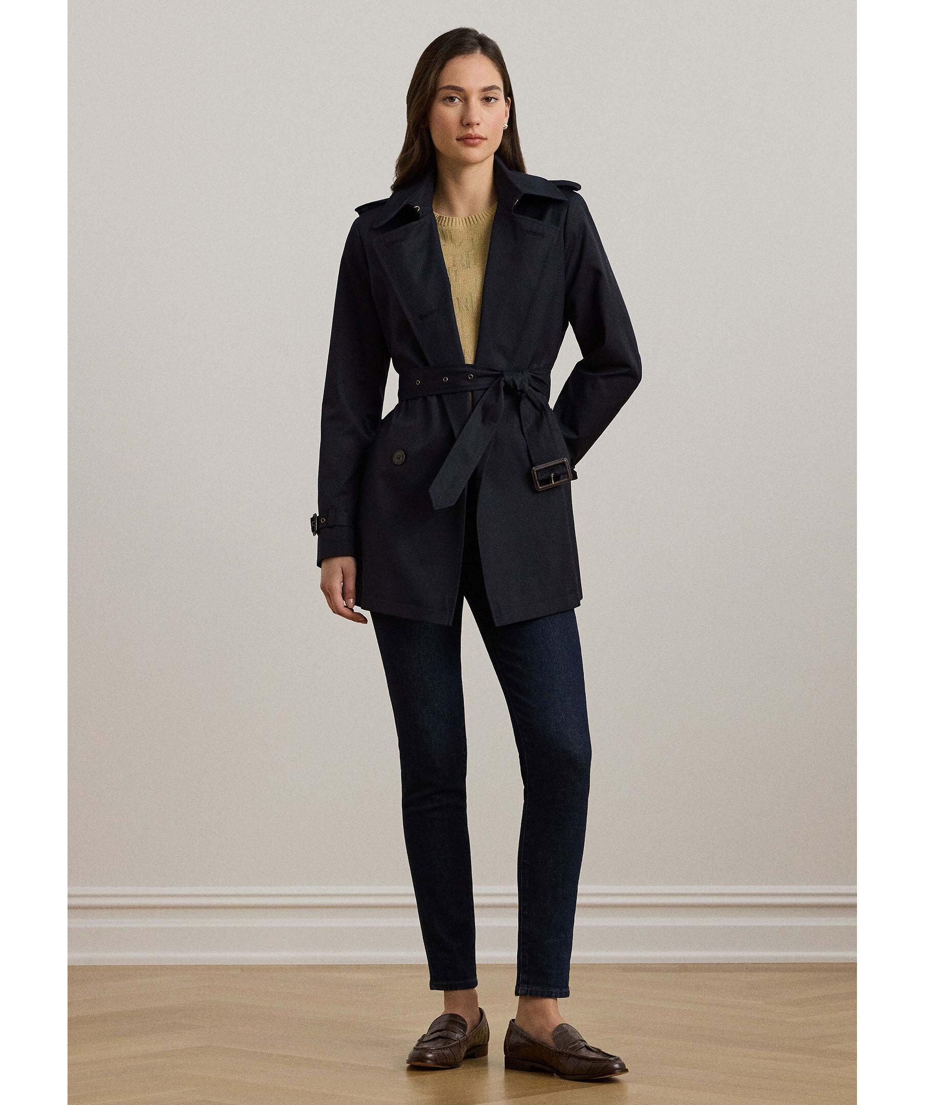 Marinblå dubbelknäppt kappa från Lauren Ralph Lauren. Kappan slutar strax övanför knäna och stängs med knappar samt ett bälte i midjan. Mönstrad insida. Tillverkad i en bomull- och polyesterblandning.