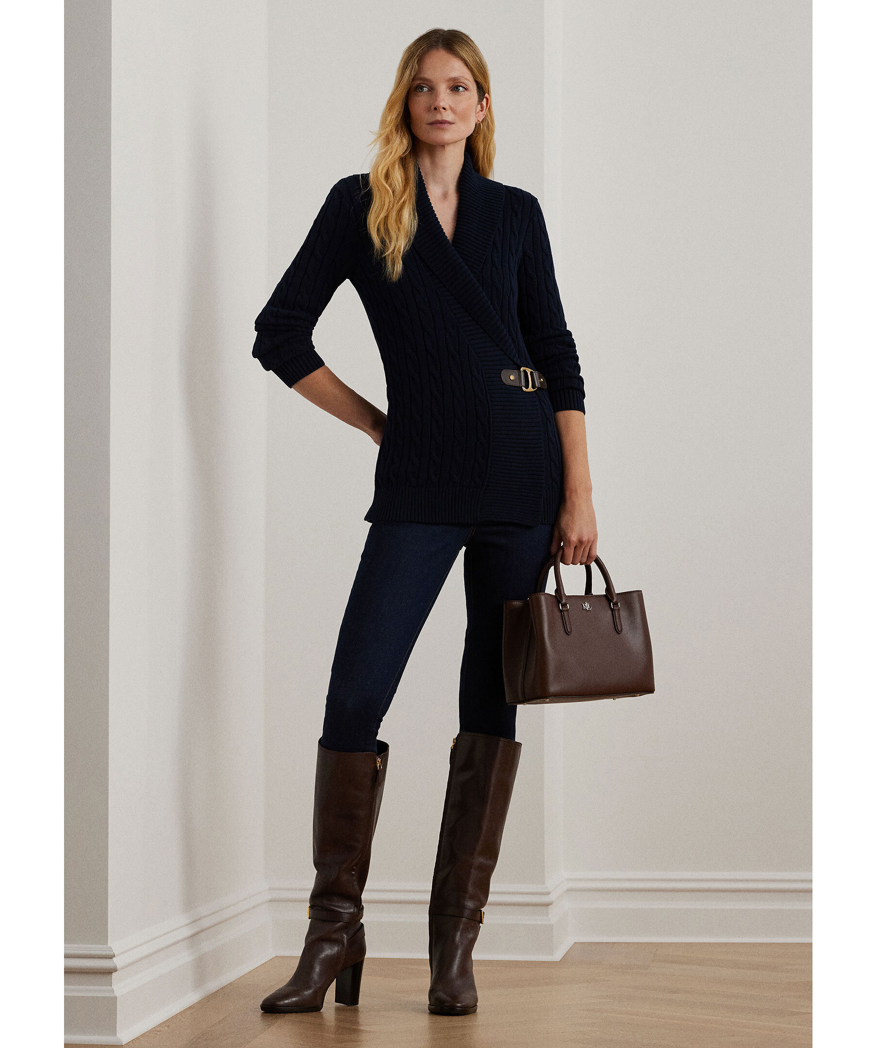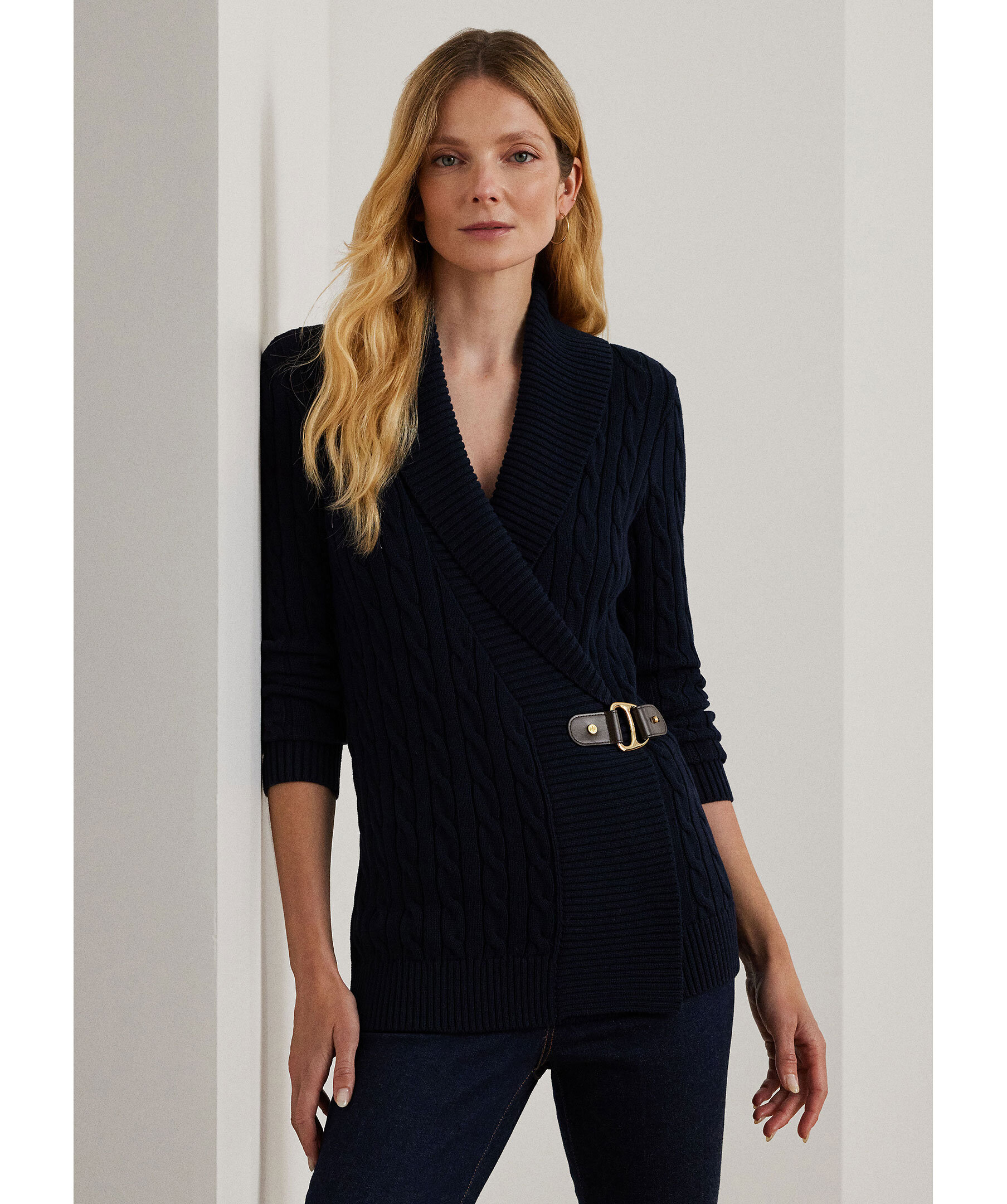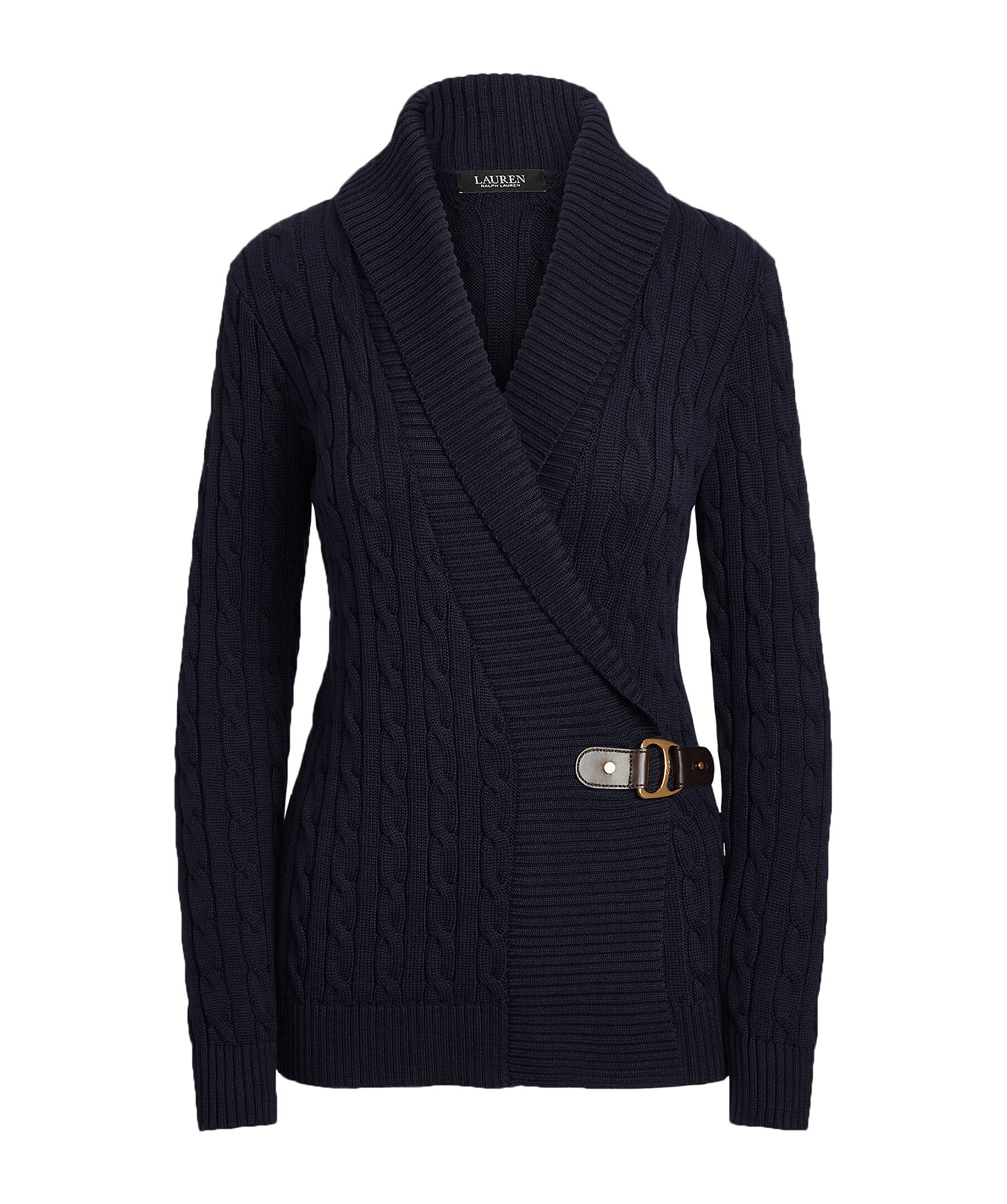 Mörkblå kabelstickad cardigan från Lauren Ralph Lauren. Gjord i mjuk bomull och har en avslappnad passform och slutar vid höften. Ribbstickad krage och mudd vid ärm och plaggslut. Bältspänne vid plaggets mitt.