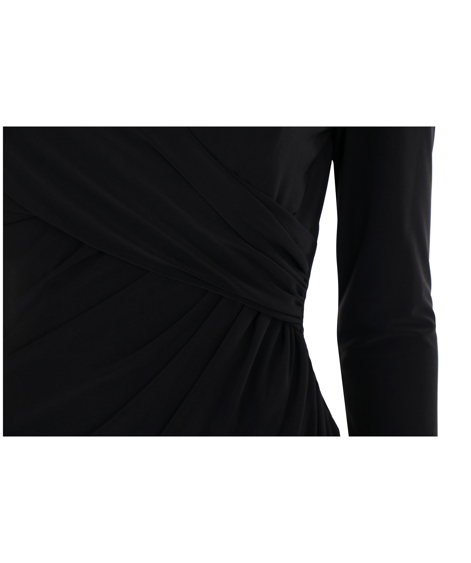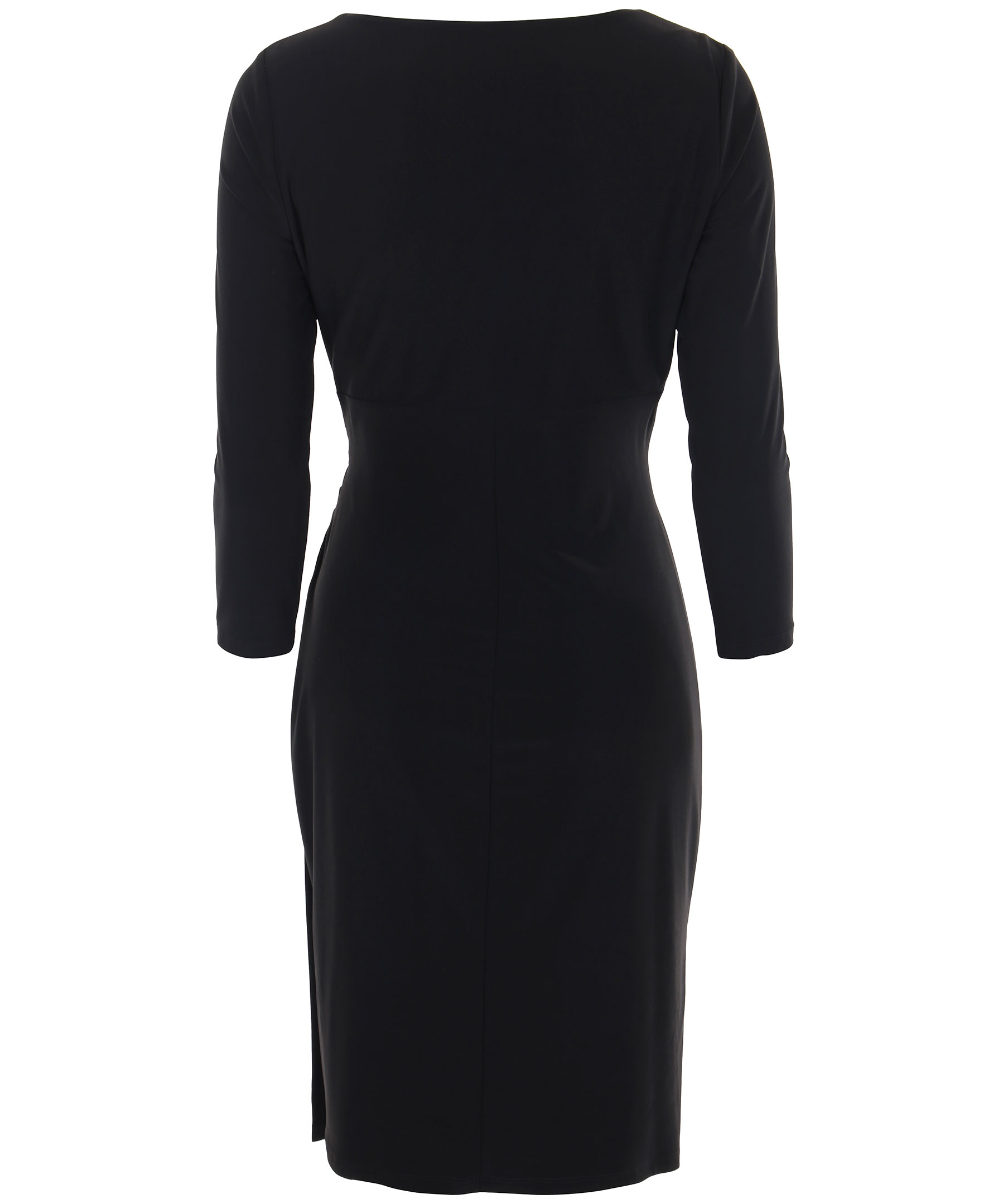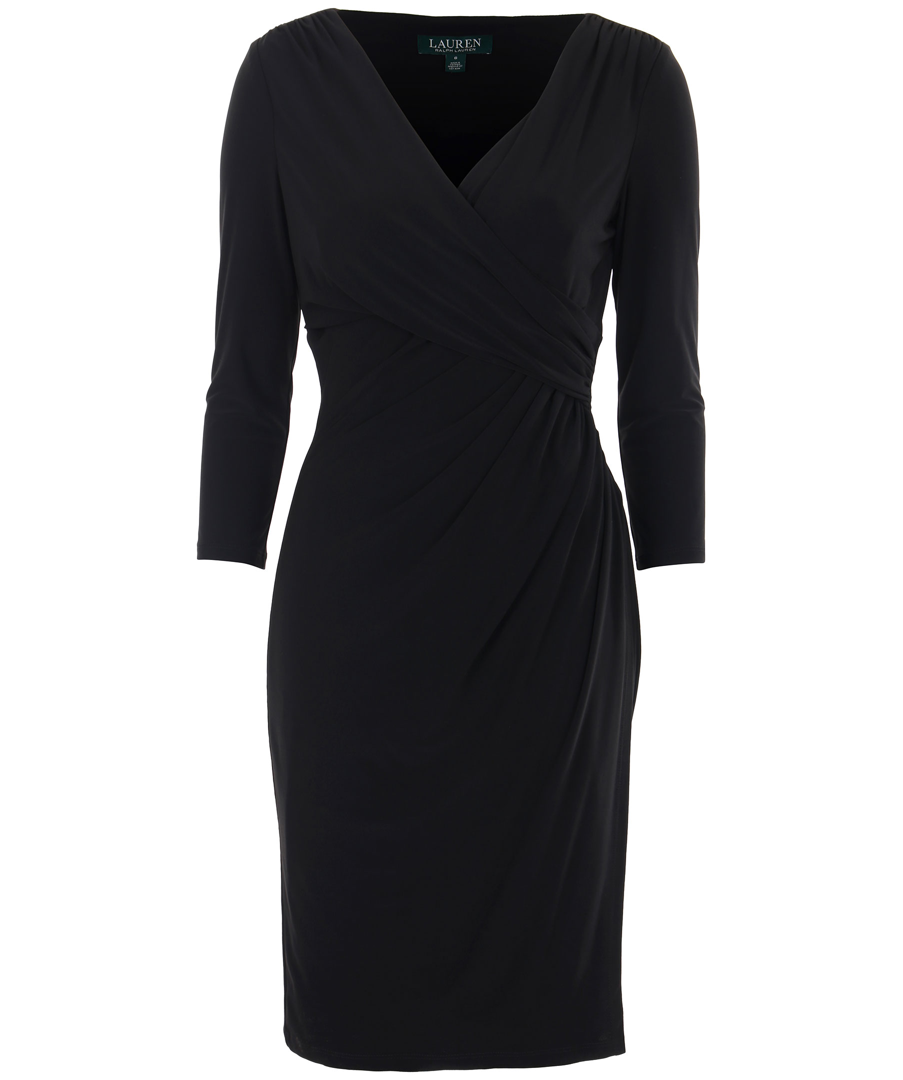 Svart klänning från Lauren Ralph Lauren. V-ringad hals, trekvartsärmar, stretchigt material och stilig drapering framtill. Kroppsnära och mellan lång längd.