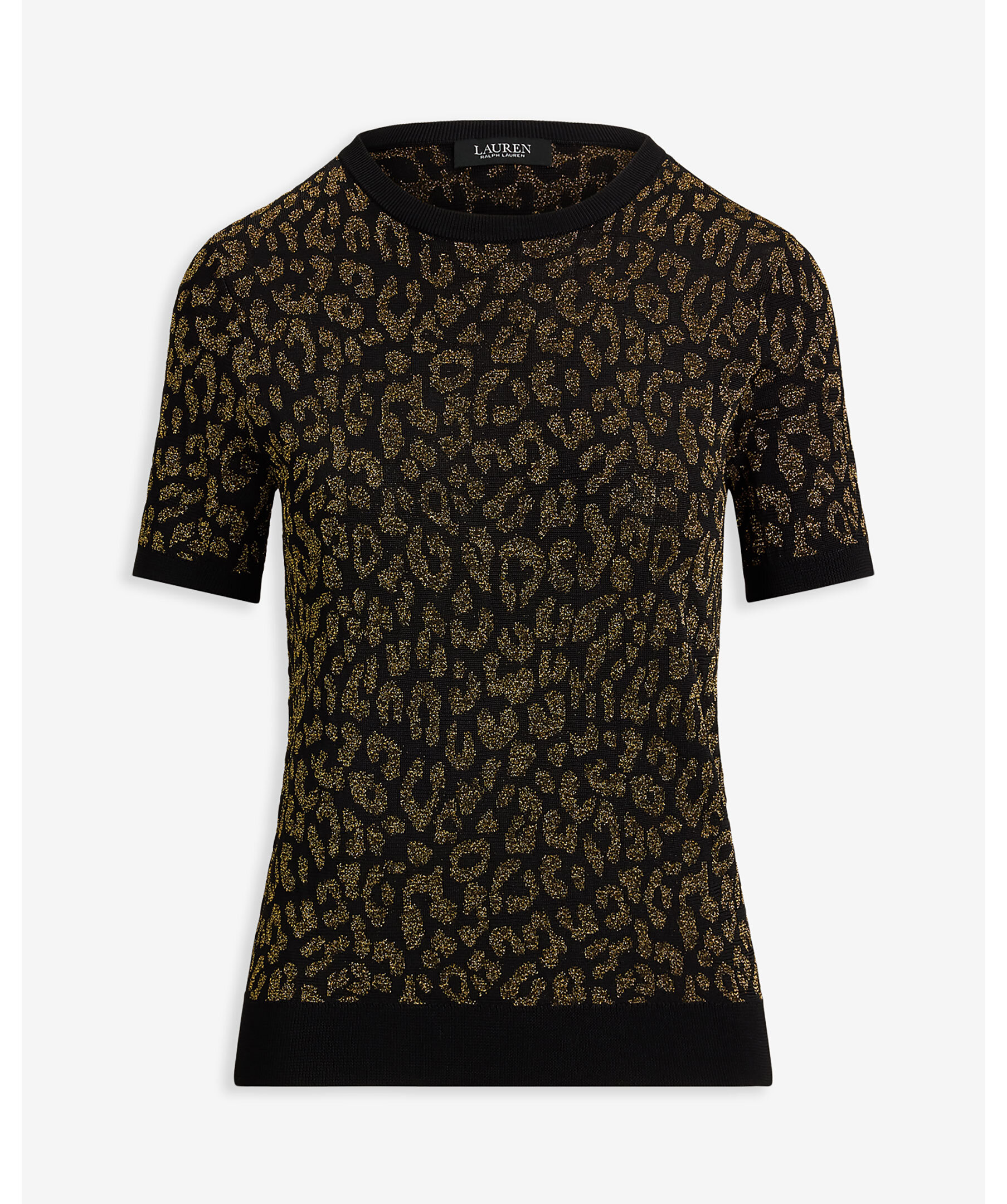 En elegant kortärmad tröja i svart med skimrande “ocelot”-mönster i guldmetallisk ton från Lauren Ralph Lauren. Ribbstickad krage, ärmslut och nederkant ger en sofistikerad finish. Perfekt för att lyfta din outfit med en diskret, glamorös detalj.