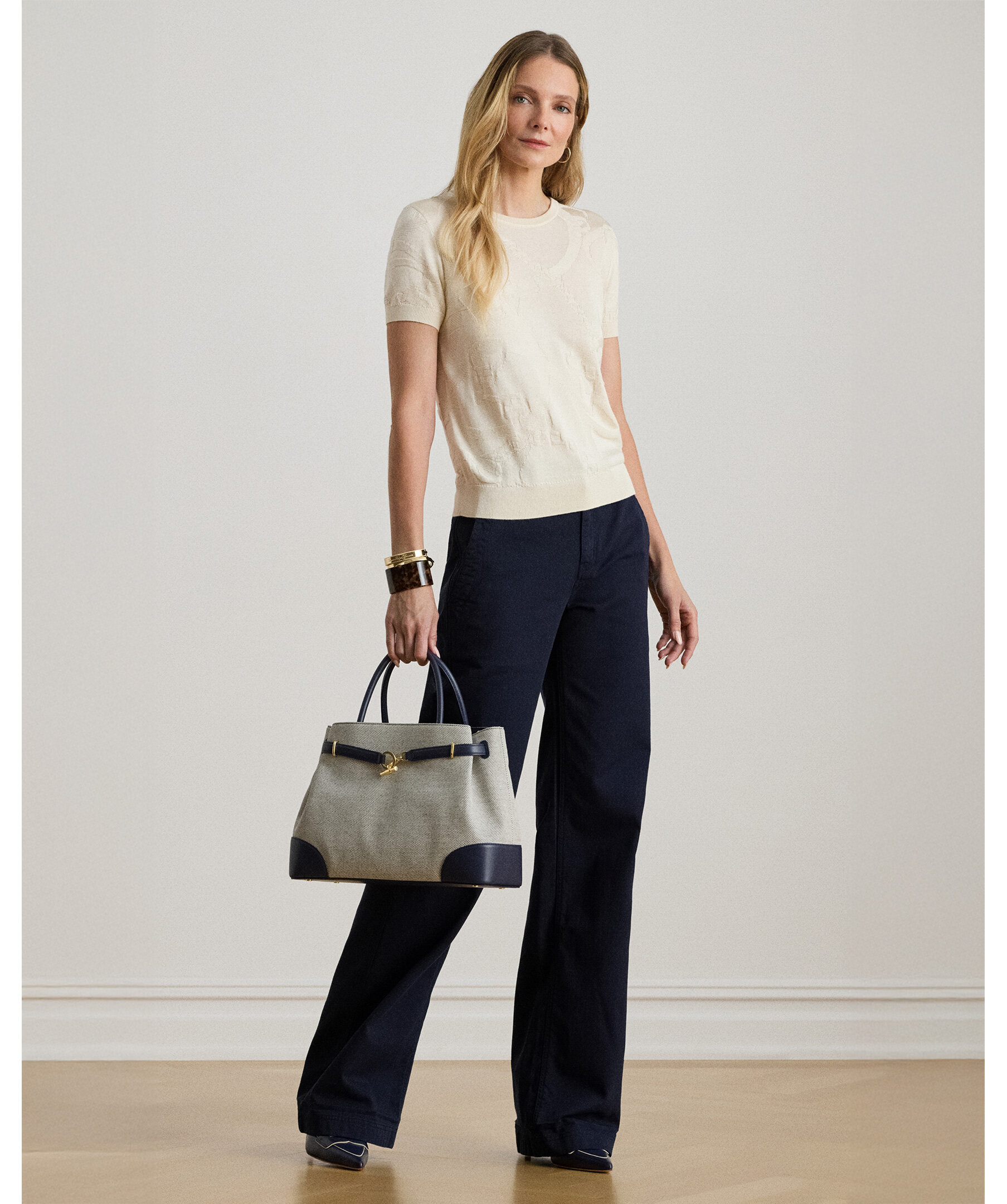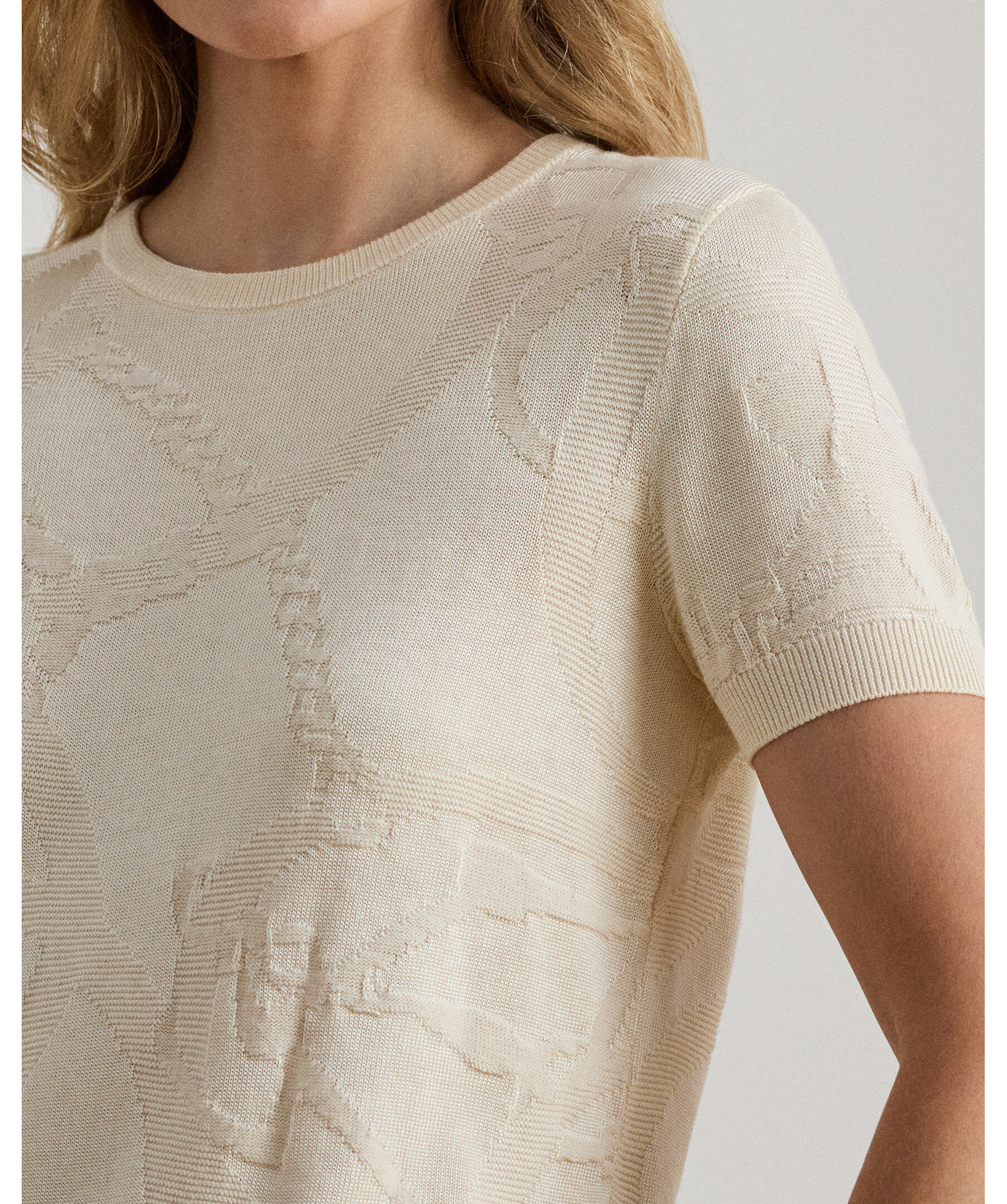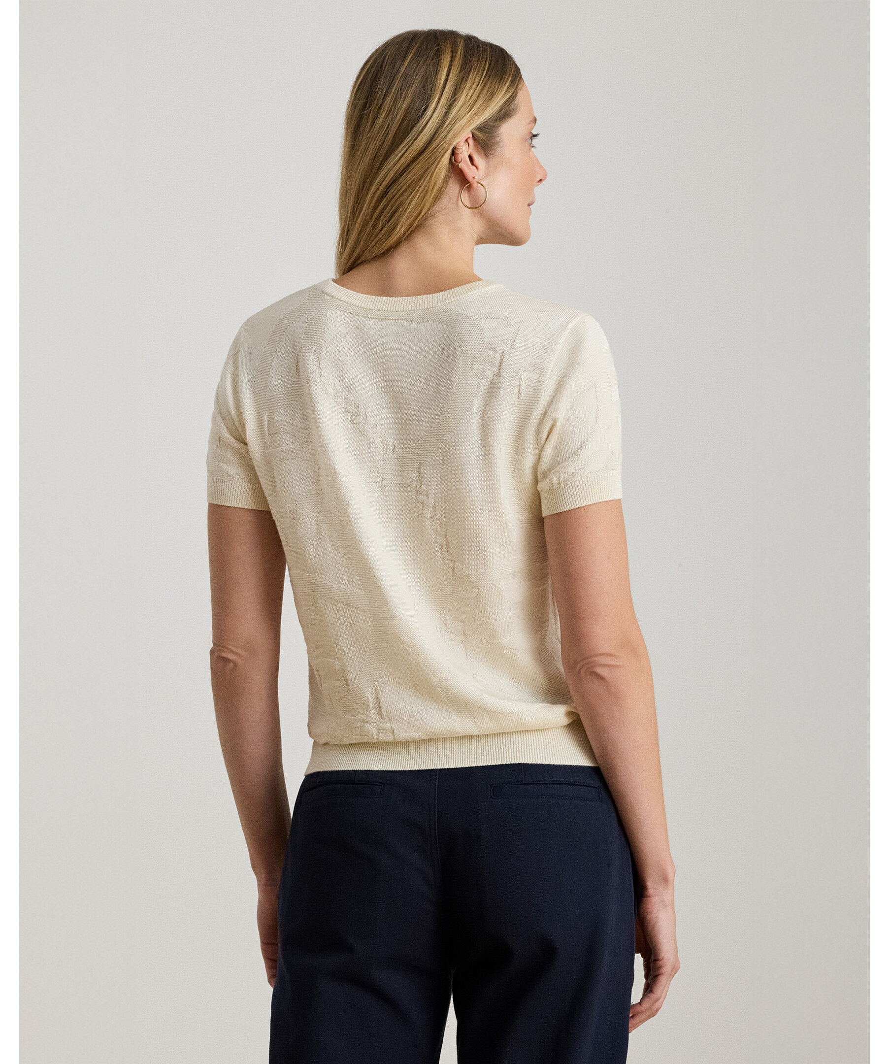 Off-white kortärmad jumper från Lauren Ralph Lauren i en mjuk bomullsblandning med ett subtilt belting-motiv i texturen — en stilfull detalj som hyllar märkets klassiska och ridinspirerade estetik. Tröjan har en rund halsringning och en relaxed fit som faller bekvämt till höften, vilket gör den perfekt för vardags- och övergångslooks tillsammans med jeans, chinos eller kjol.