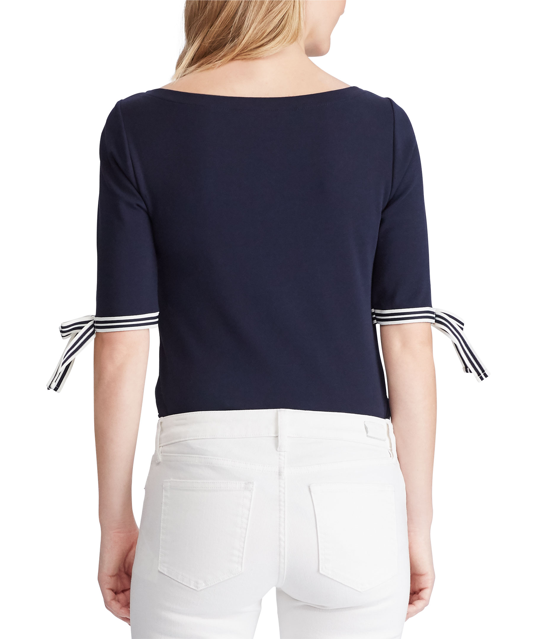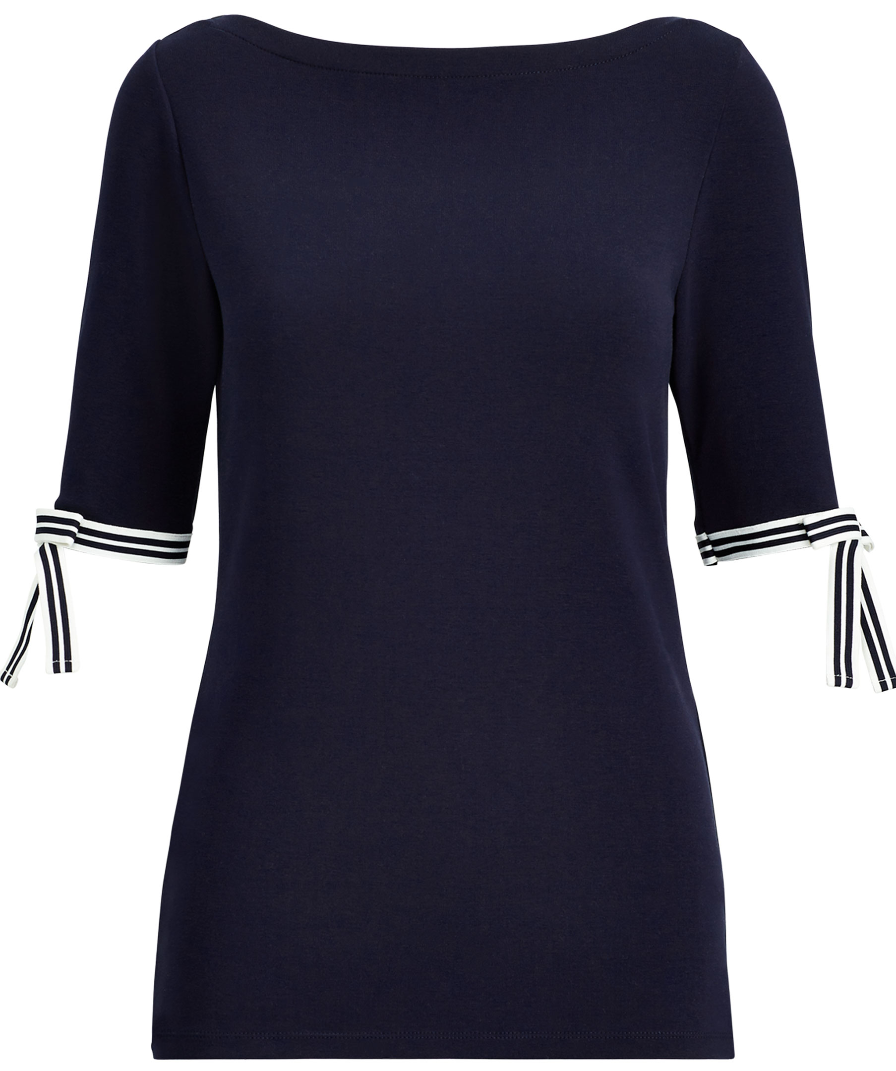 Mörkblå topp Från Lauren Ralph Lauren. Armbågslånga ärmar med knytning i ärmslut. Broderad logotyp i plaggslut. Båthalsad.