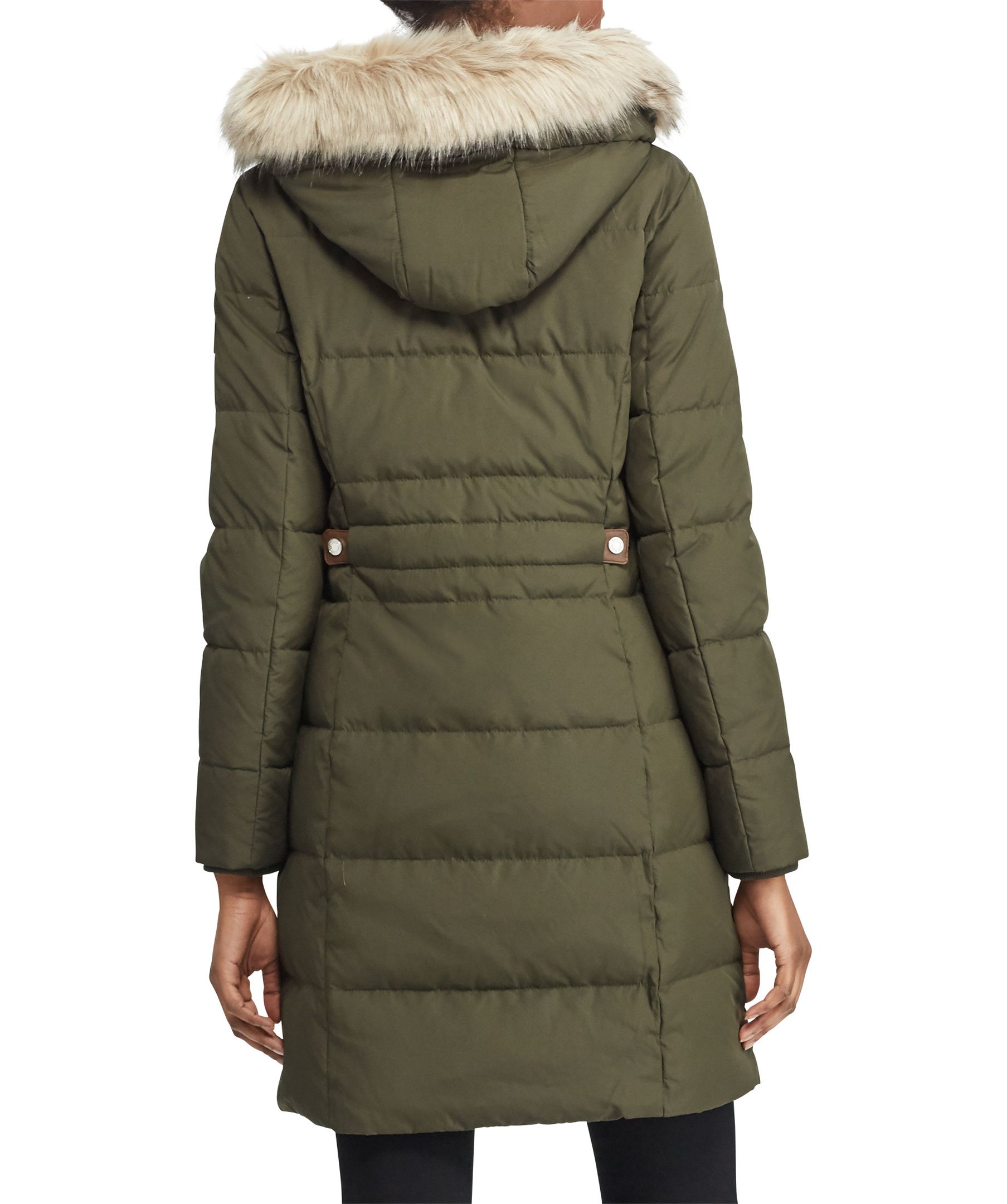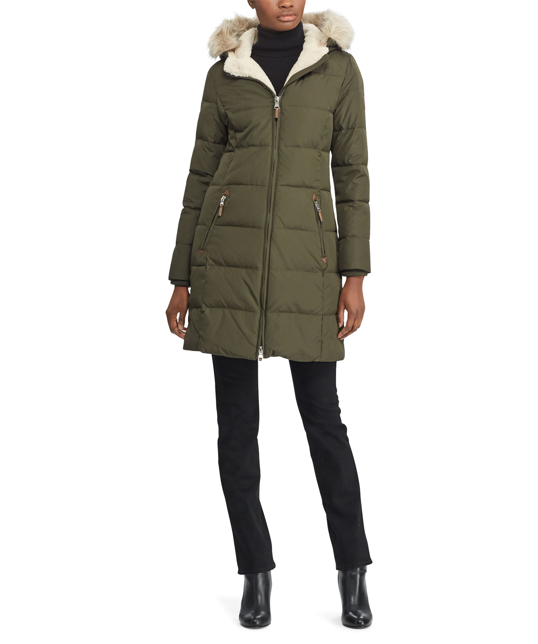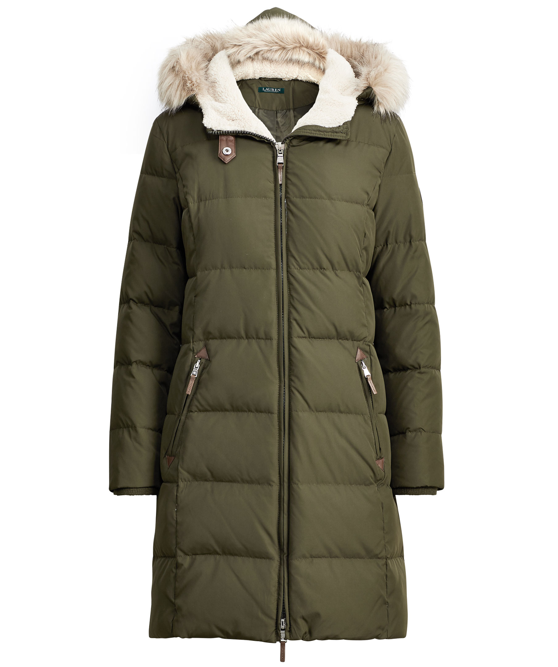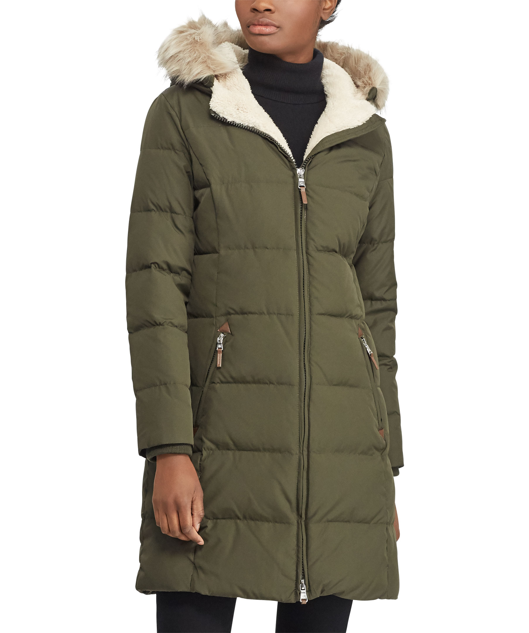 Grön dunjacka med smal passform, från Lauren Ralph Lauren. Tillverkad i polyester och fylld med dun. Sherling detalj och päls i luvan är tillverkad av syntetiskt material.
