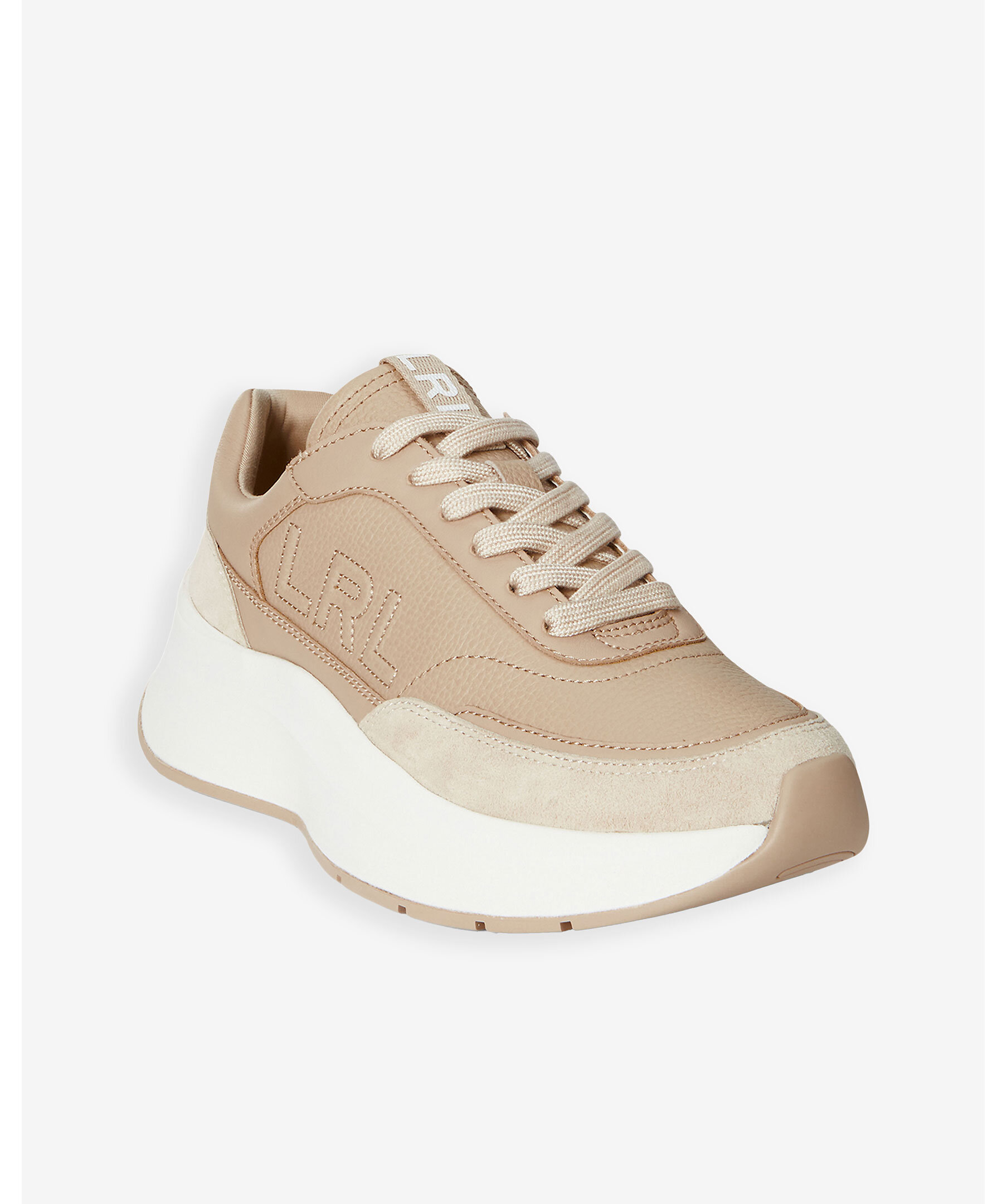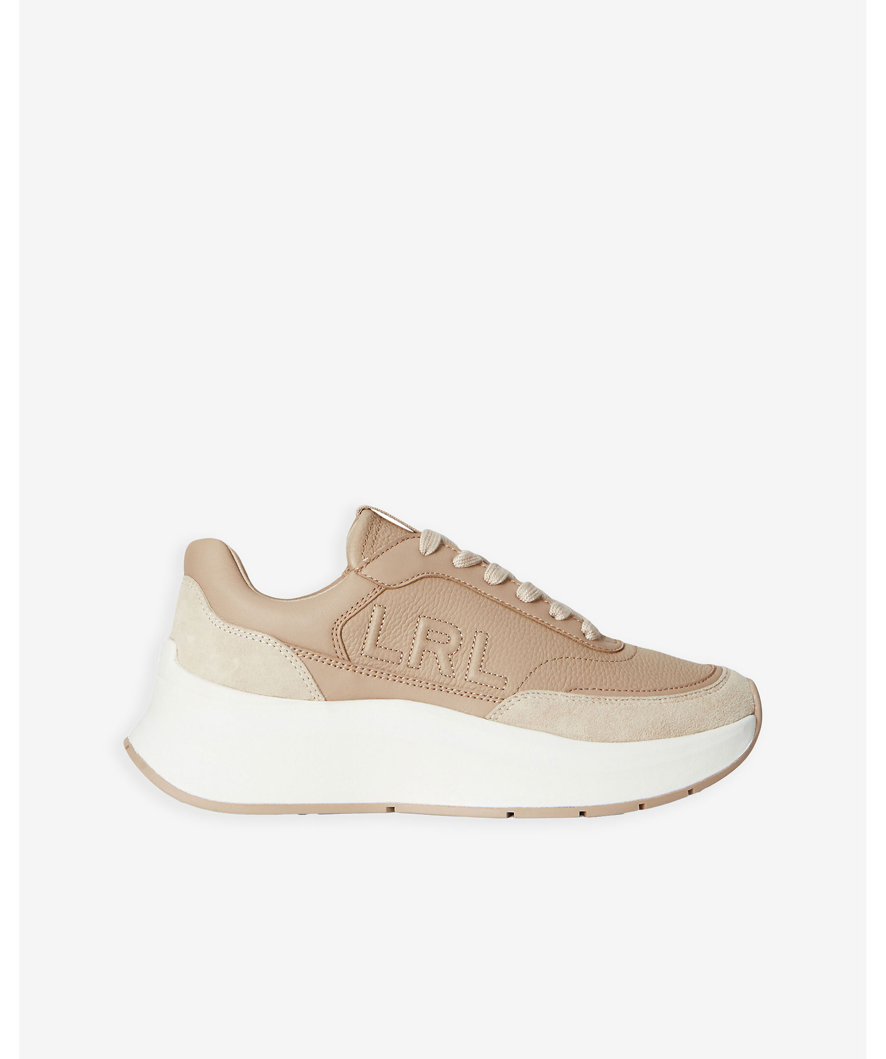Sneakers i läder från Lauren Ralph Lauren. Skon har mocka detaljer i en ljusare nyans. Chunky EVA-mellansula som ger lätt stötdämpning. Den räfflade skumsulan är särskilt utformad för att fördela vikten jämnt och maximera komforten vid varje steg med en höjd på 4,5cm. Upphöjd logotyp på sidan.