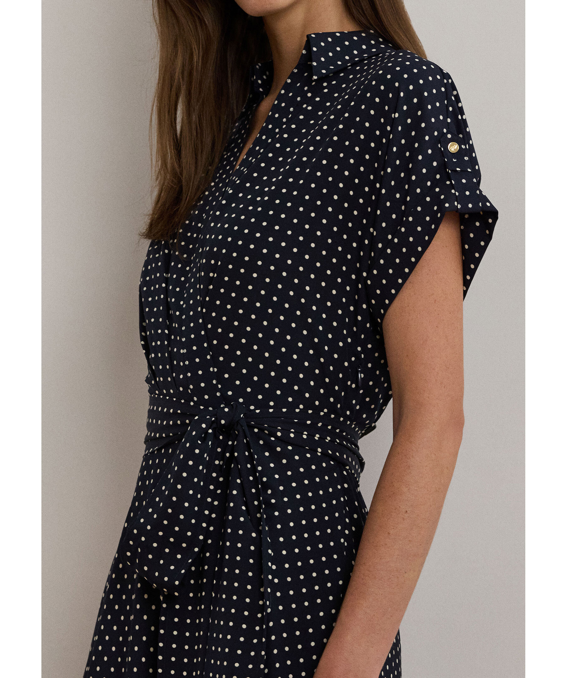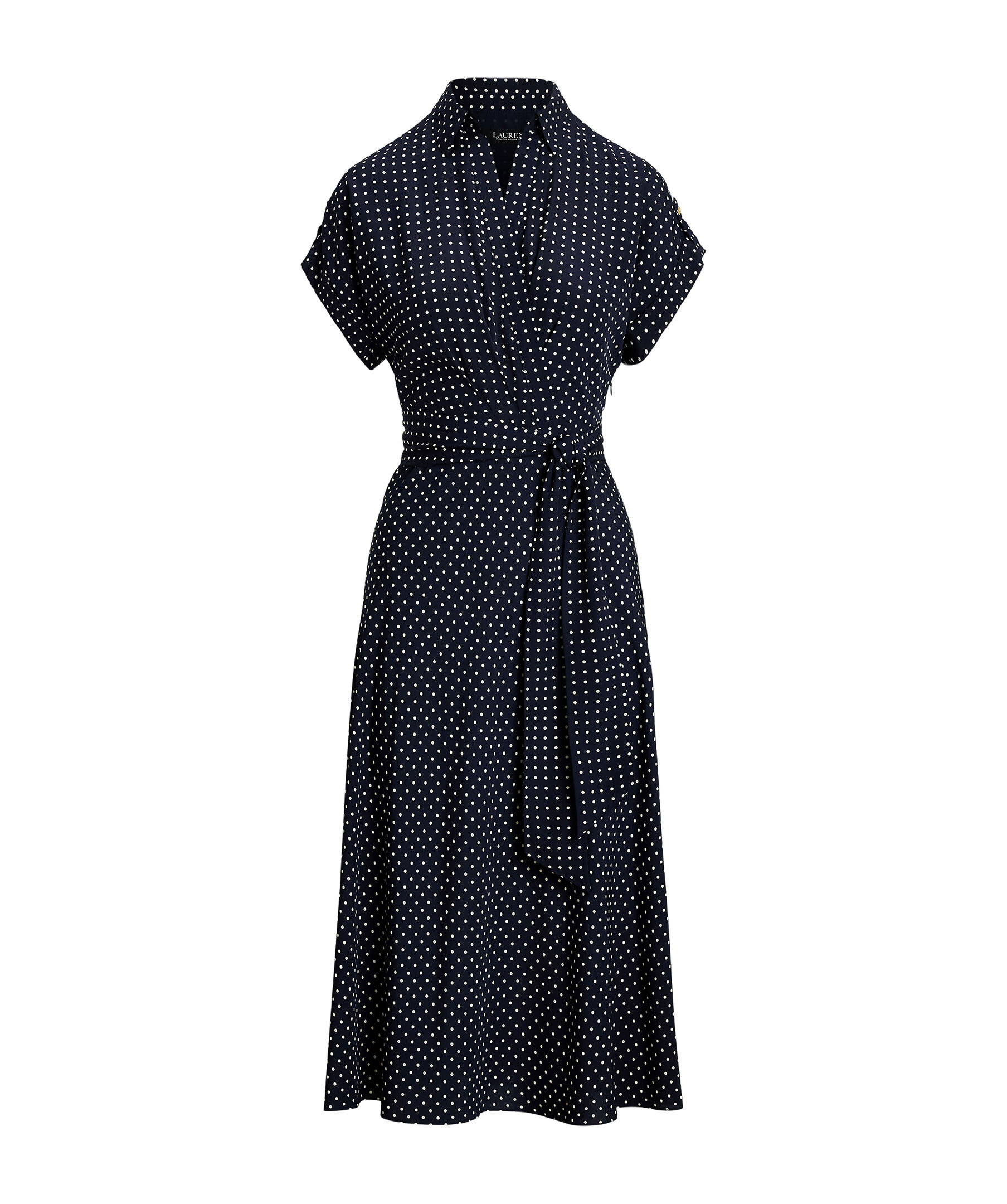 Mörkblå klänning med vita prickar från Lauren Ralph Lauren. Klänningen är av den längre modellen, en V-ringning som går omlott och avslutas med att knytas vid midjan. Krage och avslappnade axlar med knapp. Nederdelen har en avslappnad passform. Tillverkad av polyester.