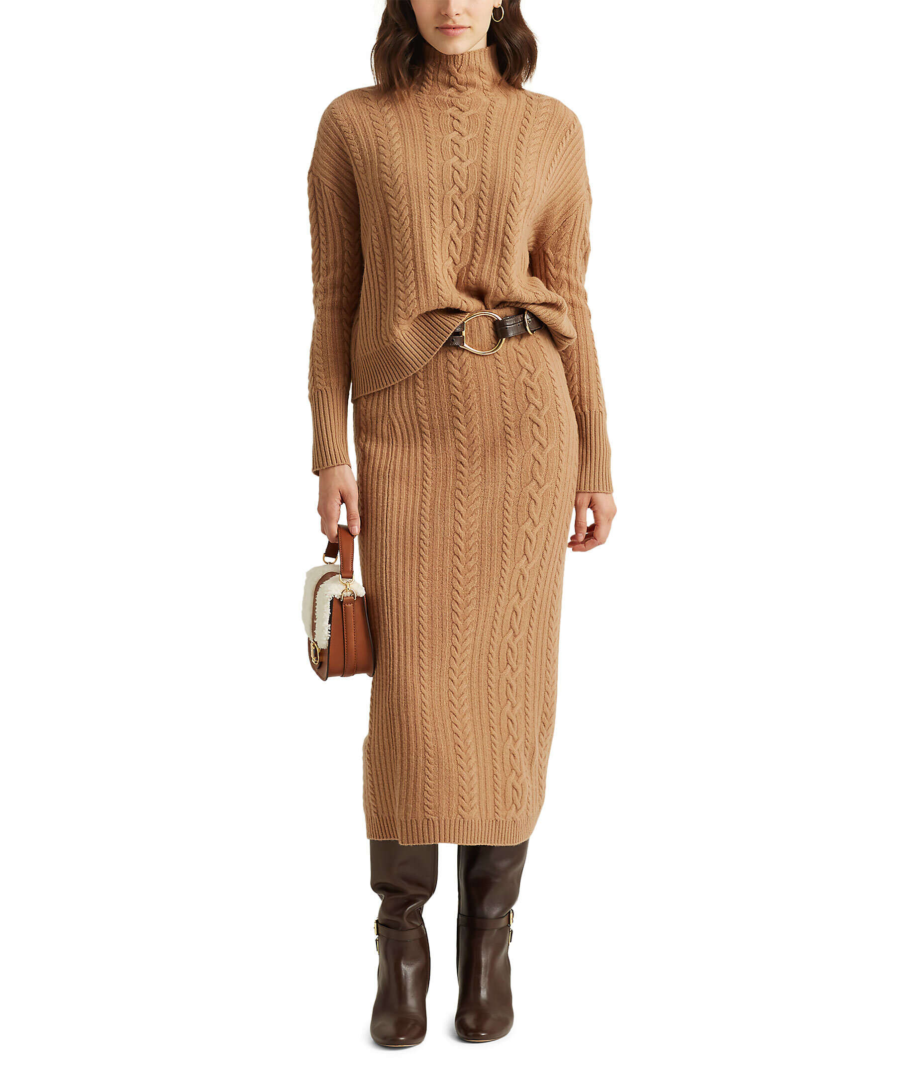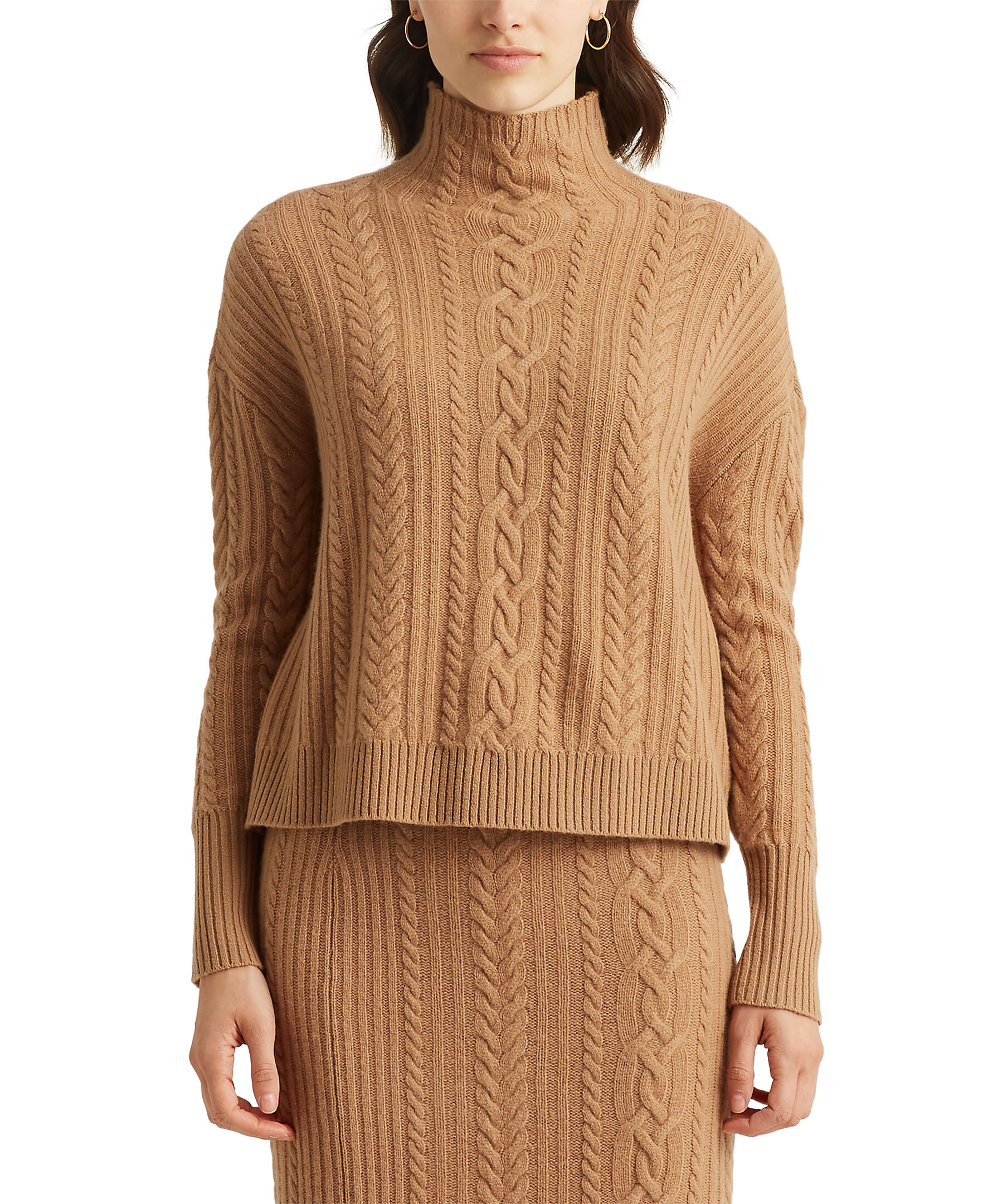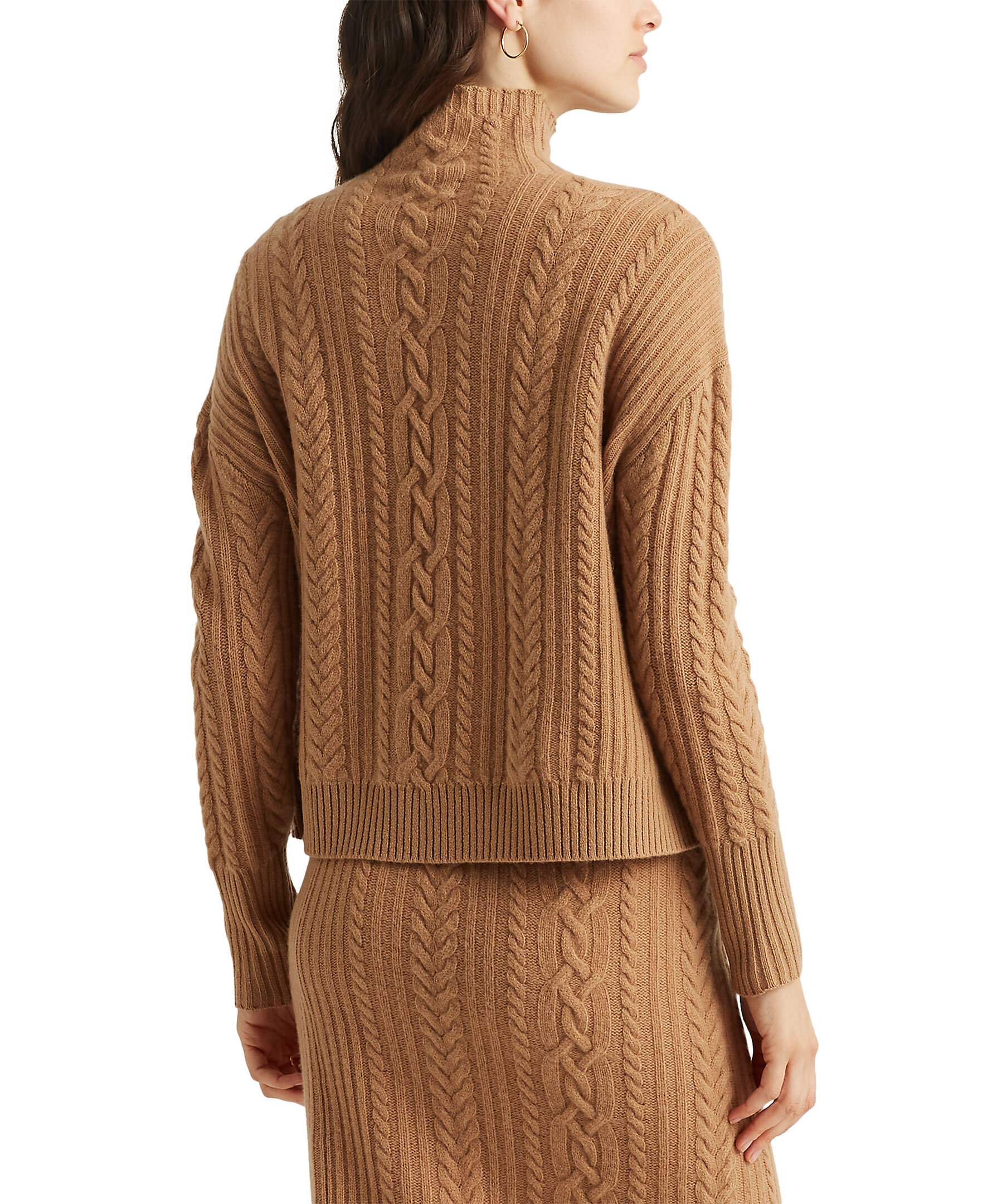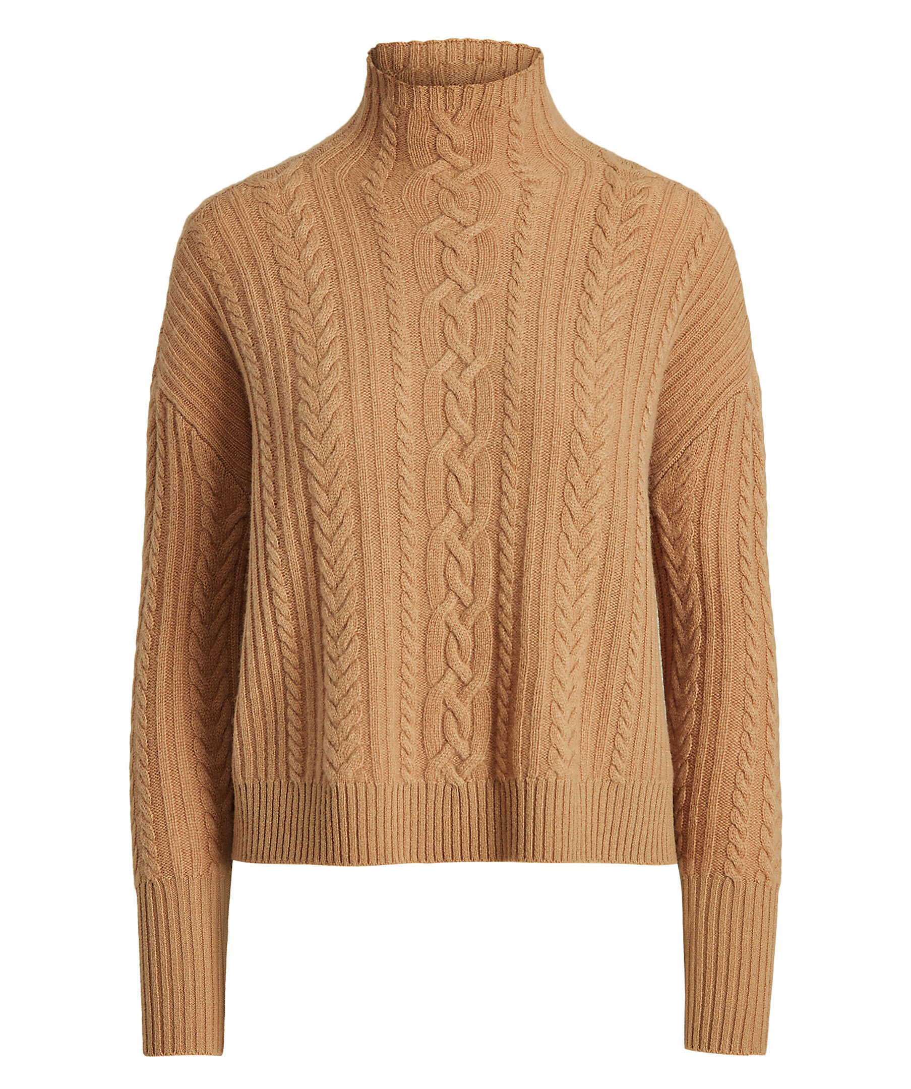 Kamel färgad kabelstickad polotröja från Lauren Ralph Lauren. tillverkad i Ull och Kashmir blandning. Ribbstickade muddar i ärmslut och tröjslut.