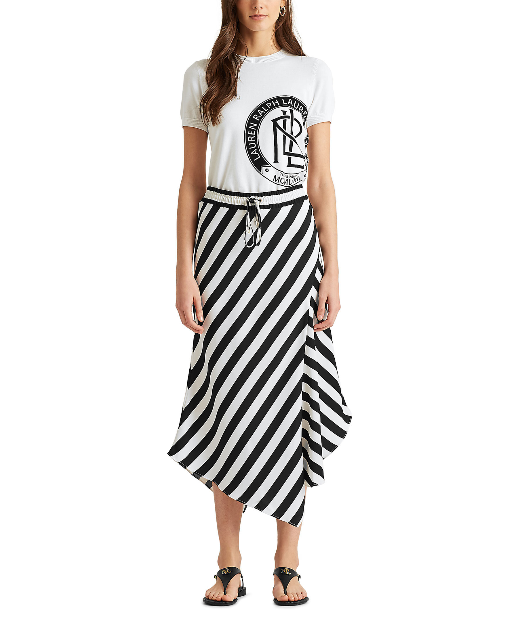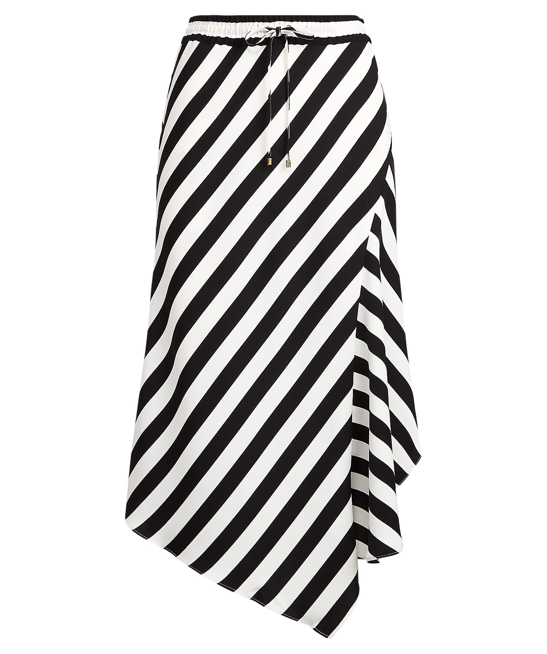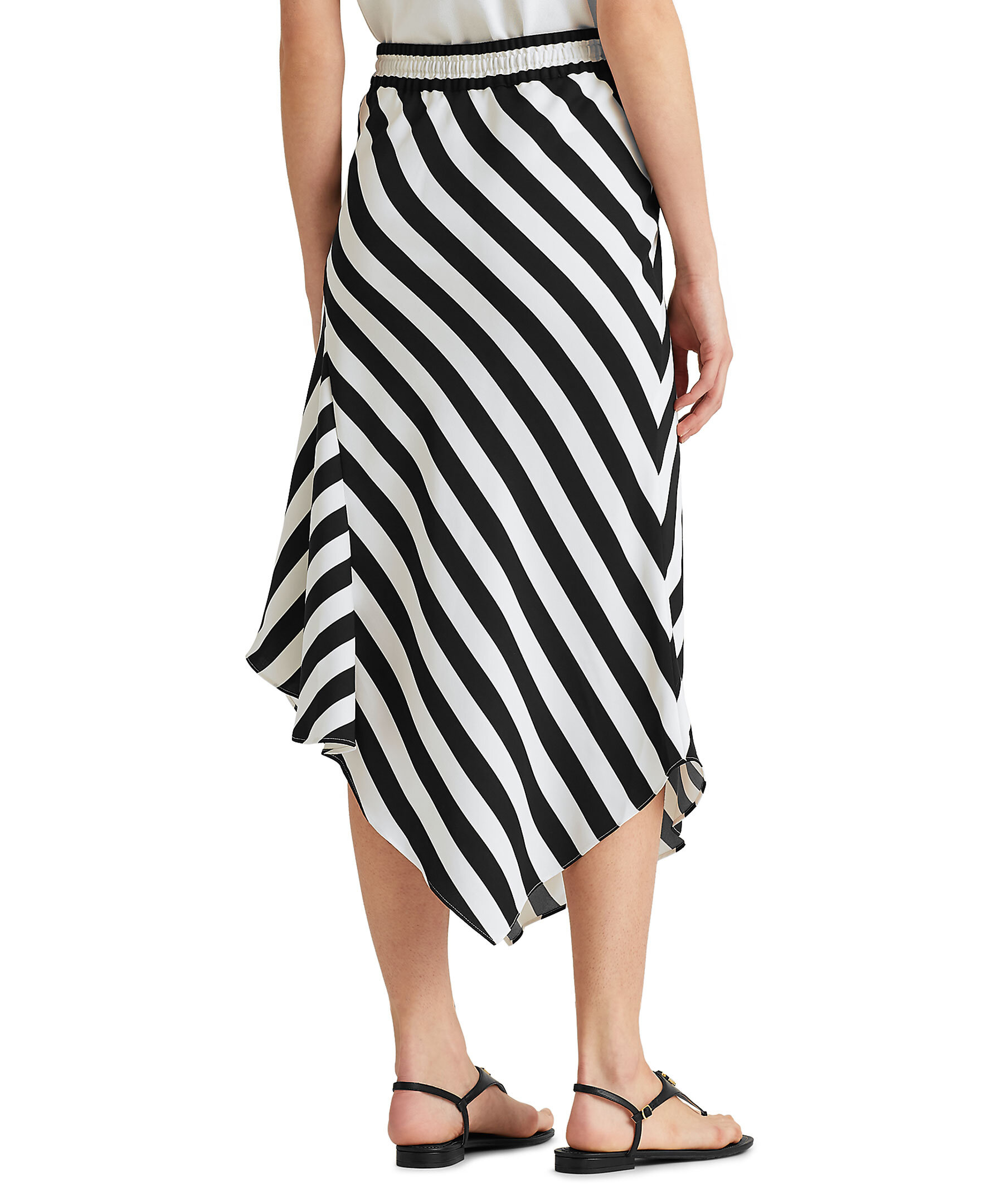 Svart och vit randig asymmetrisk kjol från Lauren Ralph Lauren. Kjolen är gjord i ett tunt polyestertyg. Elastiskt band med snörning i midjan. Spetsigaste delen av kjolen slutar nedanför vaden.