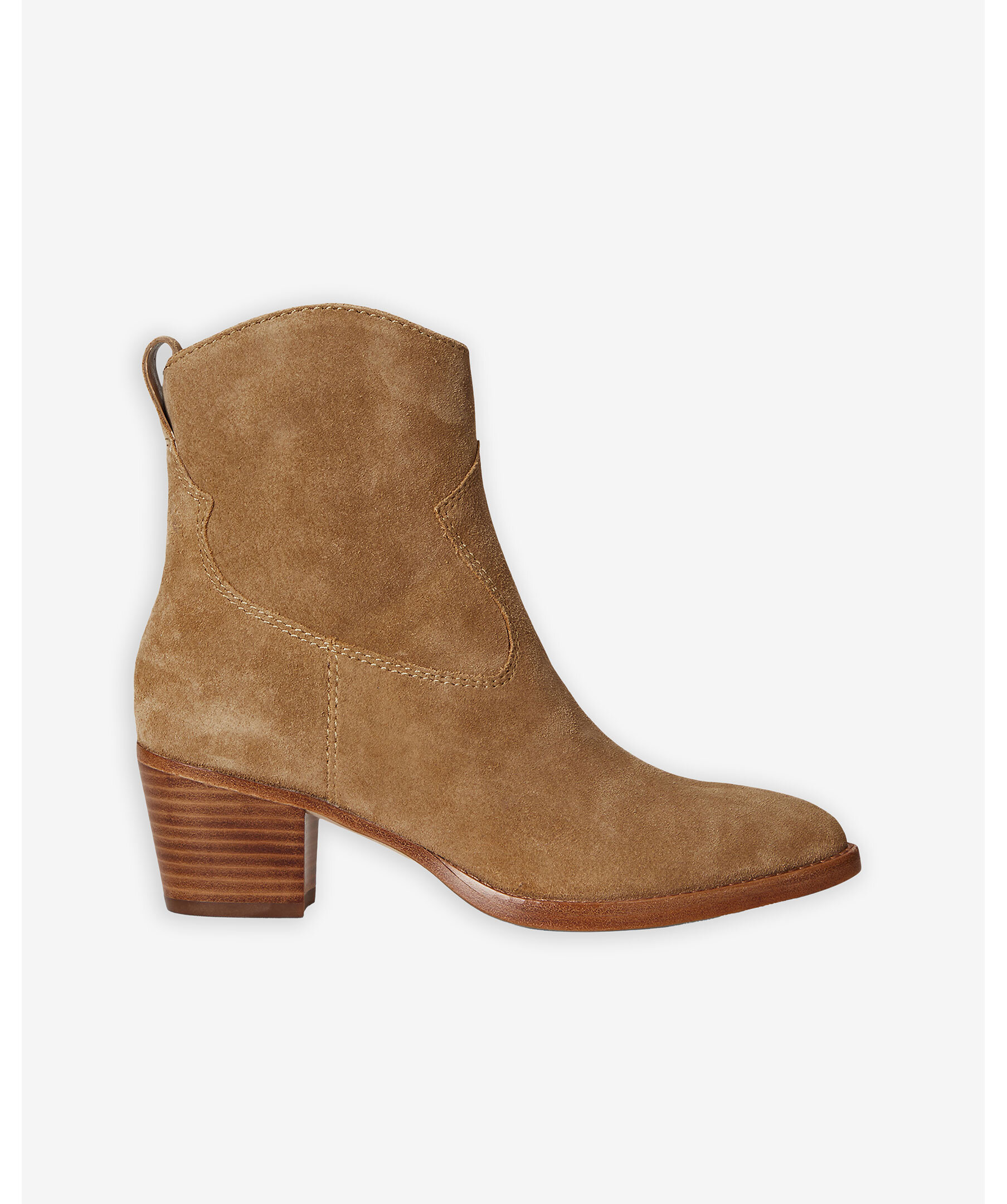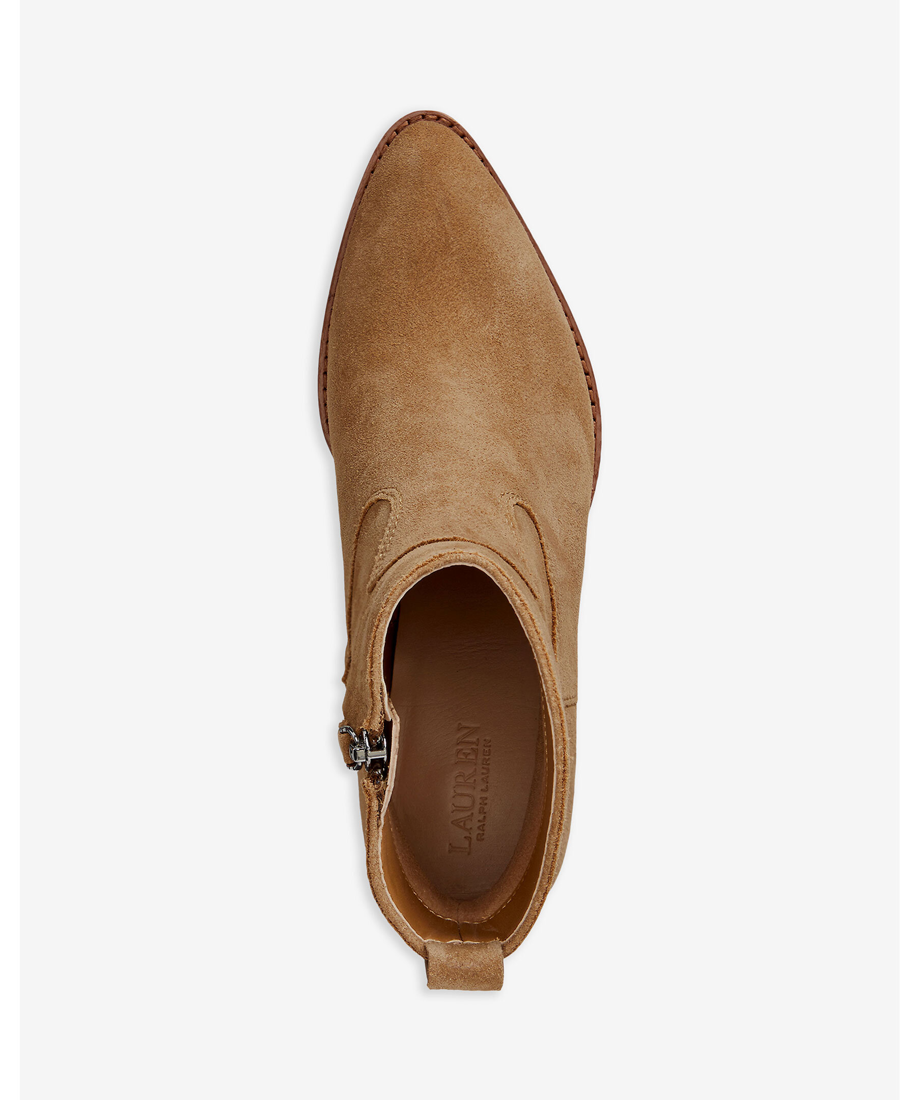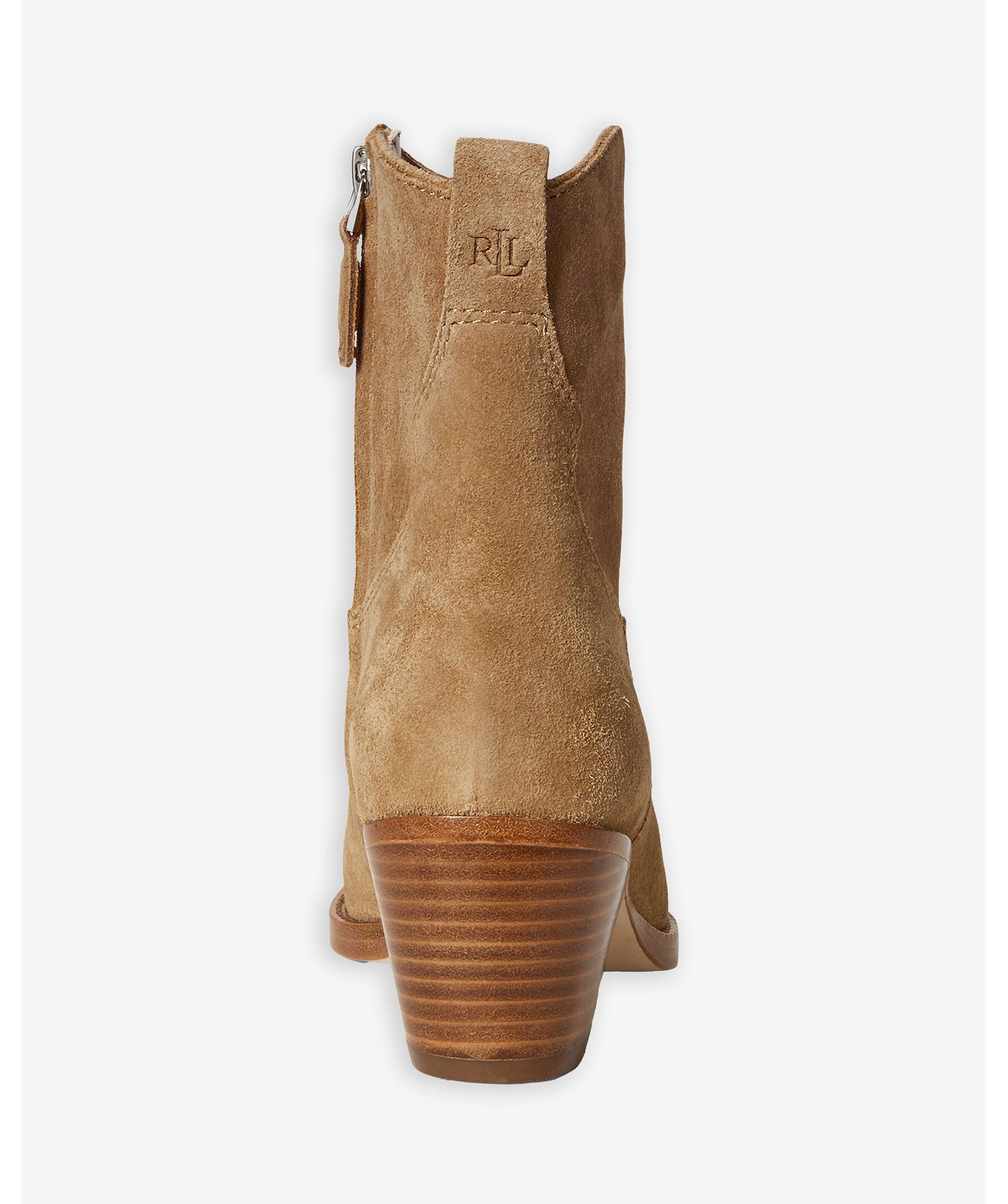 Kamelfärgade, western inspirerade boots i mocka från Lauren Ralph Lauren. Spetsig tå och en 4,5cm hög klack. Stängs med dragkedja på sidan.
