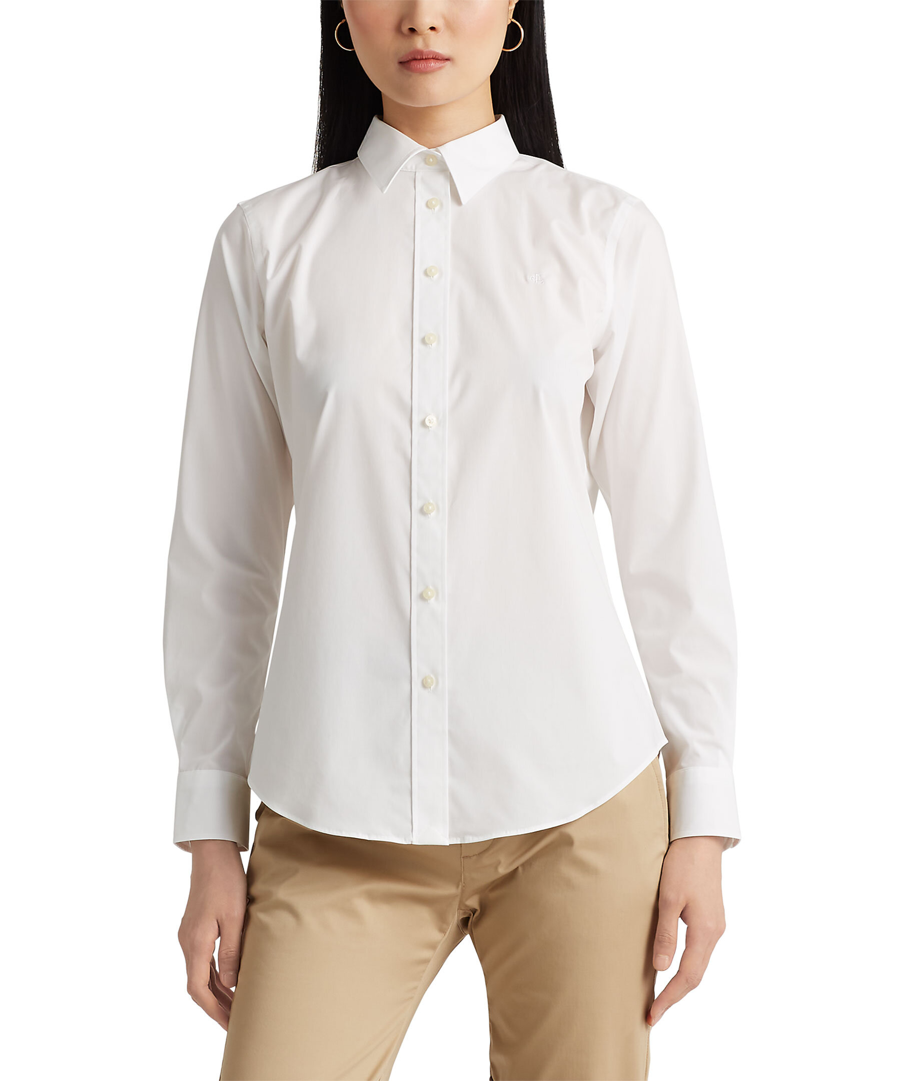 Vit skjorta från Lauren Ralph Lauren. Tillverkad av ett tyg som är speciellt behandlat för att motstå rynkor, kommer denna skjorta att behålla sitt krispiga utseende från torktumlaren hela vägen till din middagsbokning. Rak passform. Designad för att slå i höften. Button down krage. Långa ärmar med manschetter med knäppning. Skjortsvansfåll. Bakre ok. Signatur "LRL" monogram broderat på vänster bröst.