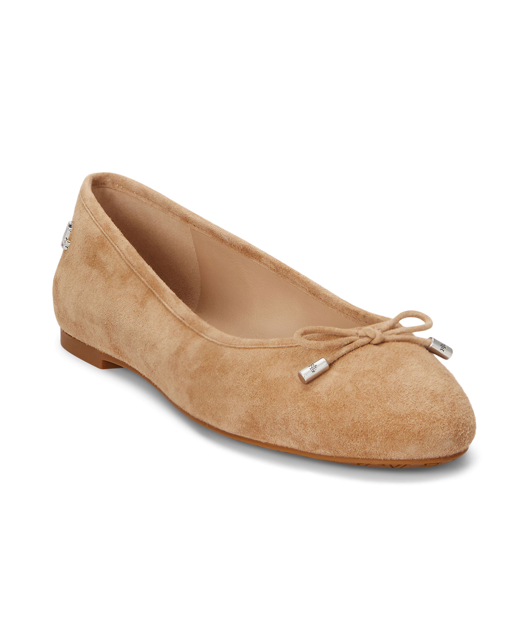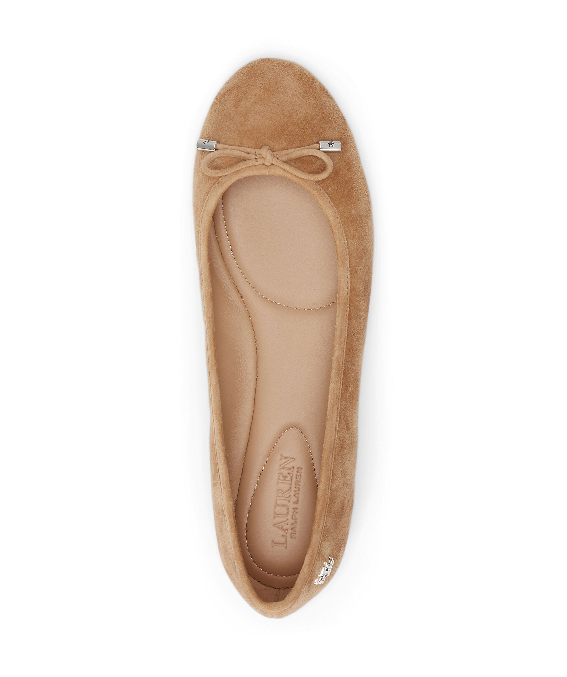 Kamelfärgade ballerinaskor från Lauren Ralph Lauren. Skorna är gjorda i mockaläder och har en liten rosett framtill samt en logotyp i metall vid hälen.