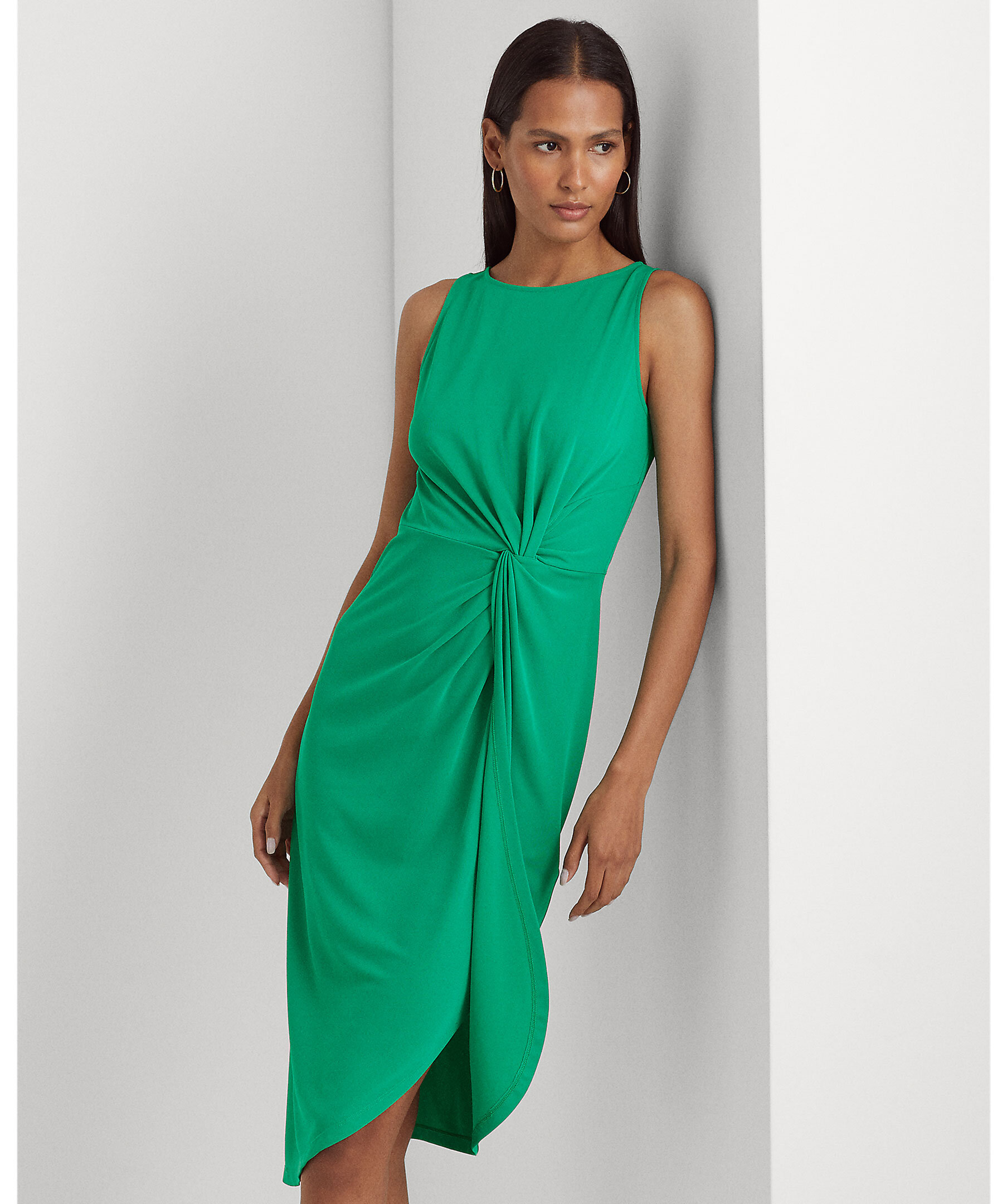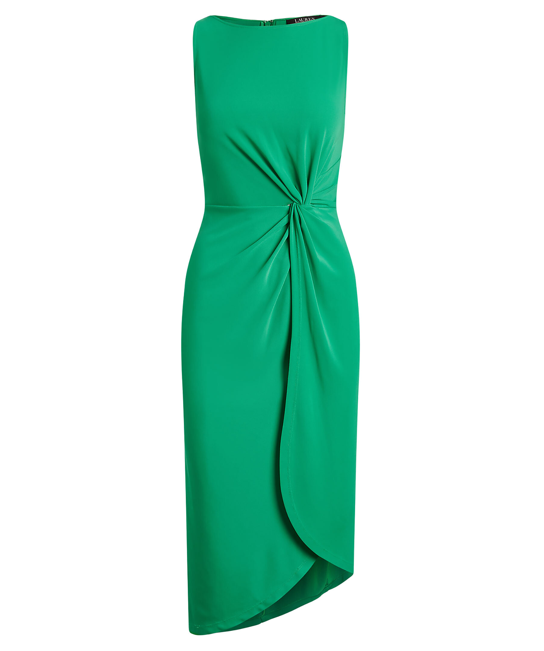 Grön klänning från Lauren Ralph Lauren. Båtringning. Dekorativ knut framtill på klänningen. Snedskuren kjol med omlottmodell. Dragkedja i ryggen.