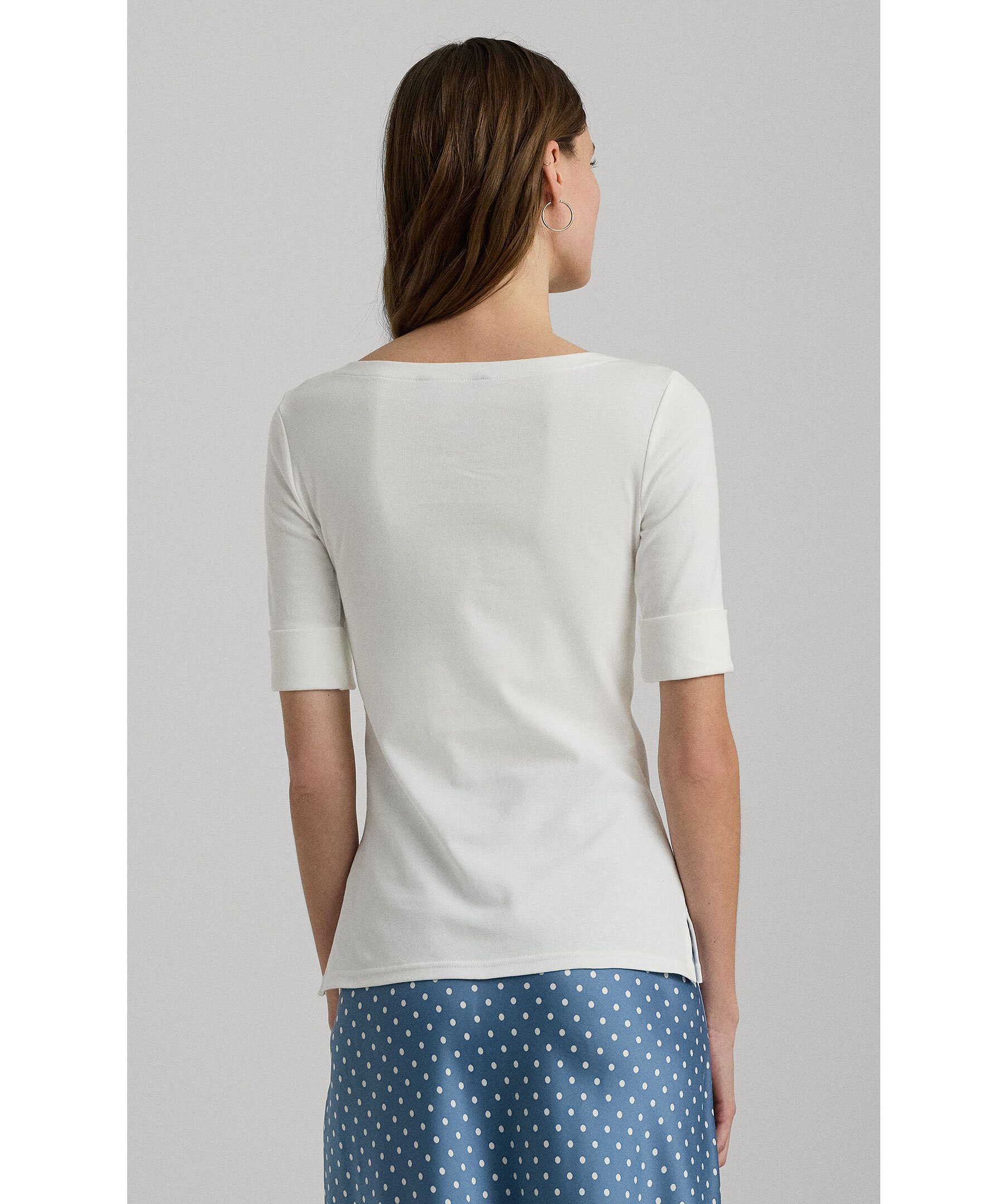 Vit topp i tidlös design tillverkad i bomull med stretch för extra komfort. Halvlånga ärmar med uppvikta kanter och en diskret "LRL" monogramdetalj på fållen som ger en sofistikerad touch.