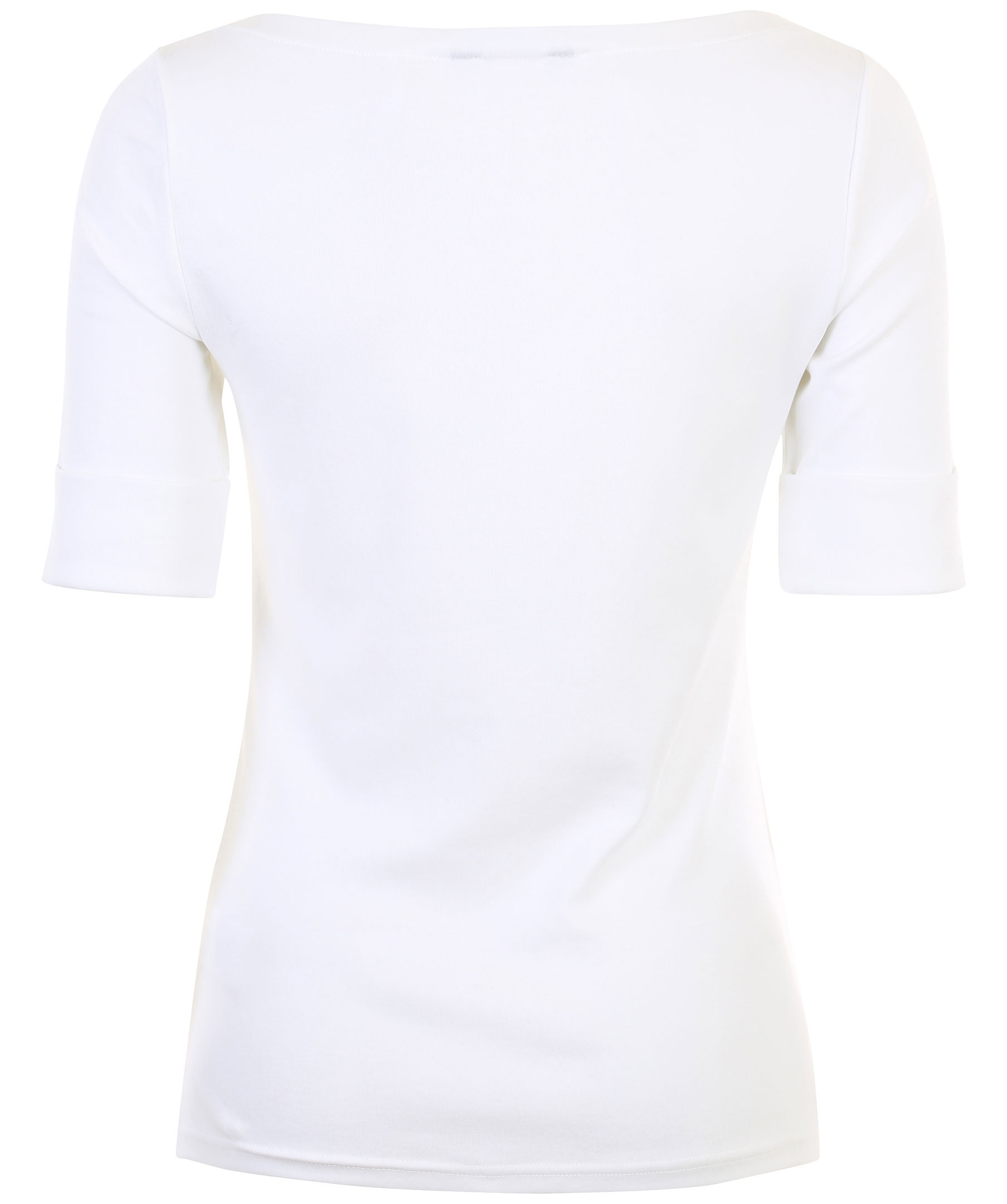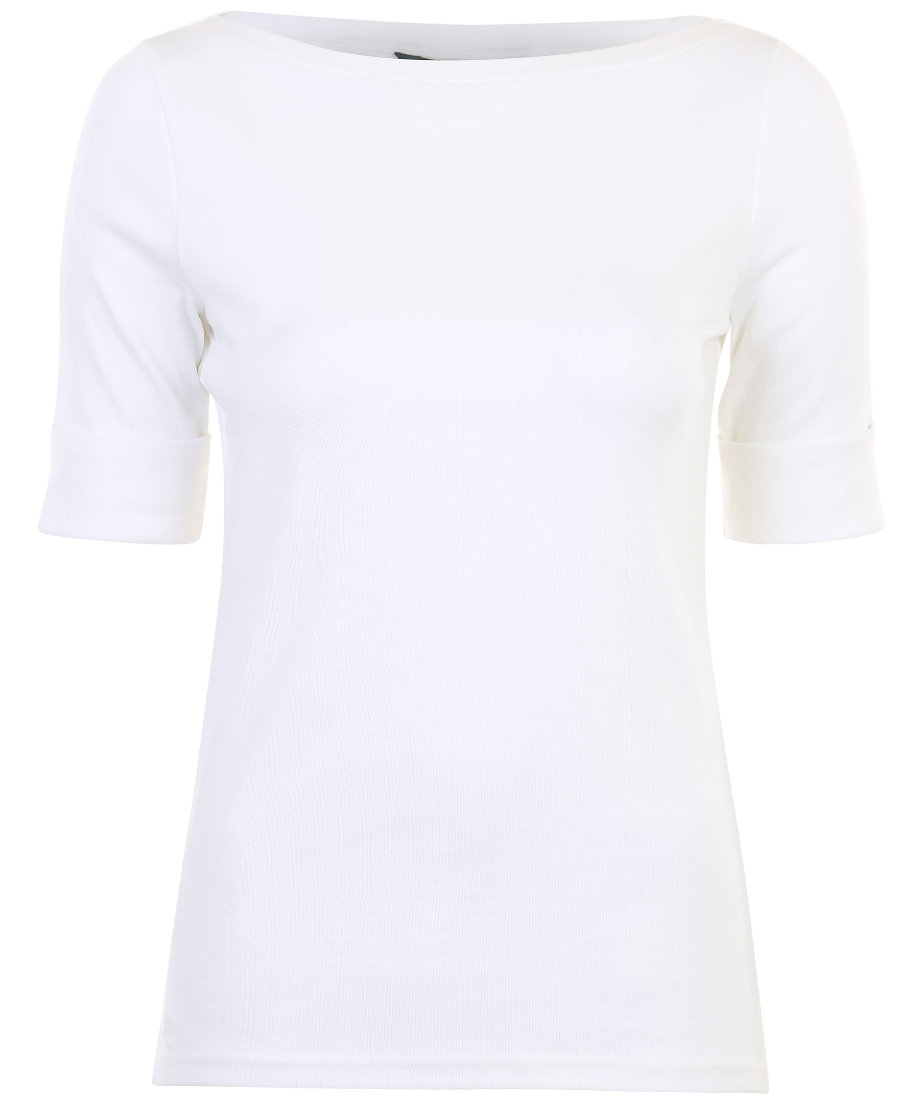 Vit bomulls t-shirt från Lauren Ralph Lauren. Ärmar i trekvartslängd med uppvikt manschett. Båthals, liten slits i sidorna samt broderad logotyp i plaggslut.