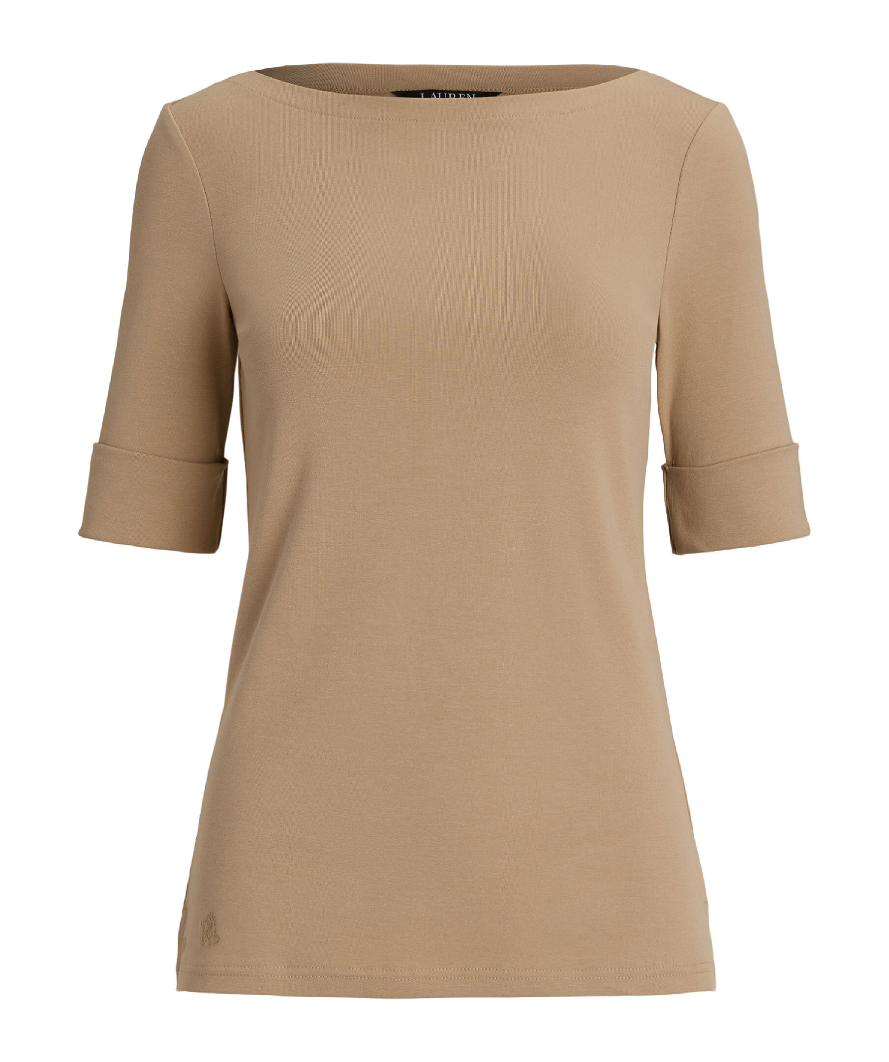 Beige tröja från Lauren Ralph Lauren. Båtringning. Korta slitsar i sidorna. Tillverkad i bomullsblandning. Trekvartsärmar med uppvikt kant. Diskret broderad logotyp vid plaggslut på höger sida.