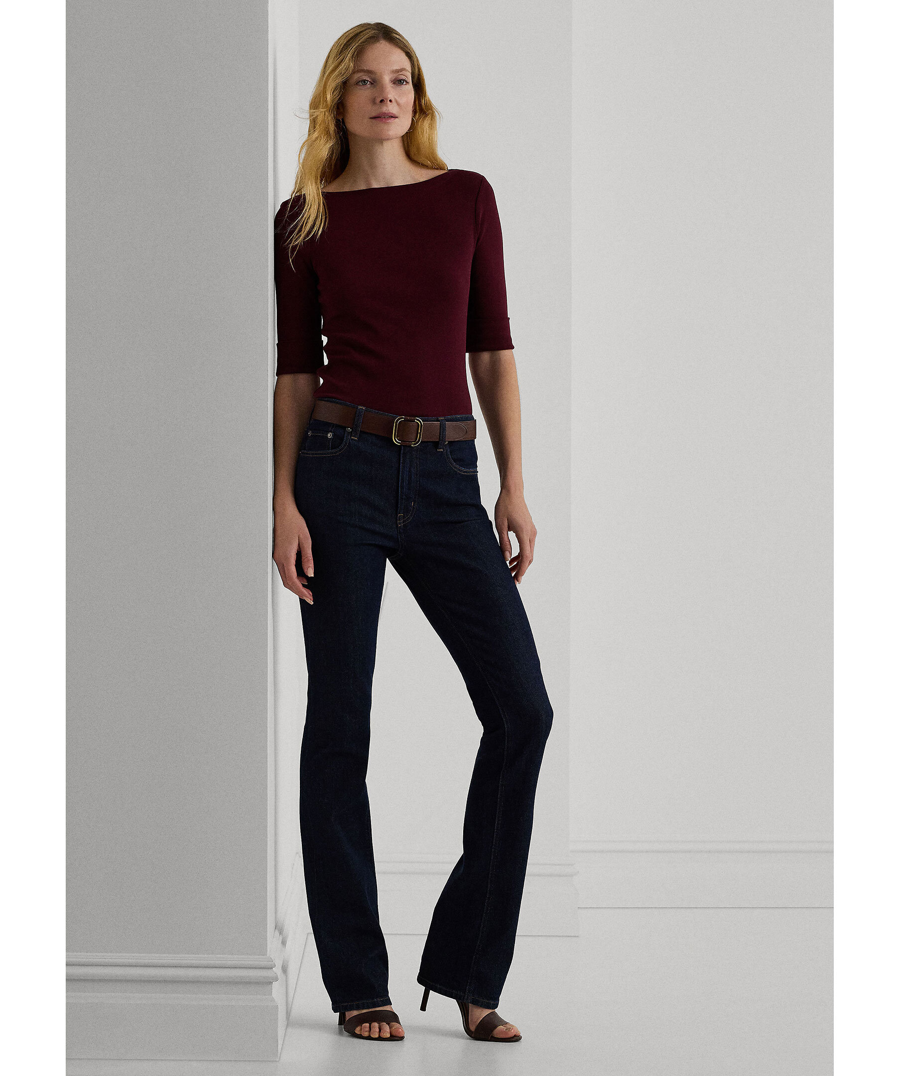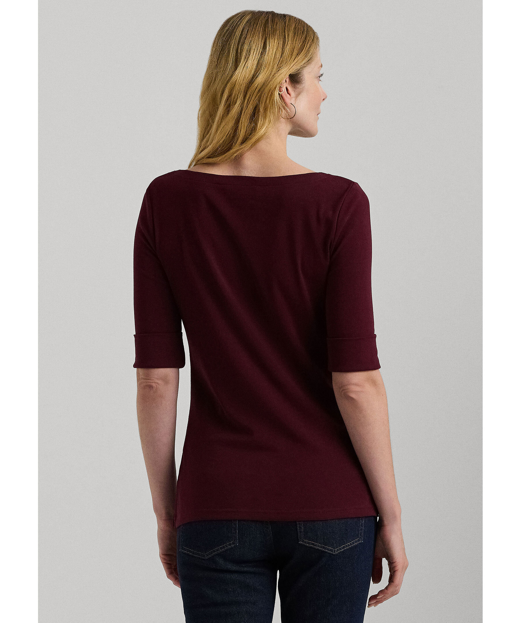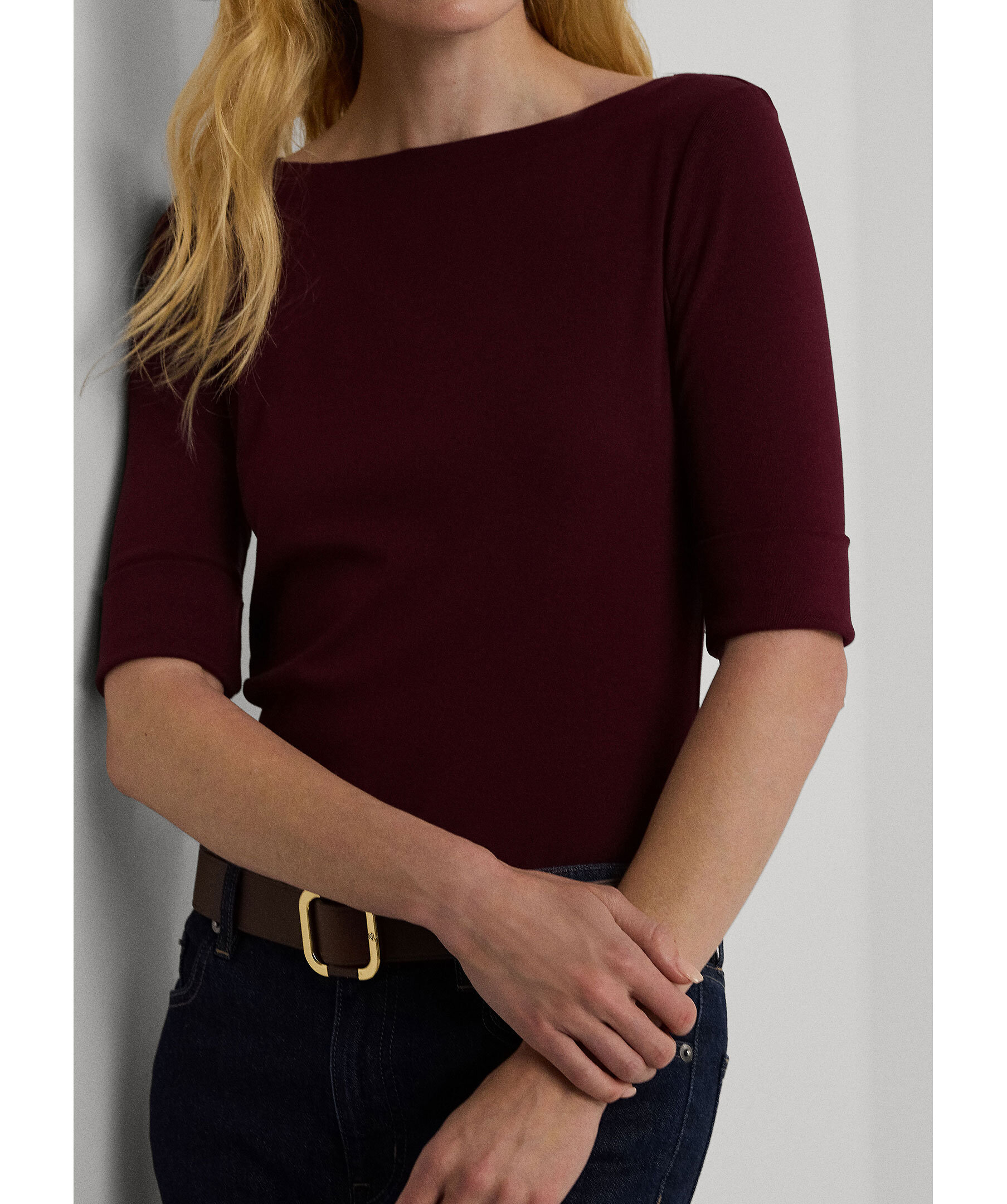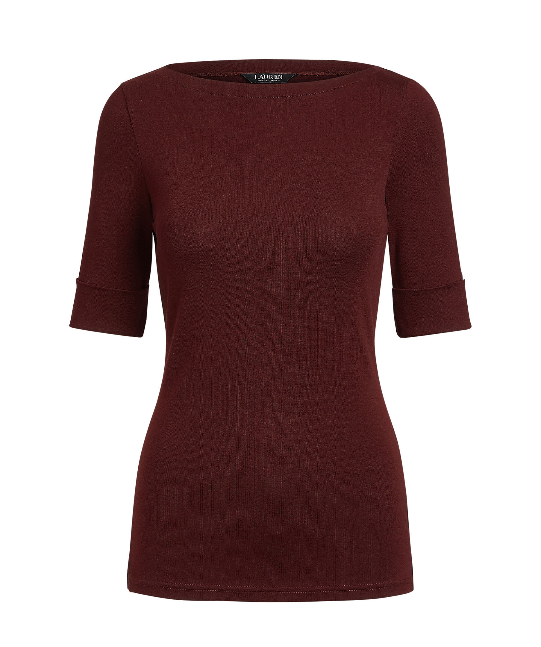 Vinröd topp i smal passform från Lauren Ralph Lauren. Tillverkad i stretchig bomull. Halvlånga ärmar, båthalsringning och slitsar i sidorna.