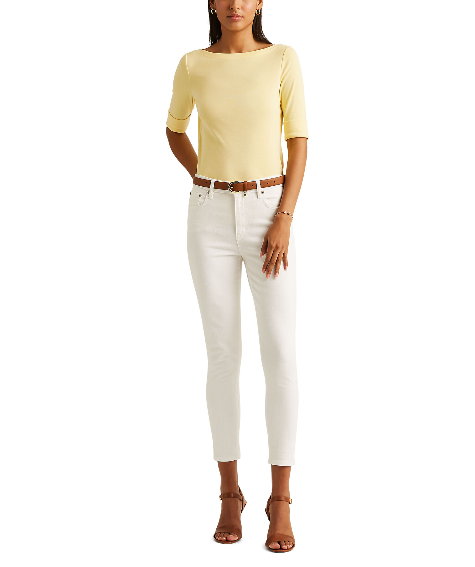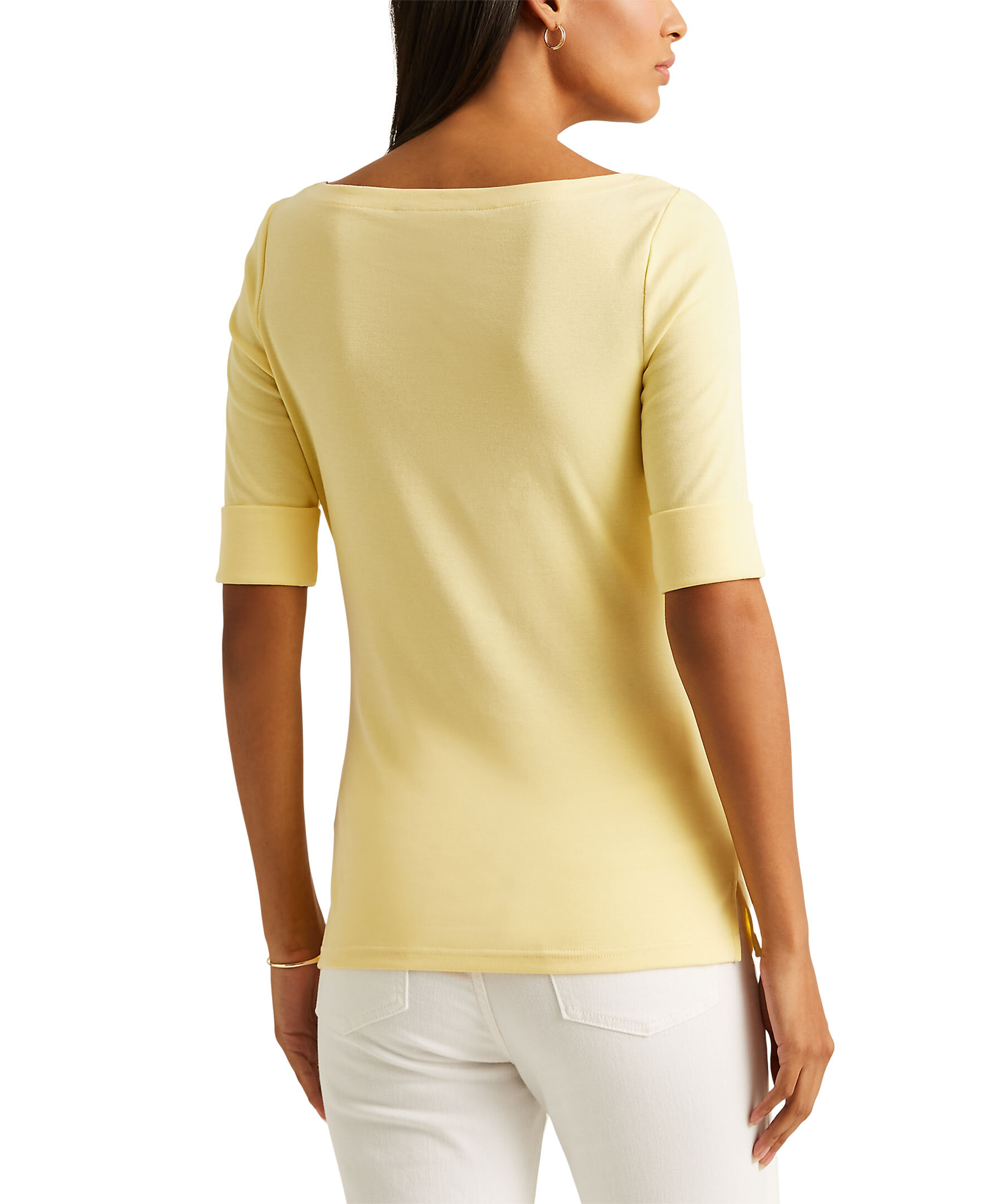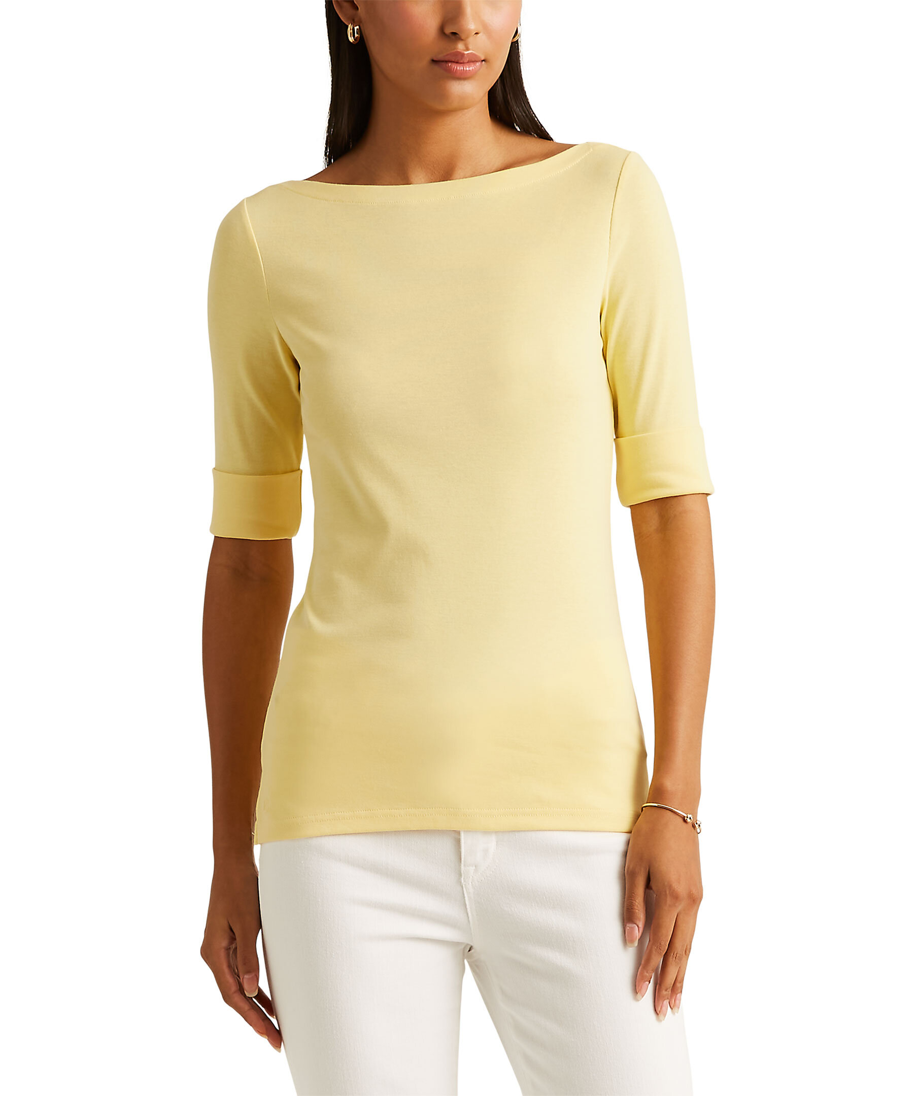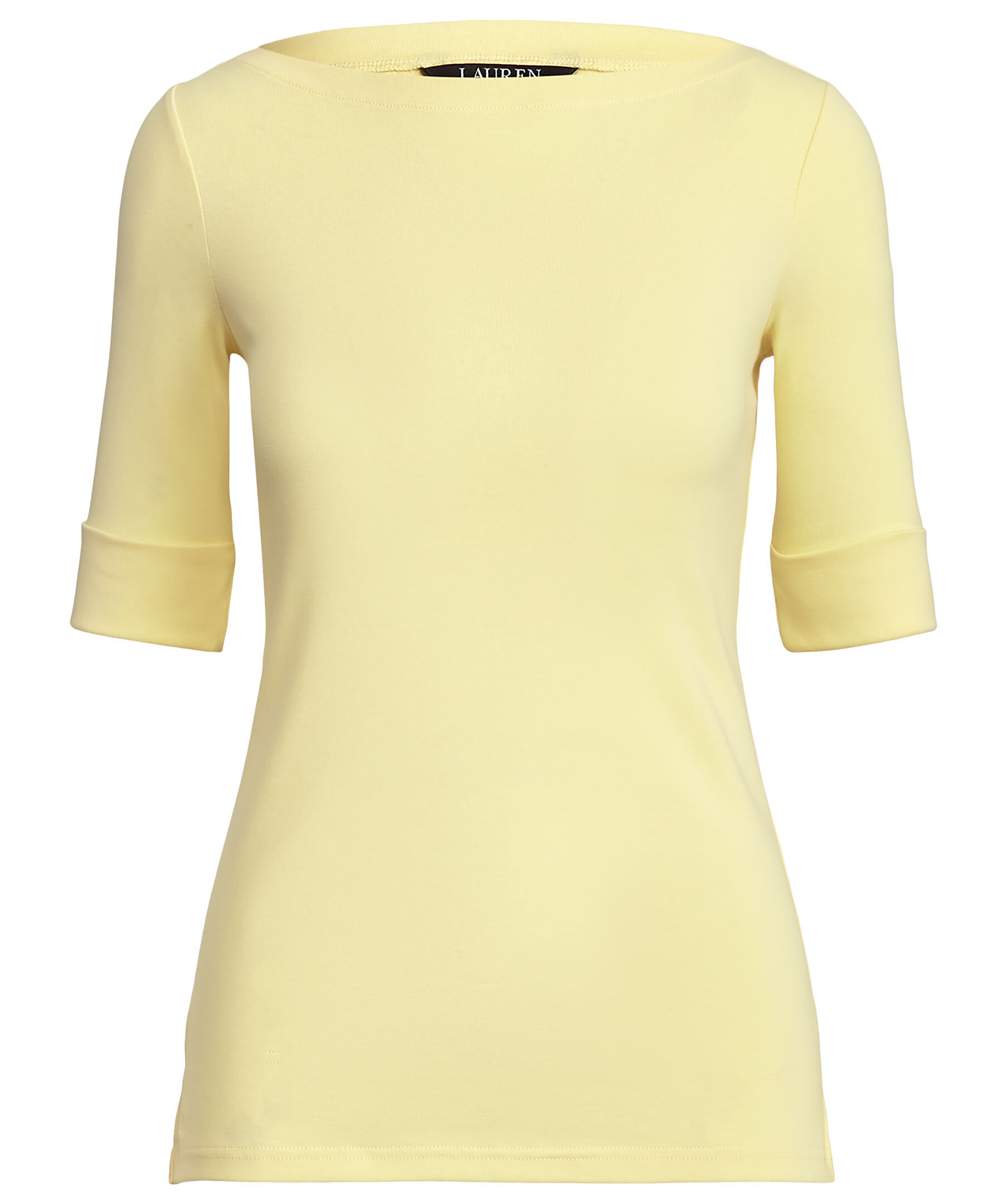 Ljusgul topp i smal passform från Lauren Ralph Lauren. Tillverkad i stretchig bomull. Halvlånga ärmar, båtringning och slitsar i sidorna.