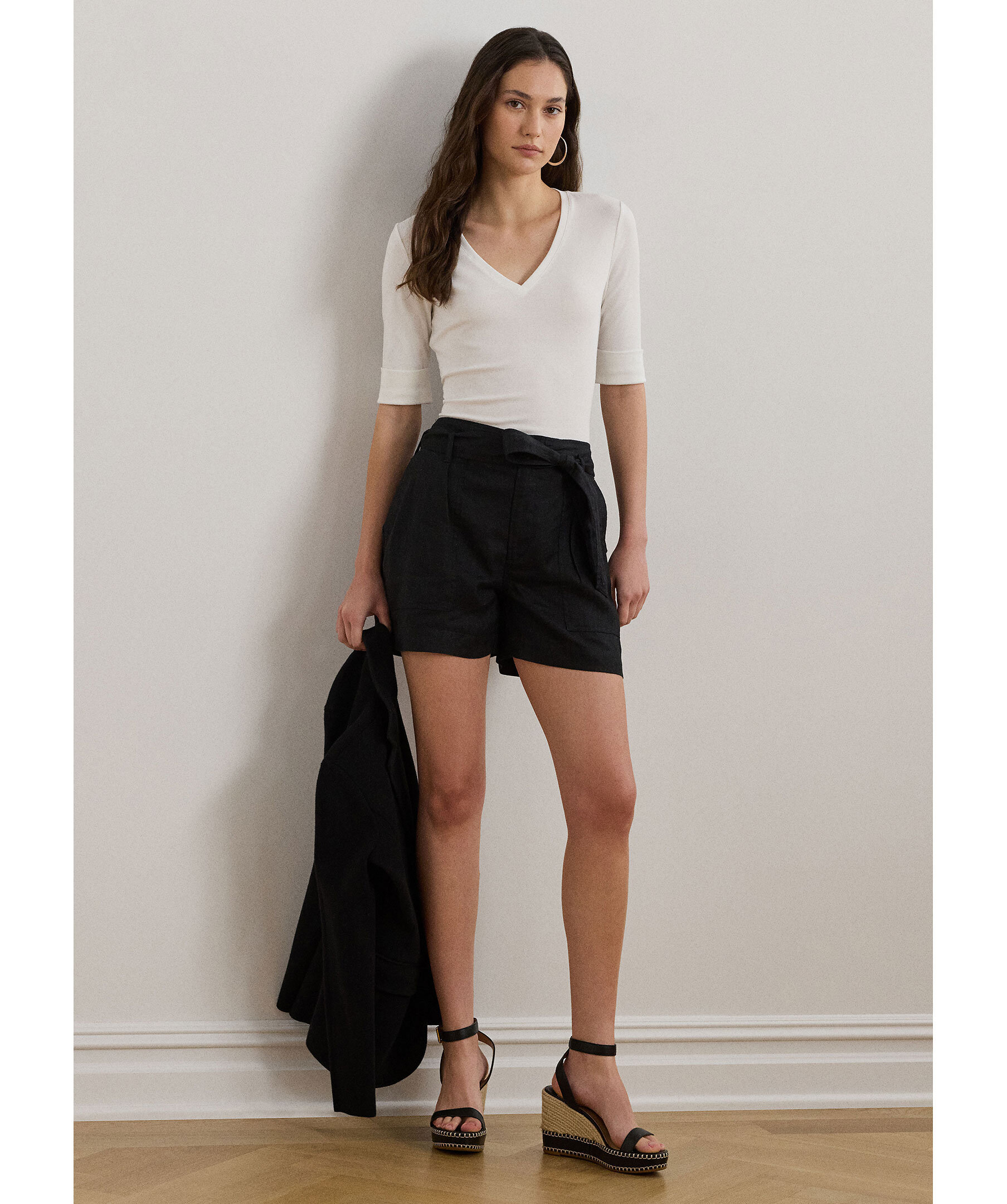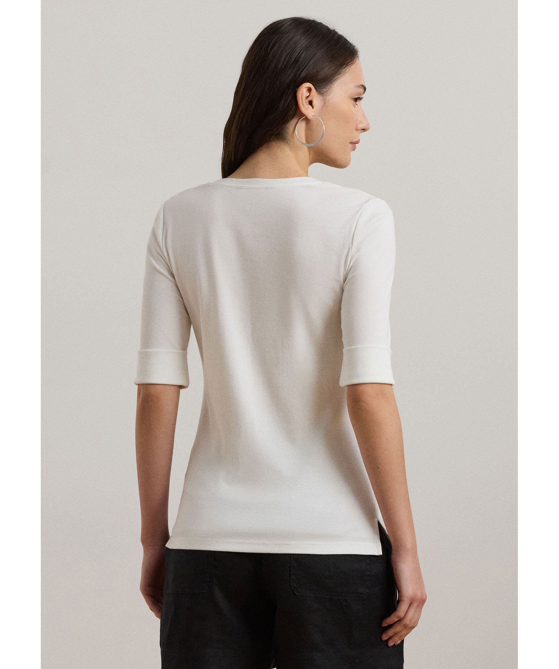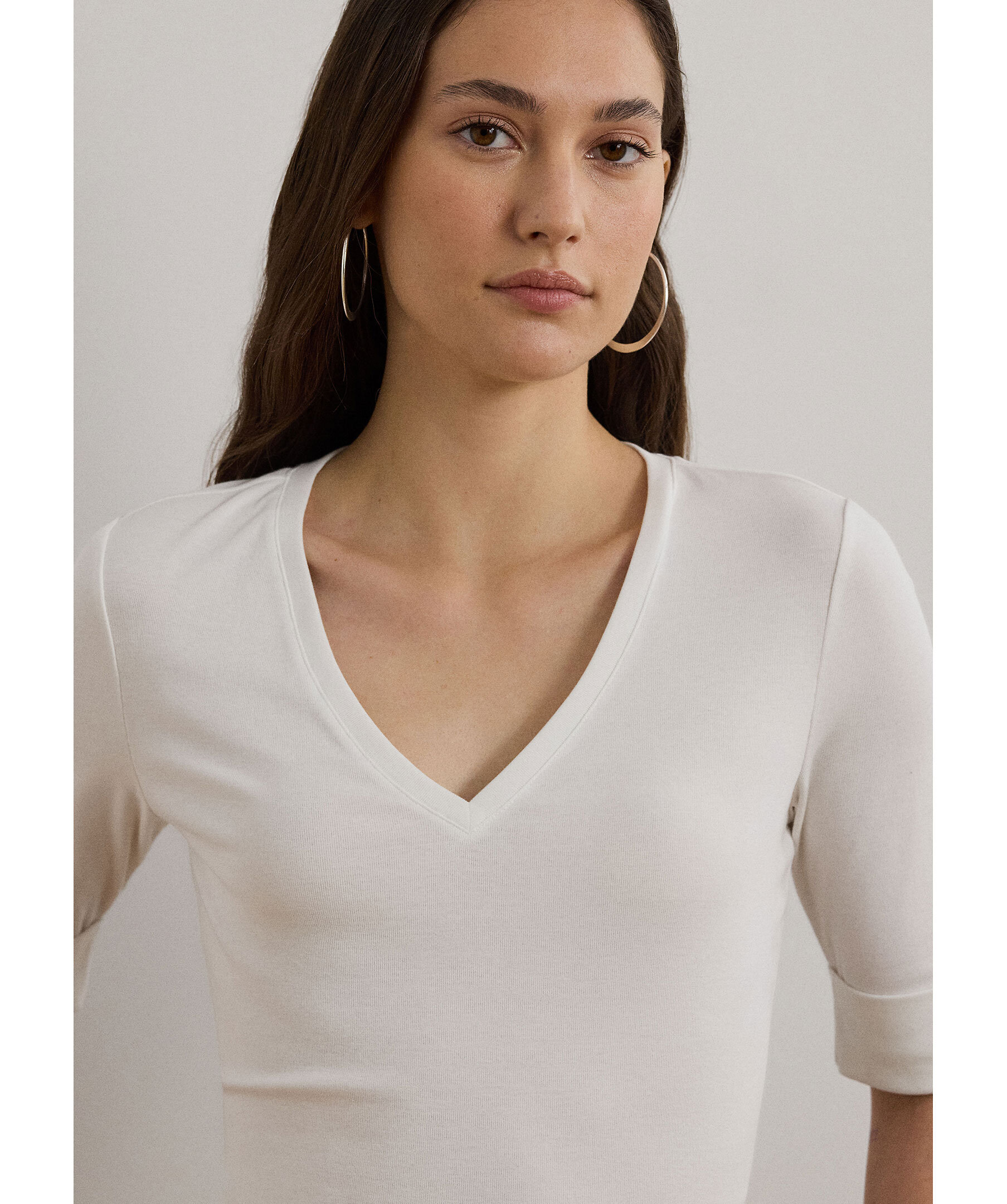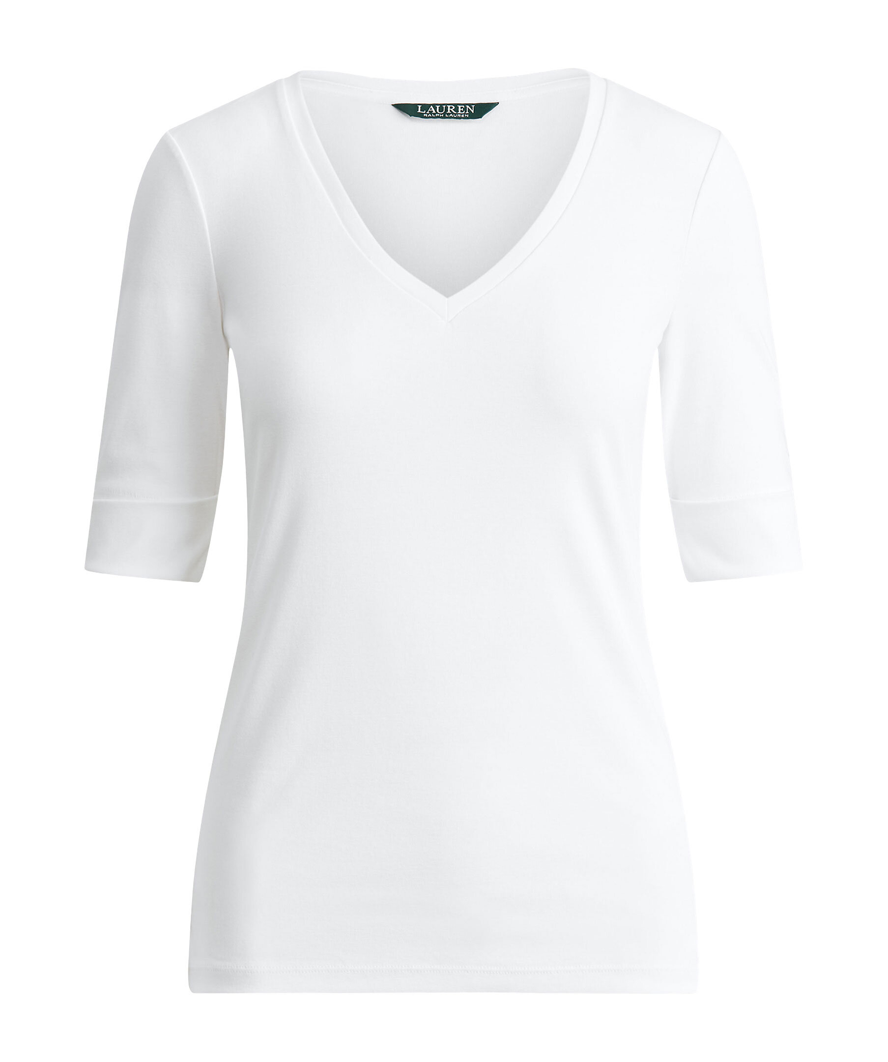 Vit topp från Lauren Ralph Lauren. Halvlånga ärmar, v-ringad halsringning och slitsar i sidorna. Tillverkad i stretchig bomull.