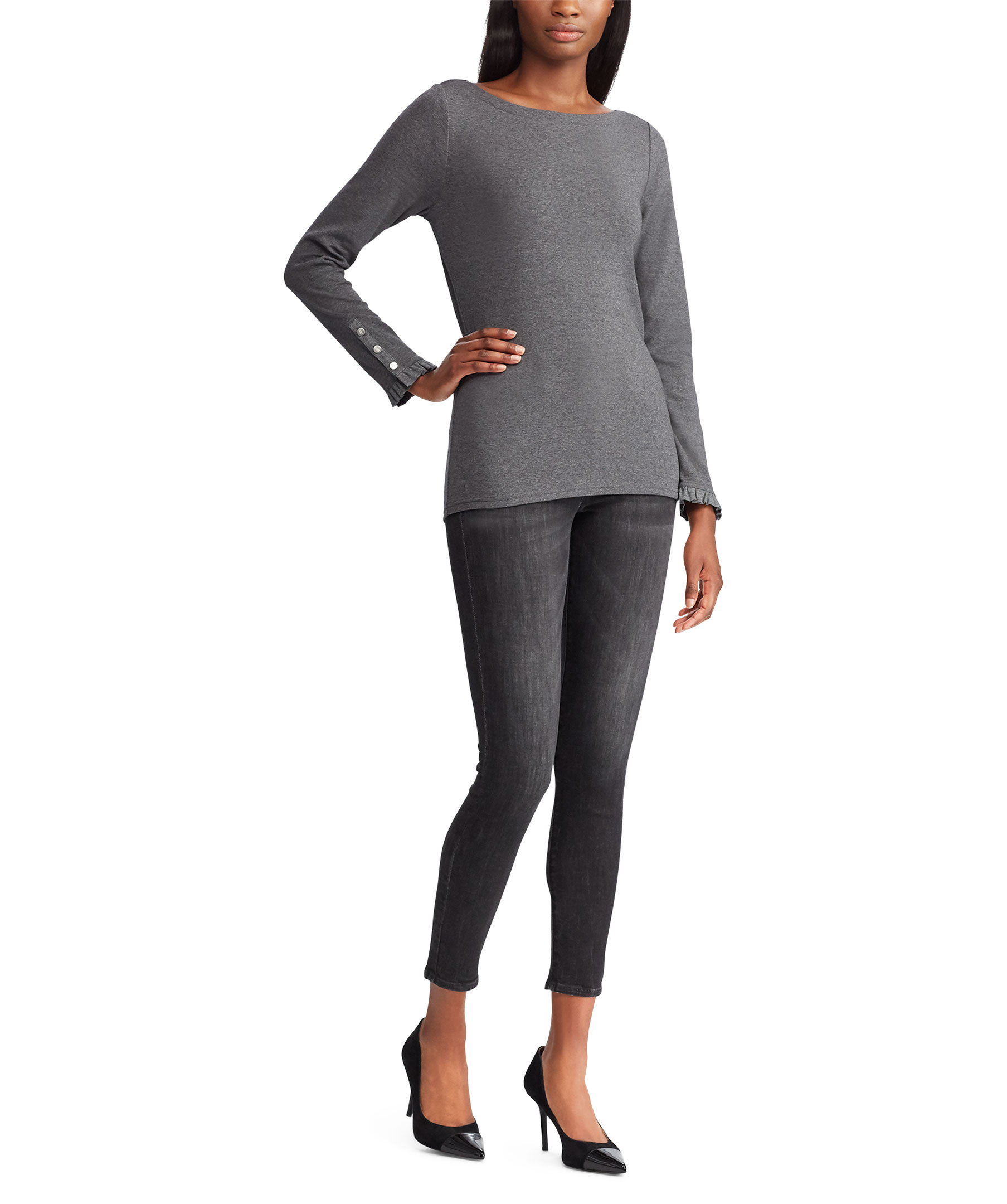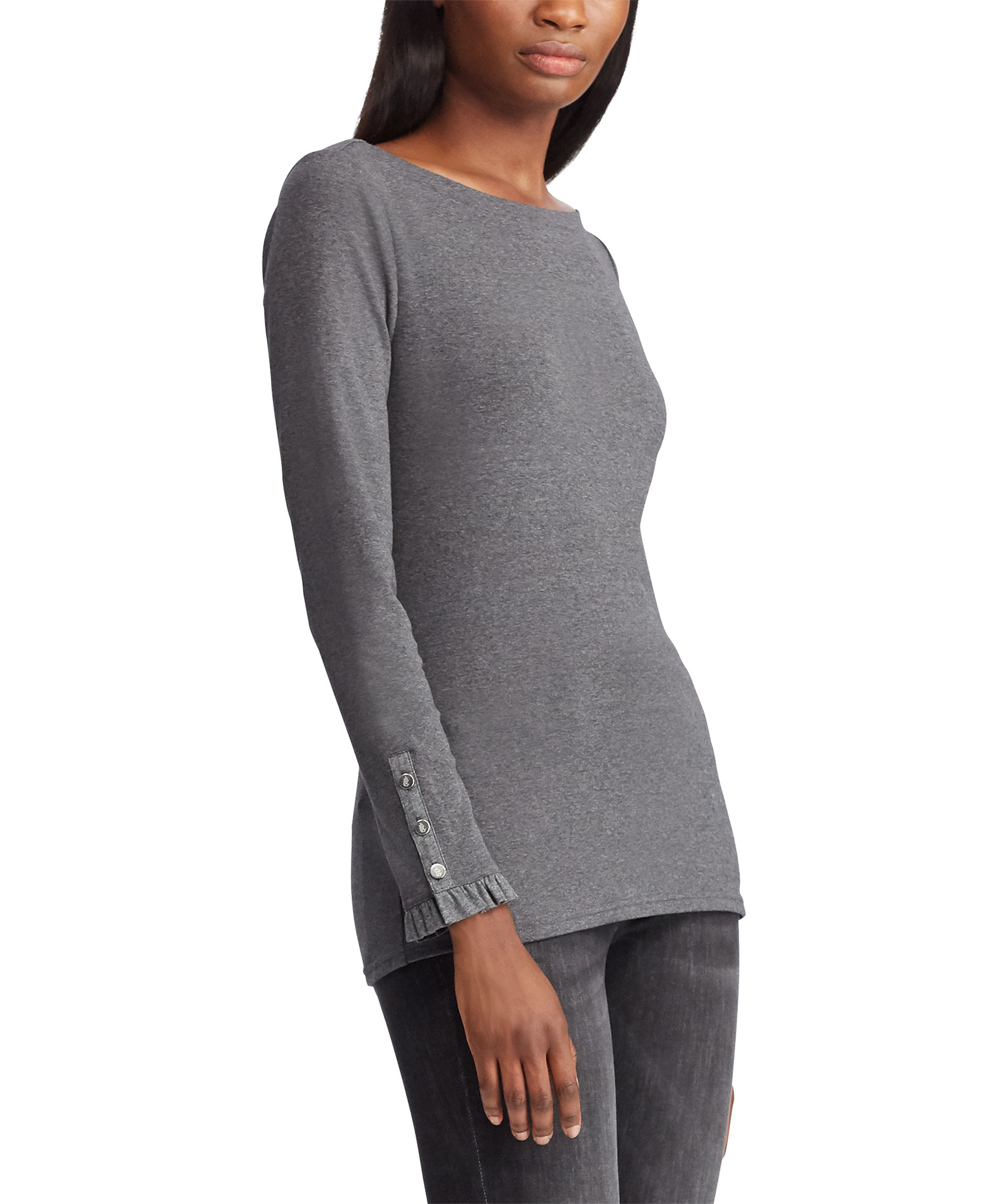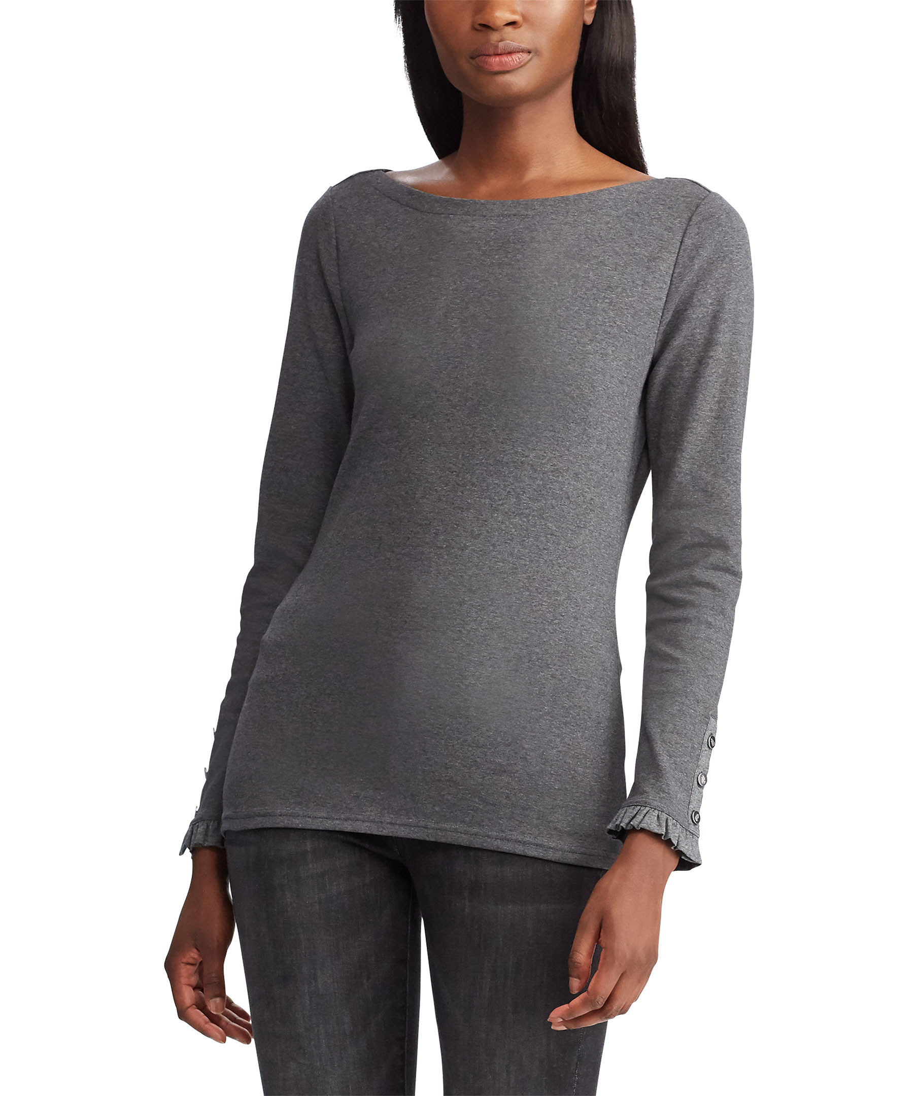 Grå långärmad tröja från Lauren Ralph Lauren. Applikation och volang i ärmslut, båthals.