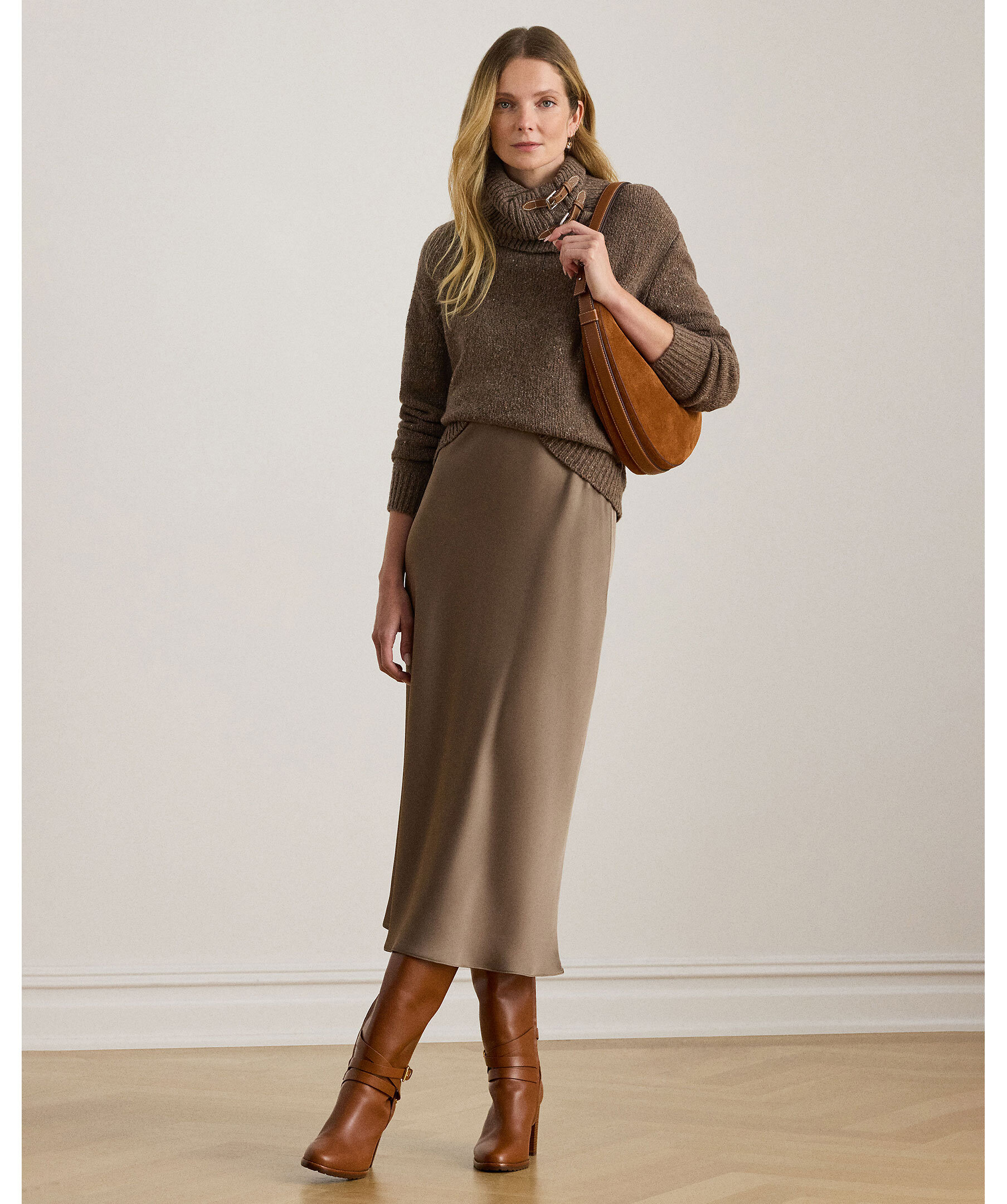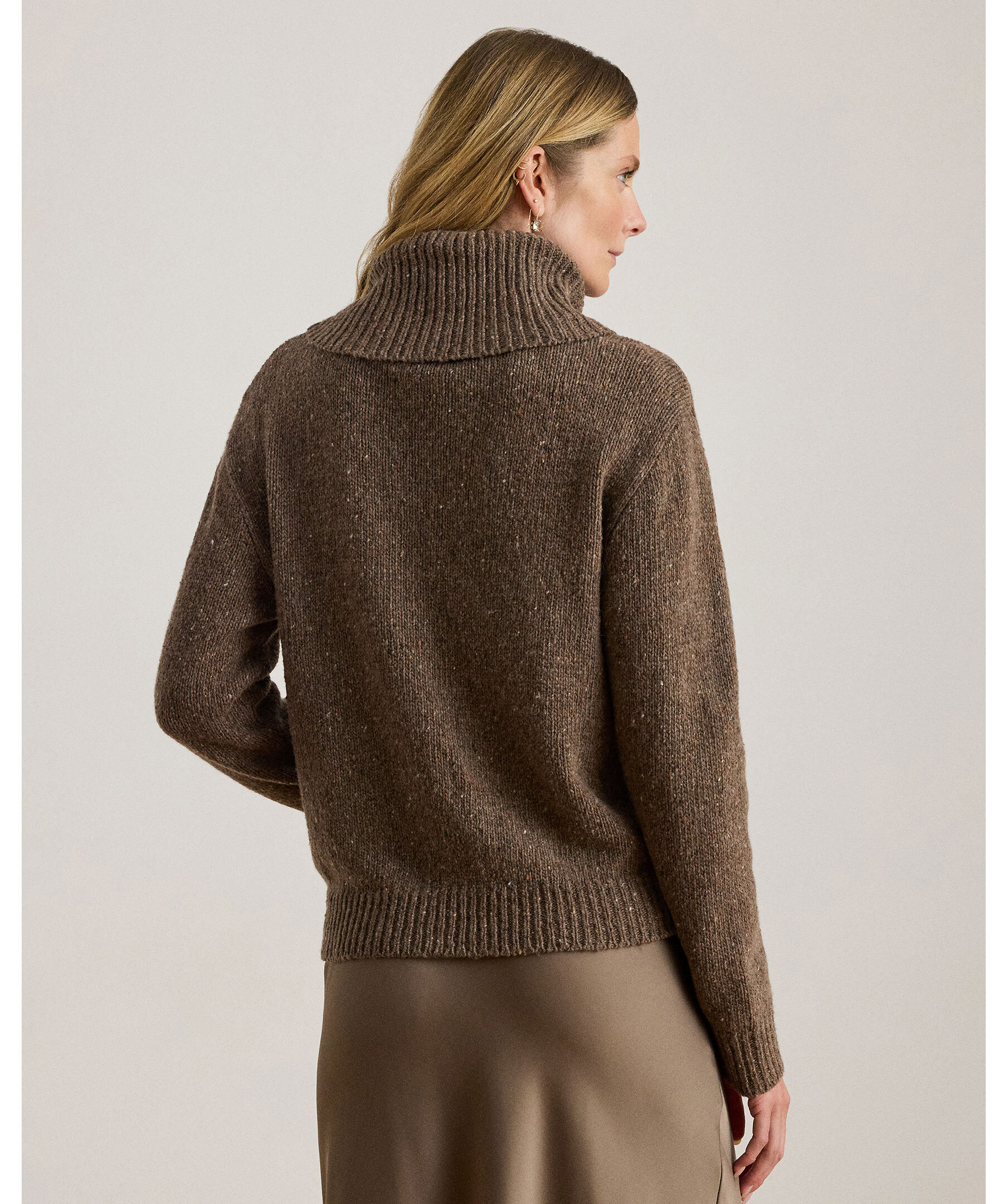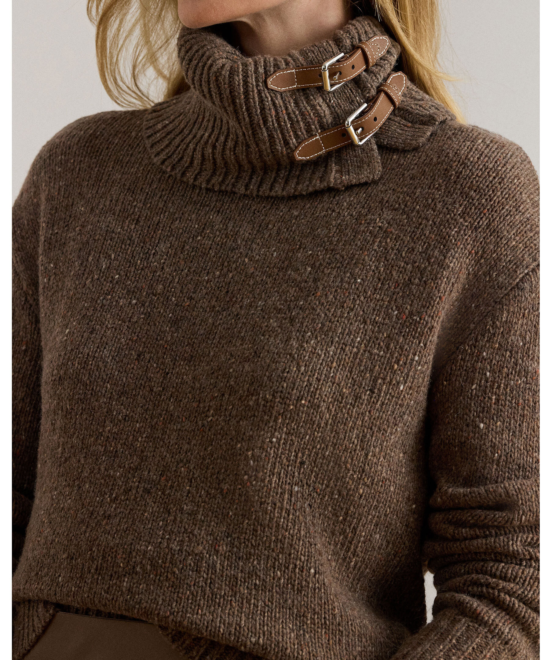 Brun tröja från Lauren Ralph Lauren är stickad i en mjuk ullblandning med en vacker melerad effekt. Den har en avslappnad passform och en ribbstickad, vikbar polokrage med två faux-läderremmar och metallspännen med "LRL"-logotyp, vilket ger en sofistikerad detalj. Tröjan har långa ärmar med ribbstickade manschetter och en ribbstickad fåll, vilket ger en stilren finish. Perfekt för lager-på-lager-styling under kyligare dagar.