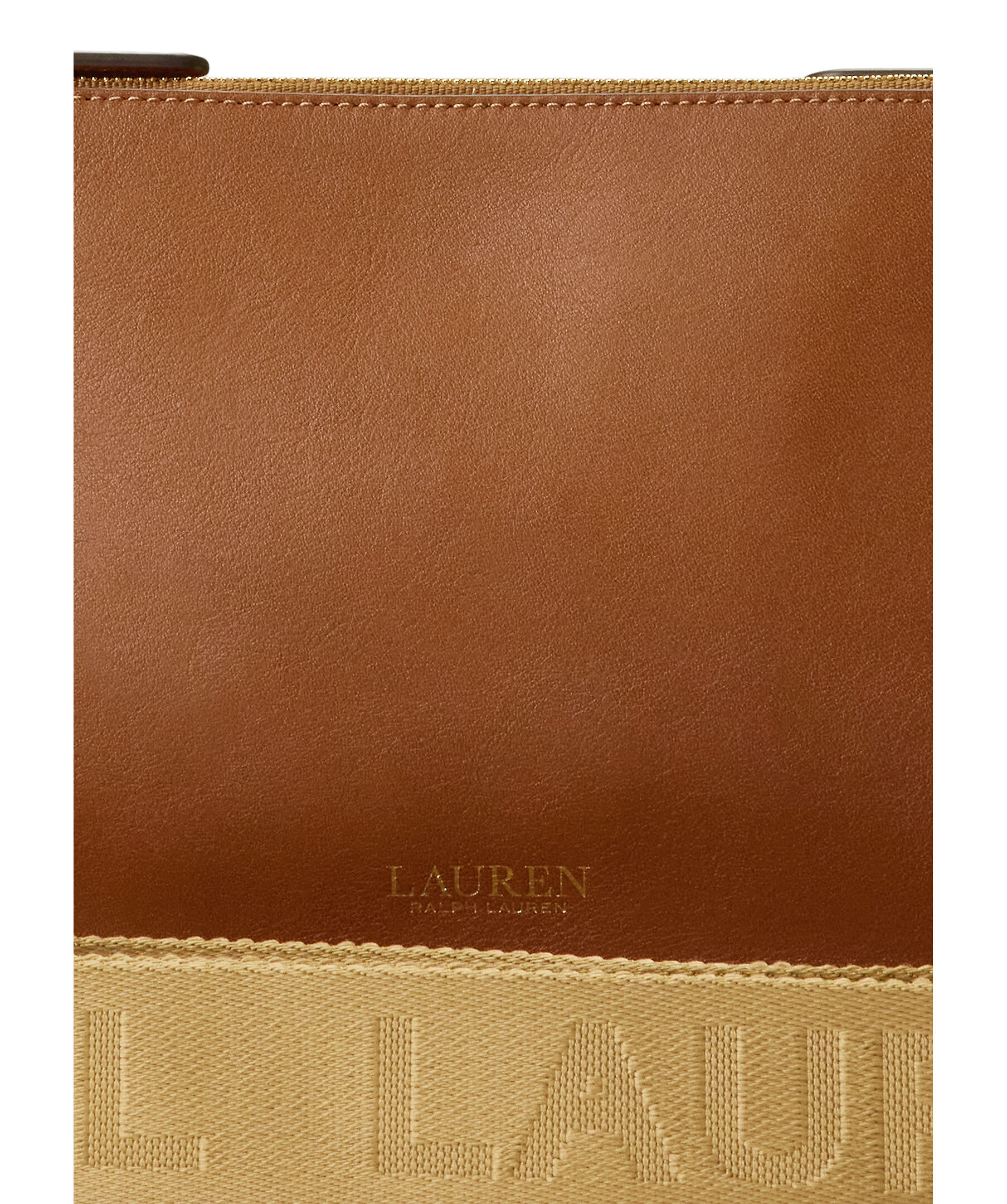 Brun väska i läder från Lauren Ralph Lauren. Tryckt guldfärgad logotyp. Två huvudfack som stängs med guldfärgad dragkedja. Två justerbara och avtagbara axelremmar, en i läder och ett vävt med logotyper. Väskans mått: H 17 cm, B 25 cm, D 4 cm.