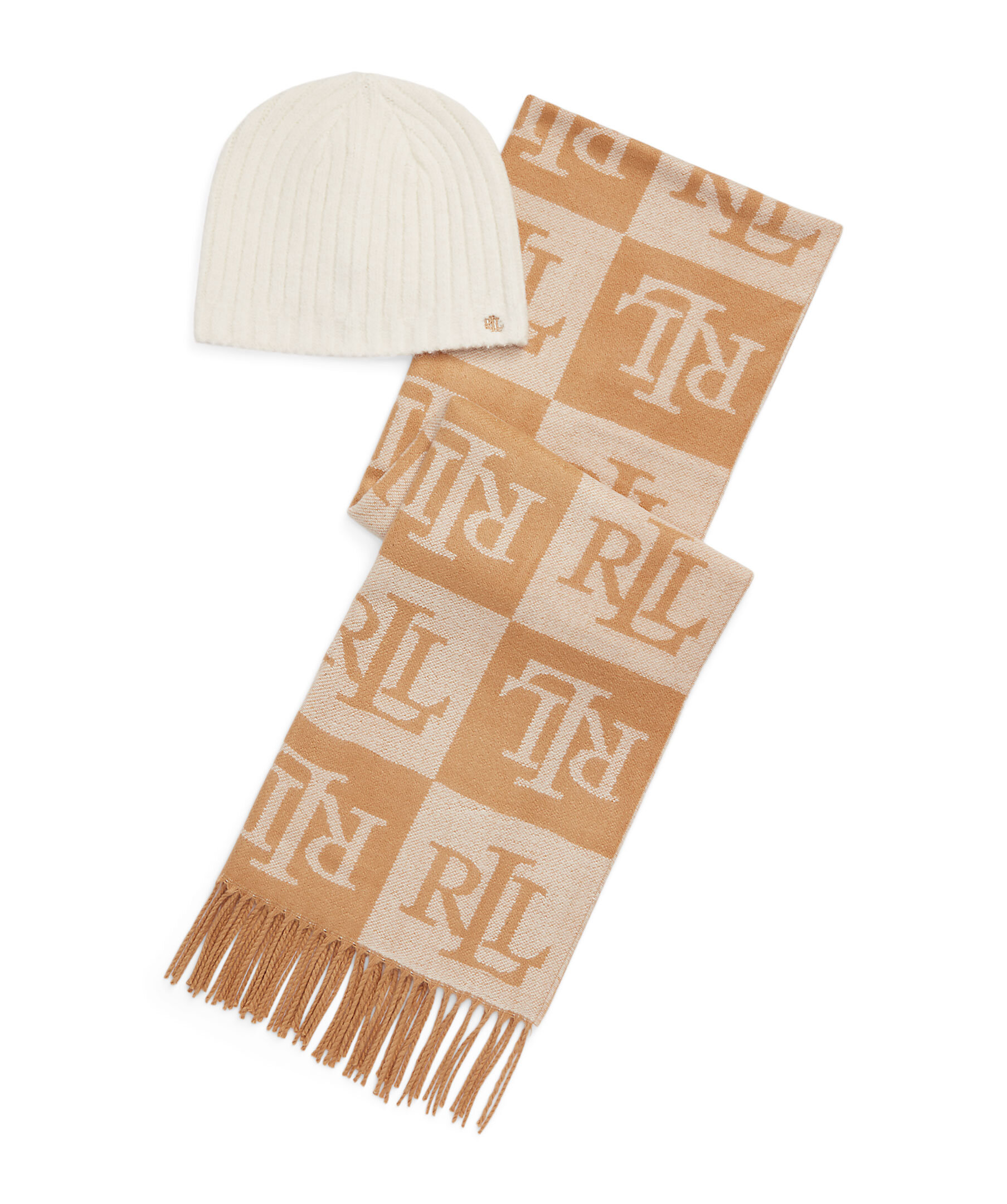Krämvit och kamelfärgat presentpaket till dig själv eller någon du tycker om från Lauren Ralph Lauren. Det här mysiga setet innehåller en franskantad jacquardsjal som kännetecknas av Laurens rutiga monogrammotiv och en ribbstickad mössa broderad med en "LRL"-logotyp.