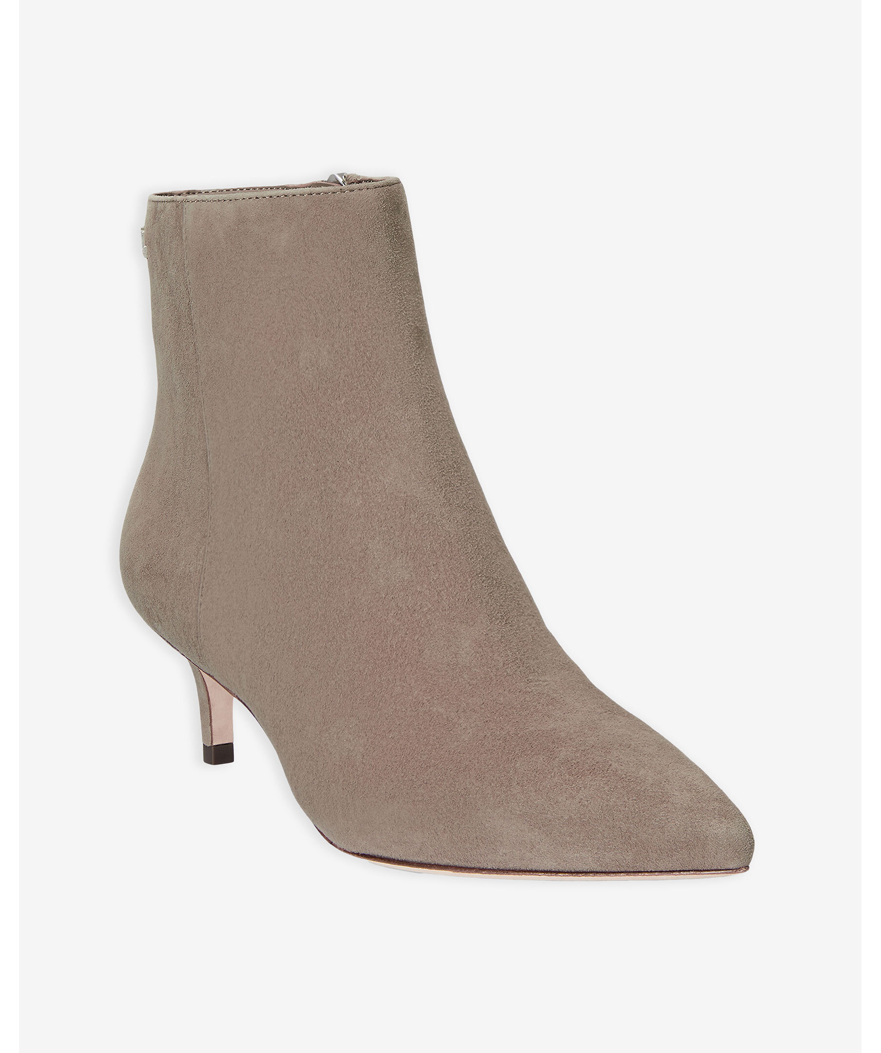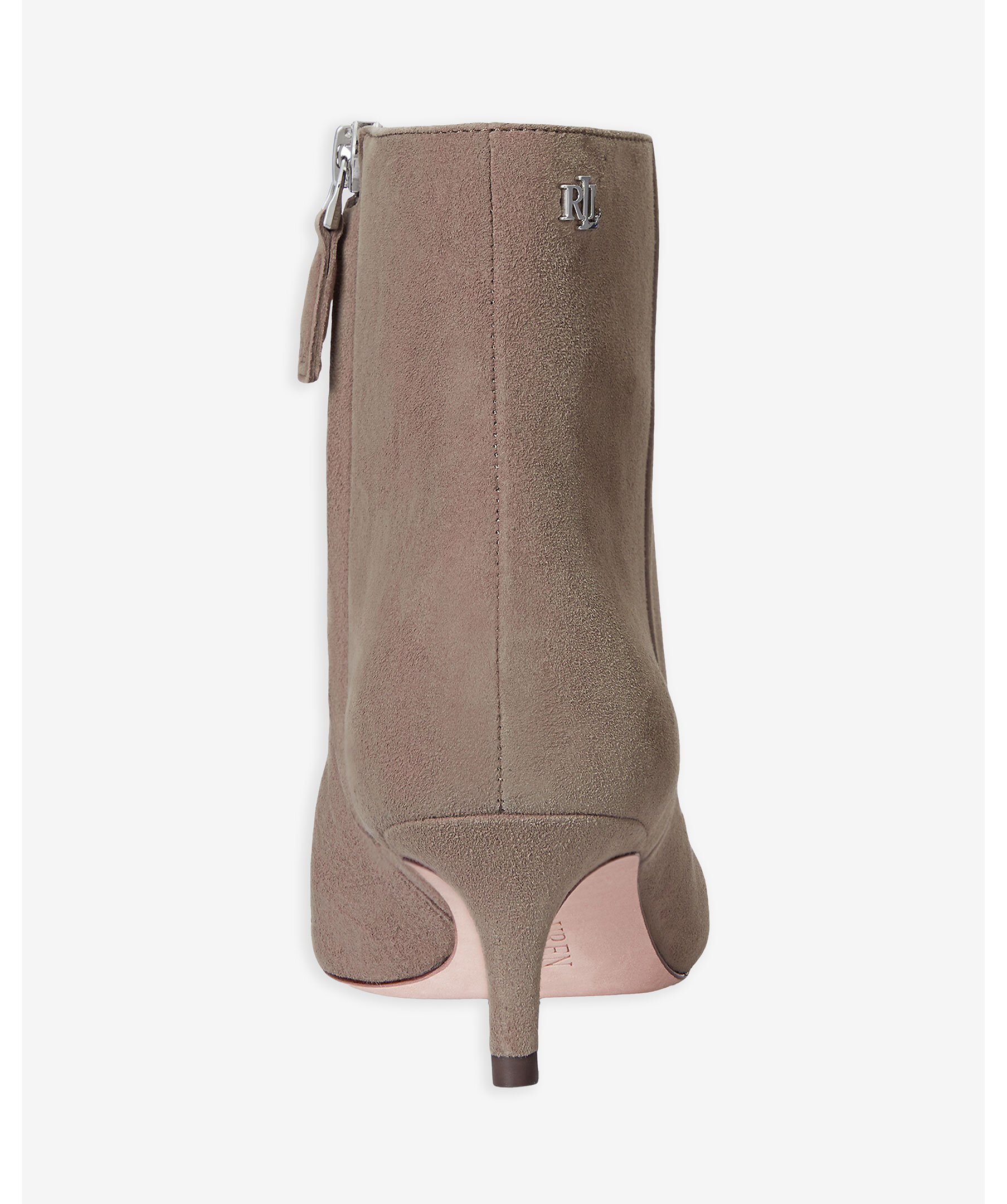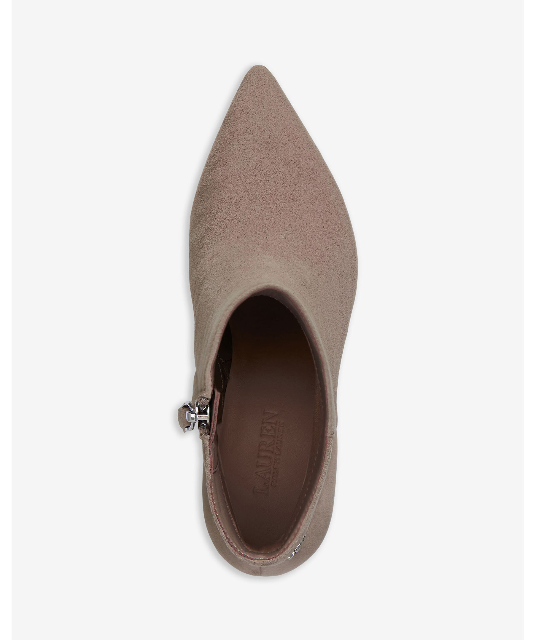 Beige boot med klack i elegant mocka från Lauren Ralph Lauren. Med en spetsig tåform och en medelhög kitten heel på 5cm som förlänger silhuetten utan att kompromissa med komforten passar denna stövel för både vardag och fest. Guld färgad logotyp på skons ena sida.