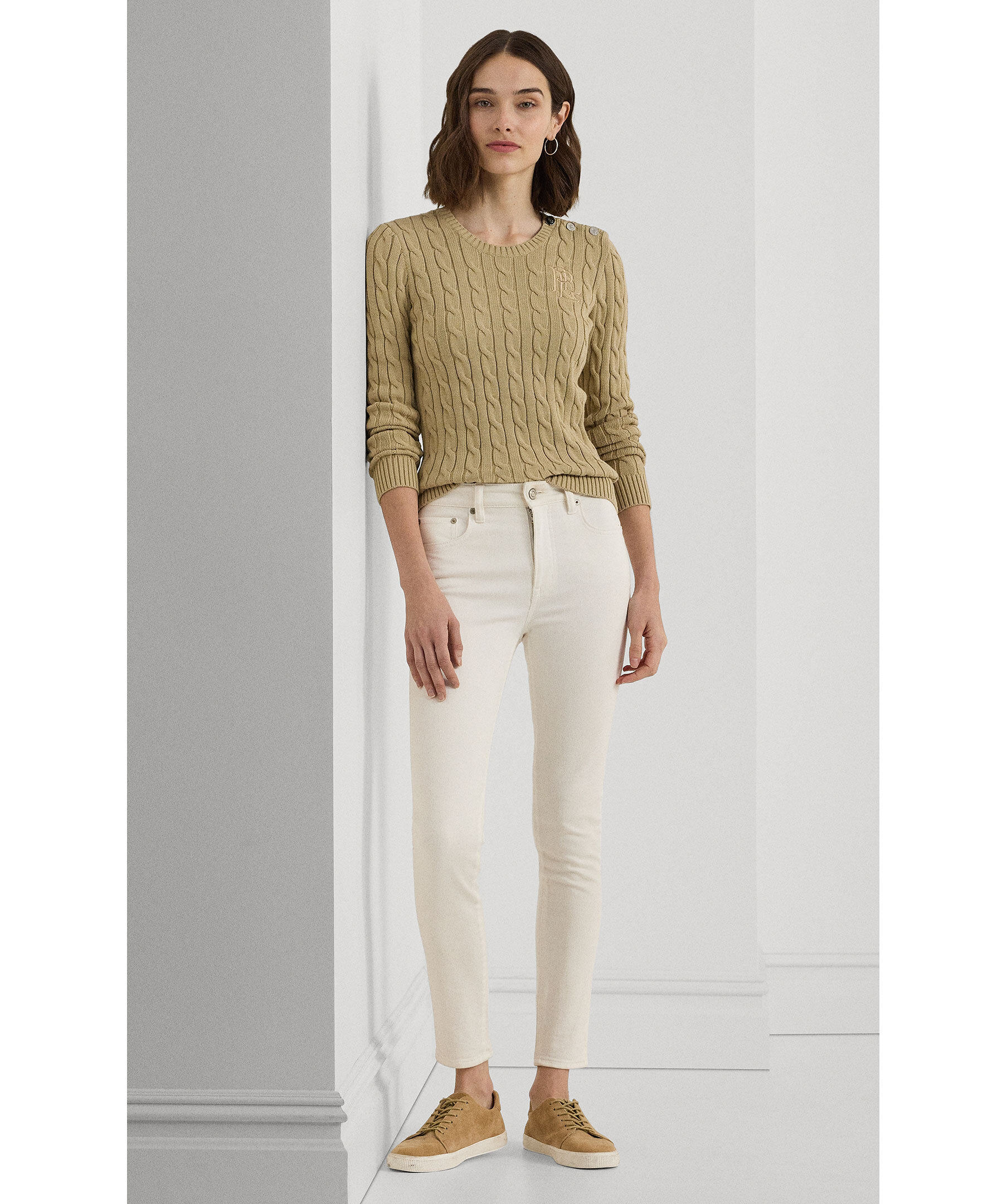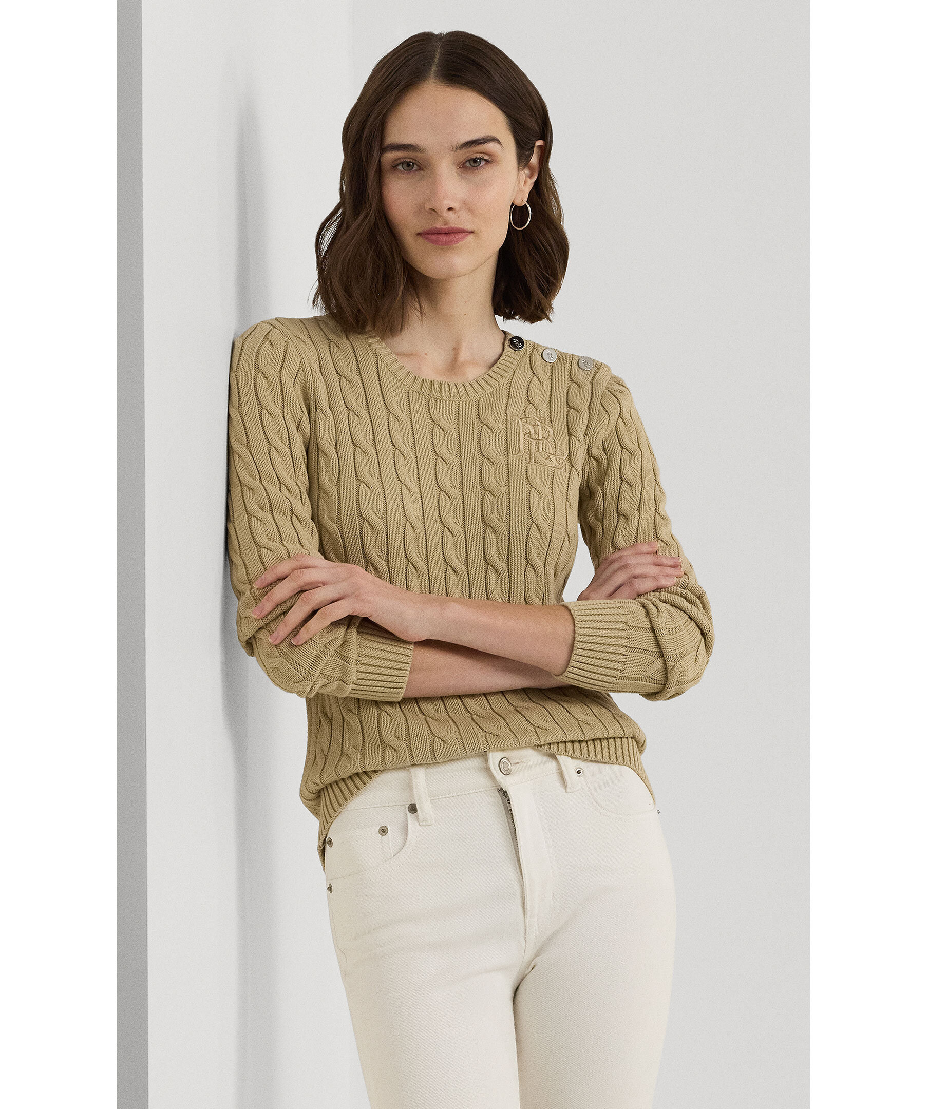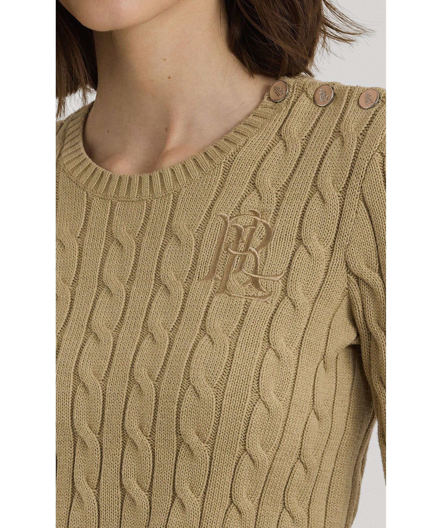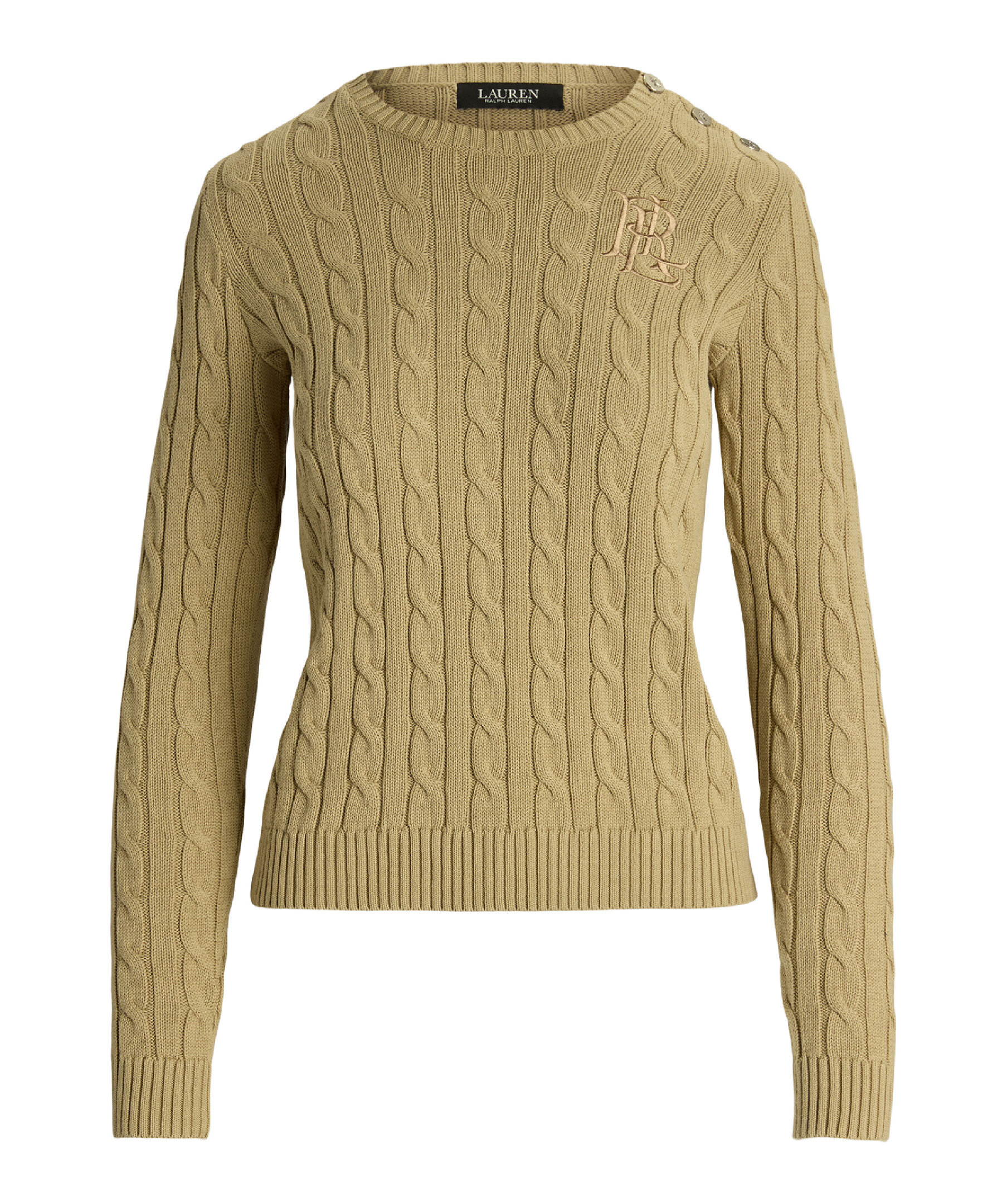 Beige kabelstickad tröja från Lauren Ralph Lauren. Tröjan har ribbstickad halsringning samt ribbstickade muddar vid ärm- och plaggslut, broderad logotyp på bröstet samt tre silverfärgade metallknappar på vänster axel. Tillverkad i bomull.