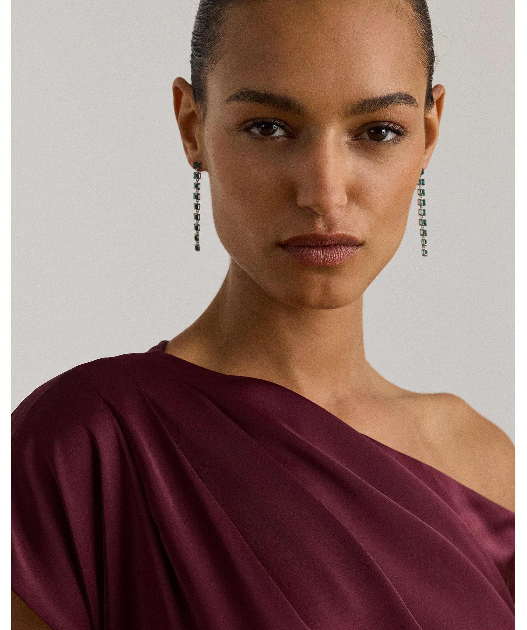 Elegant golvlång klänning från Ralph Lauren i satin‑charmeuse med asymmetrisk off‑shoulder‑ringning som framhäver axlarna. Klänningen har en elegant, figurnära silhuett och ett vackert fall med subtil glans för festens finare tillfällen.