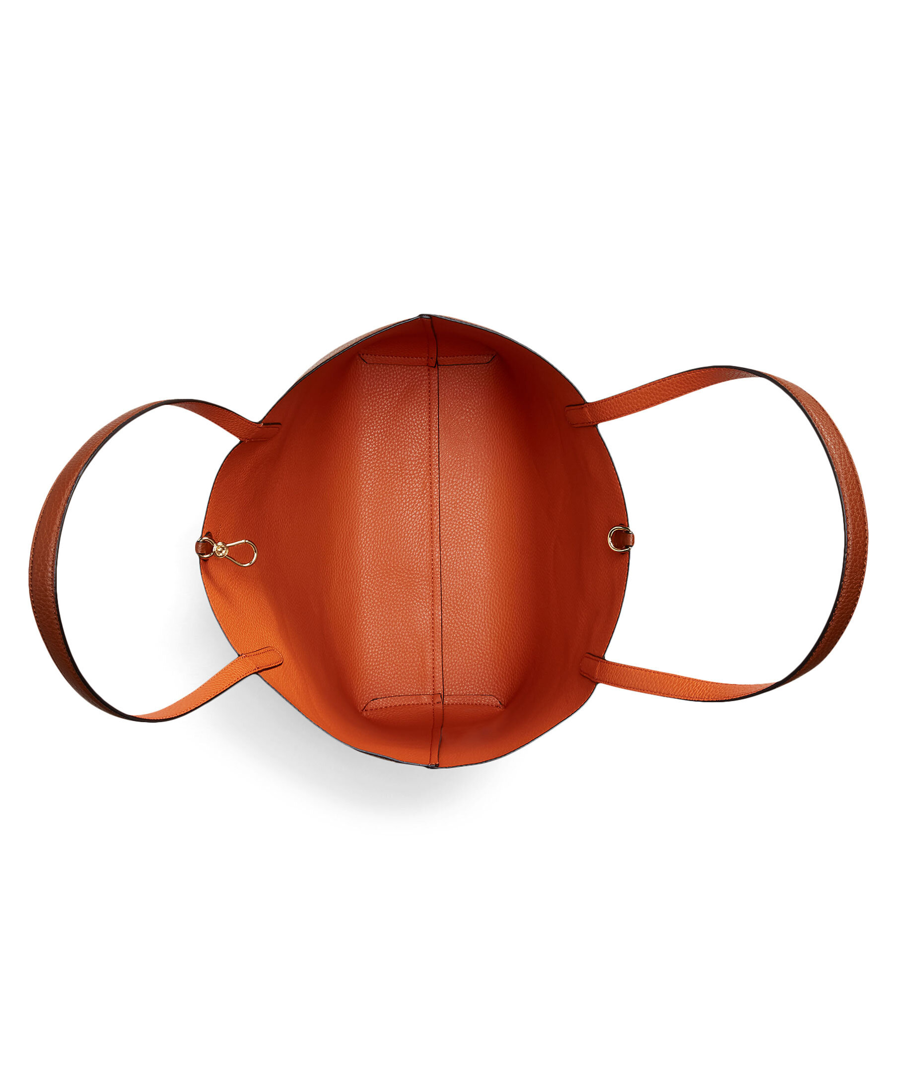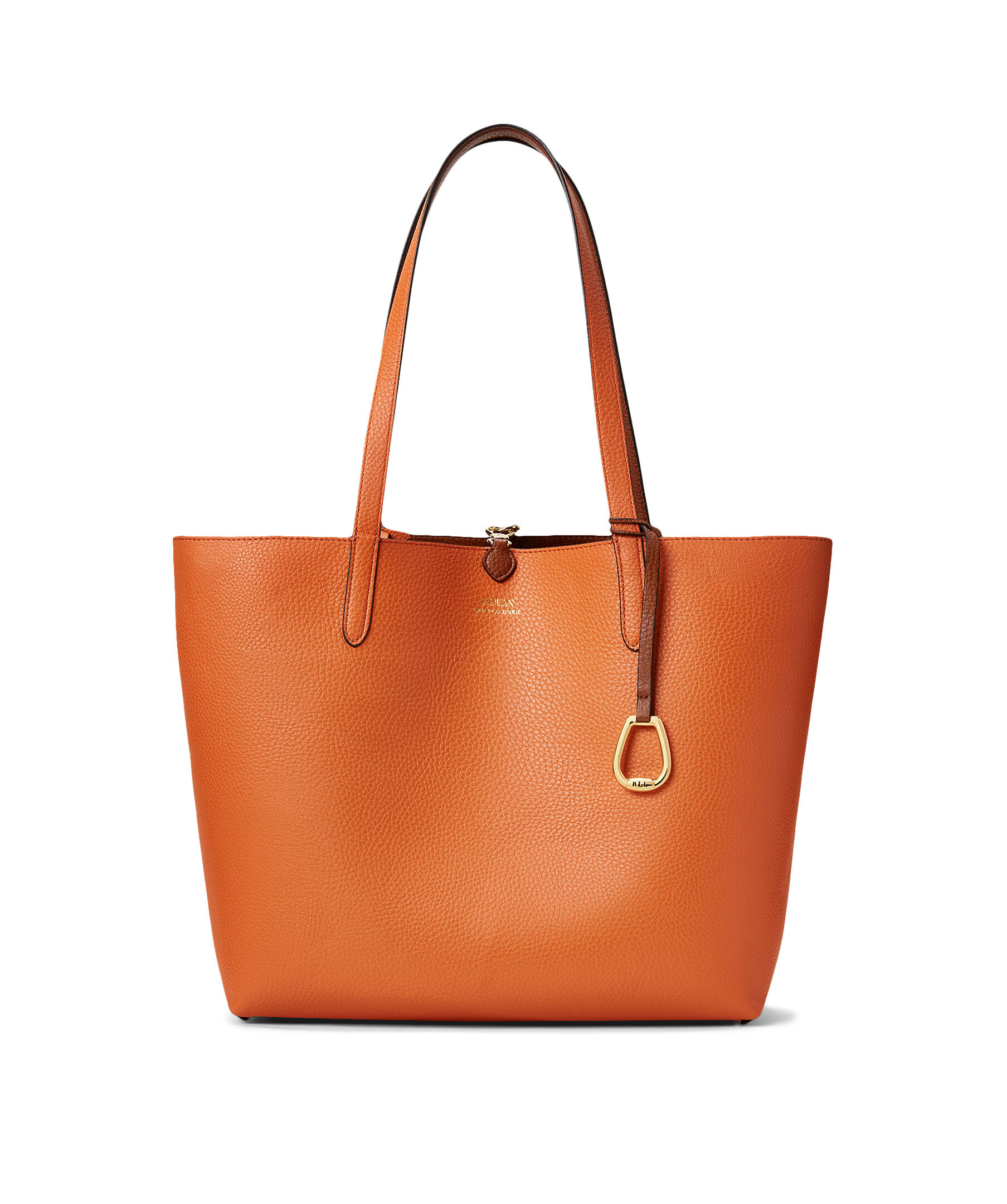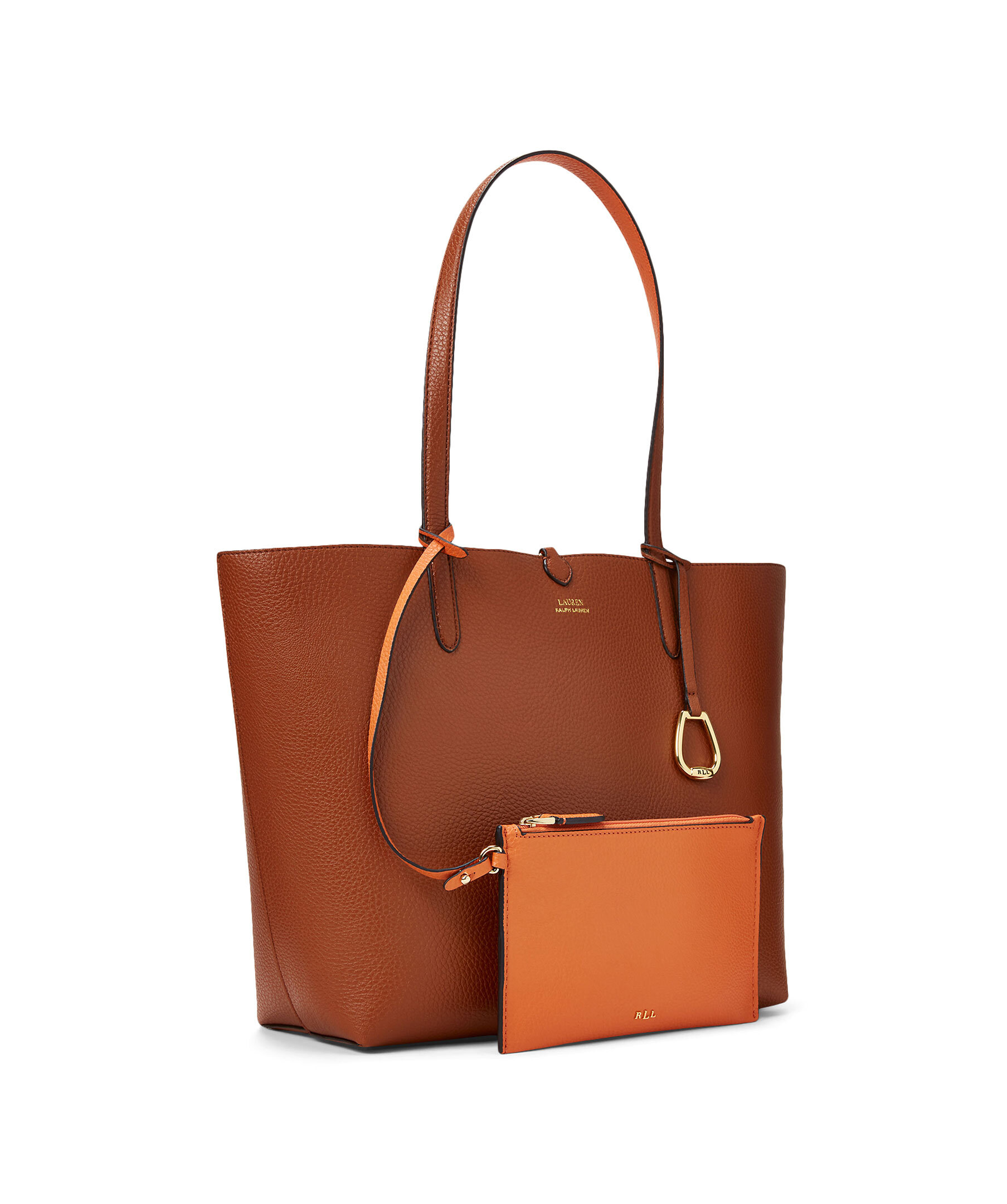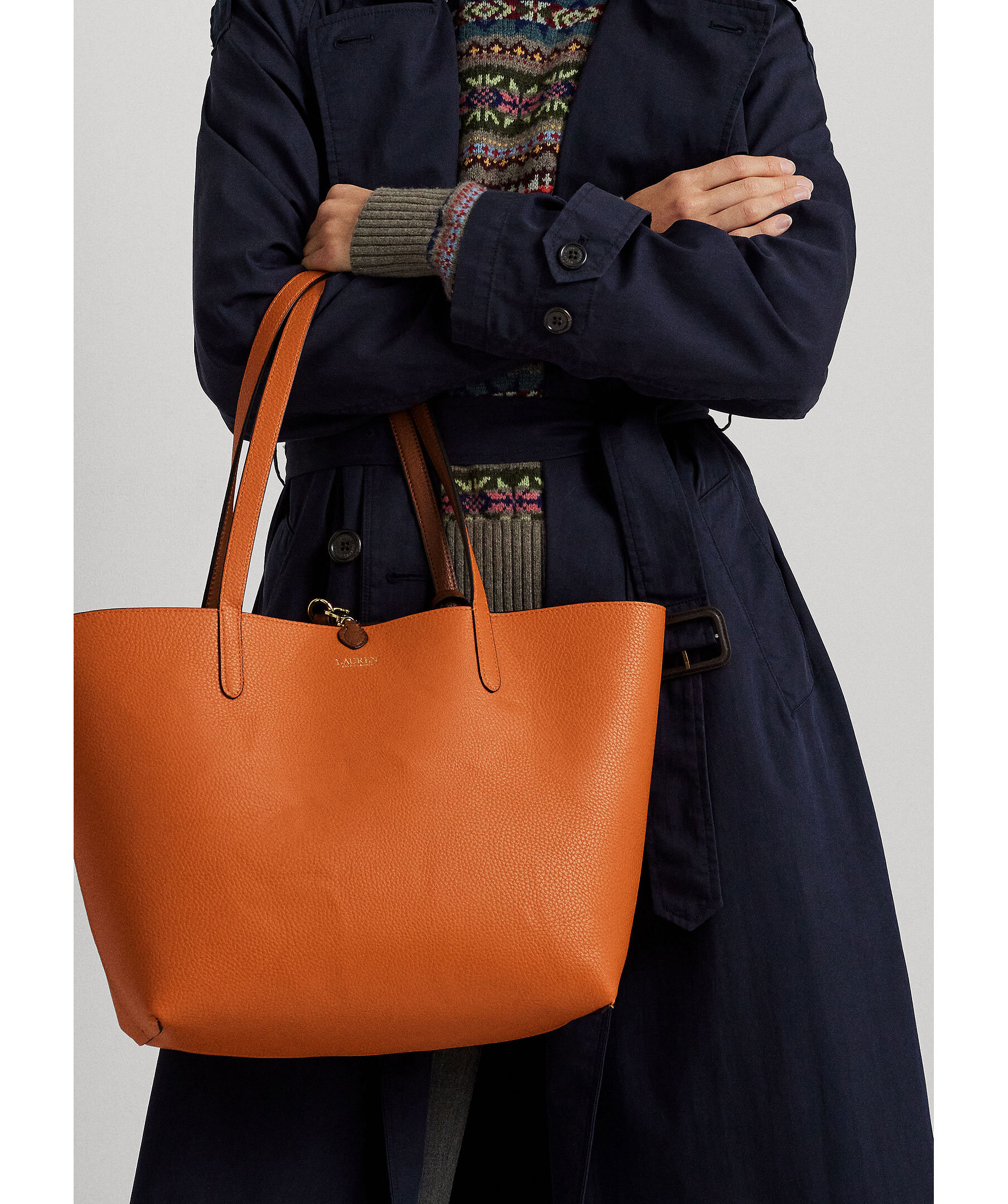 Kamelfärgad och orange väska från Lauren Ralph Lauren. En elegant och praktisk väska som kan vändas för att variera mellan två olika färger, vilket gör den mångsidig och användbar för olika tillfällen. Grain-textur som ger ett sofistikerat utseende. Dubbla handtag, en avtagbar innerväska med dragkedja för extra förvaring, och logotyp. Mått: 32/43 x 29 x 13 cm.