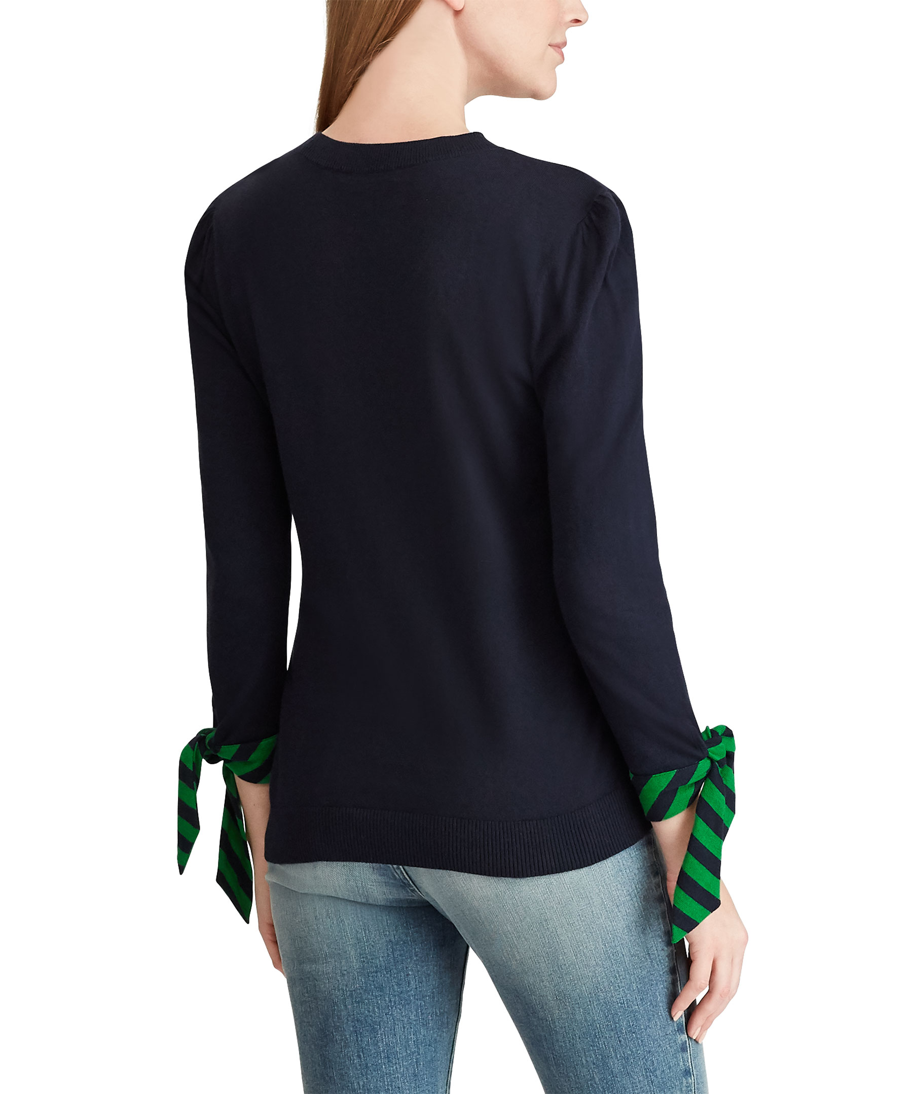 Mörkblå stickad tröja från Lauren Ralph Lauren. Puffade ärmar i trekvarts längd med knytning i ärmslut.