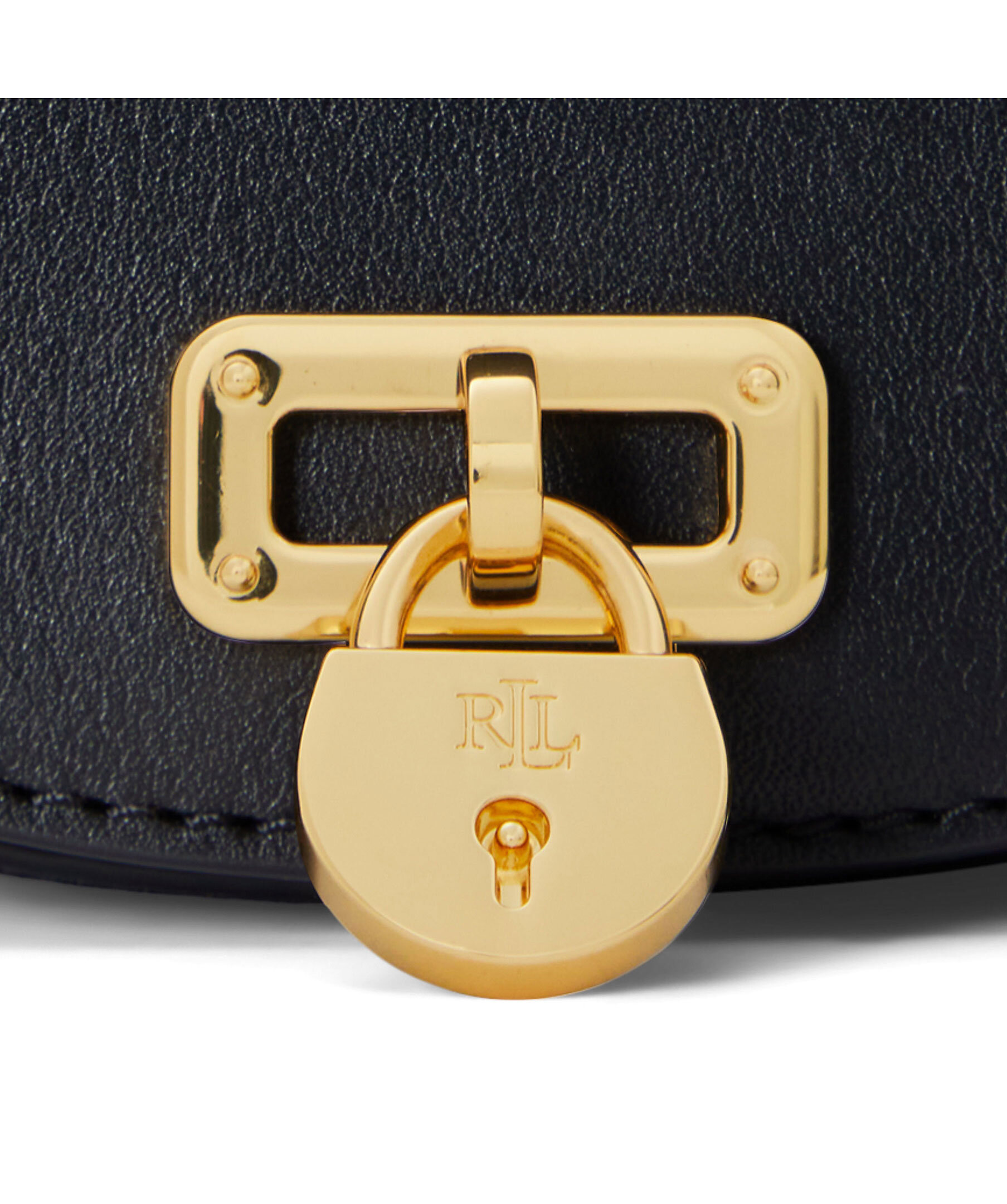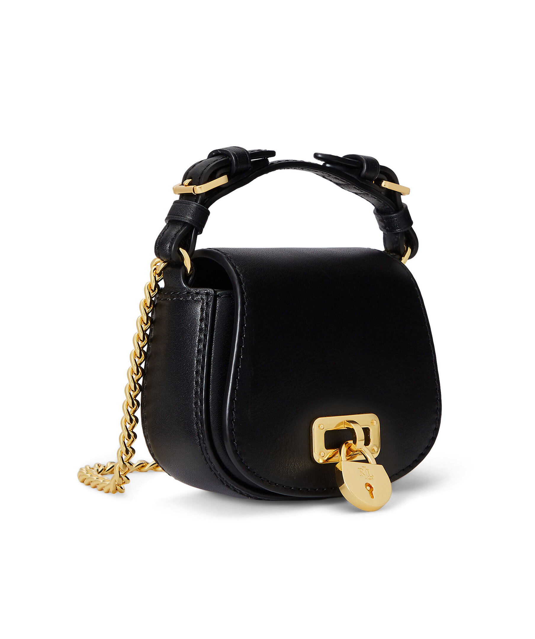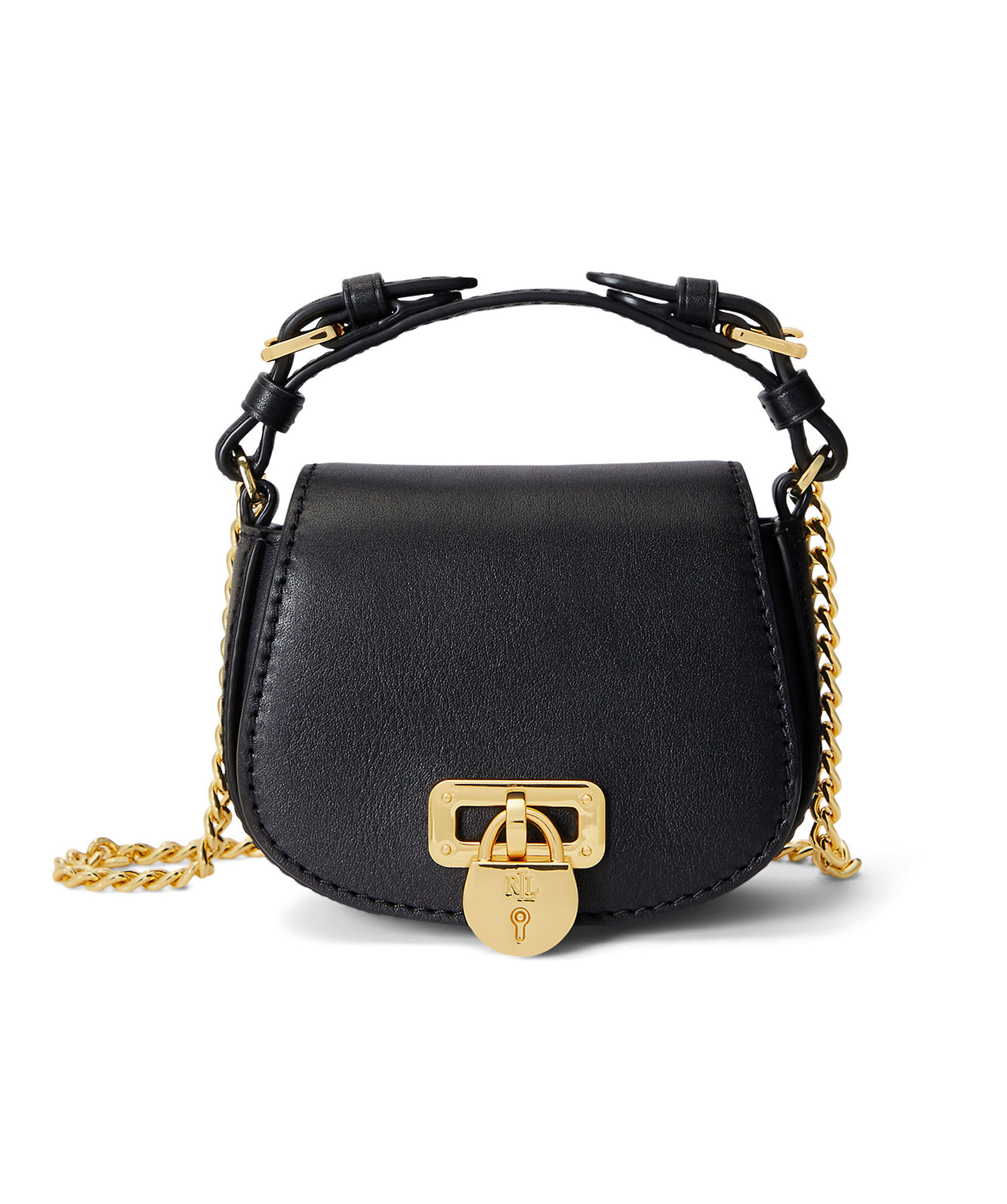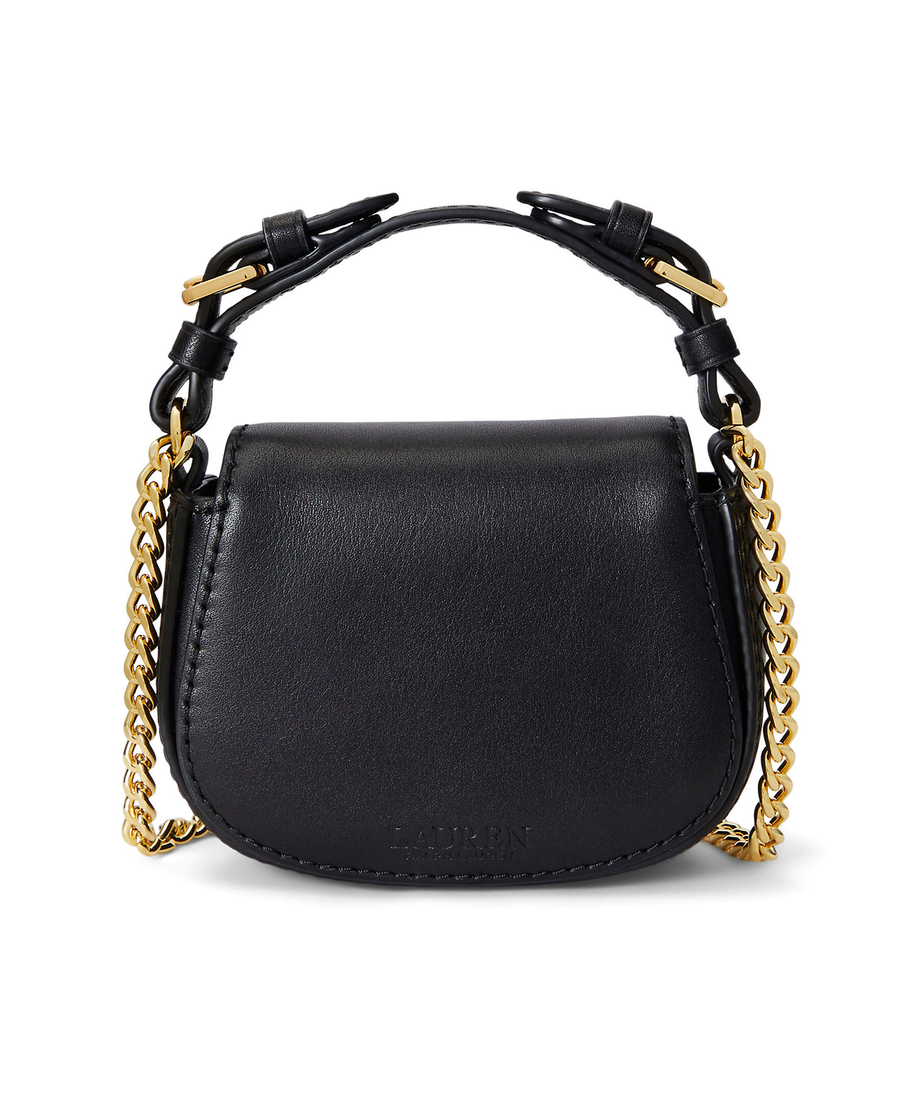Svart axelremsväska i läder från Lauren Ralph Lauren. Väsklock med magnetlås och guldfärgat lås på utsidan. Guldfärgad kedja som axelband. Väskans handtag är 4,5cm högt och den avtagbara axelremmen är 54cm hög.