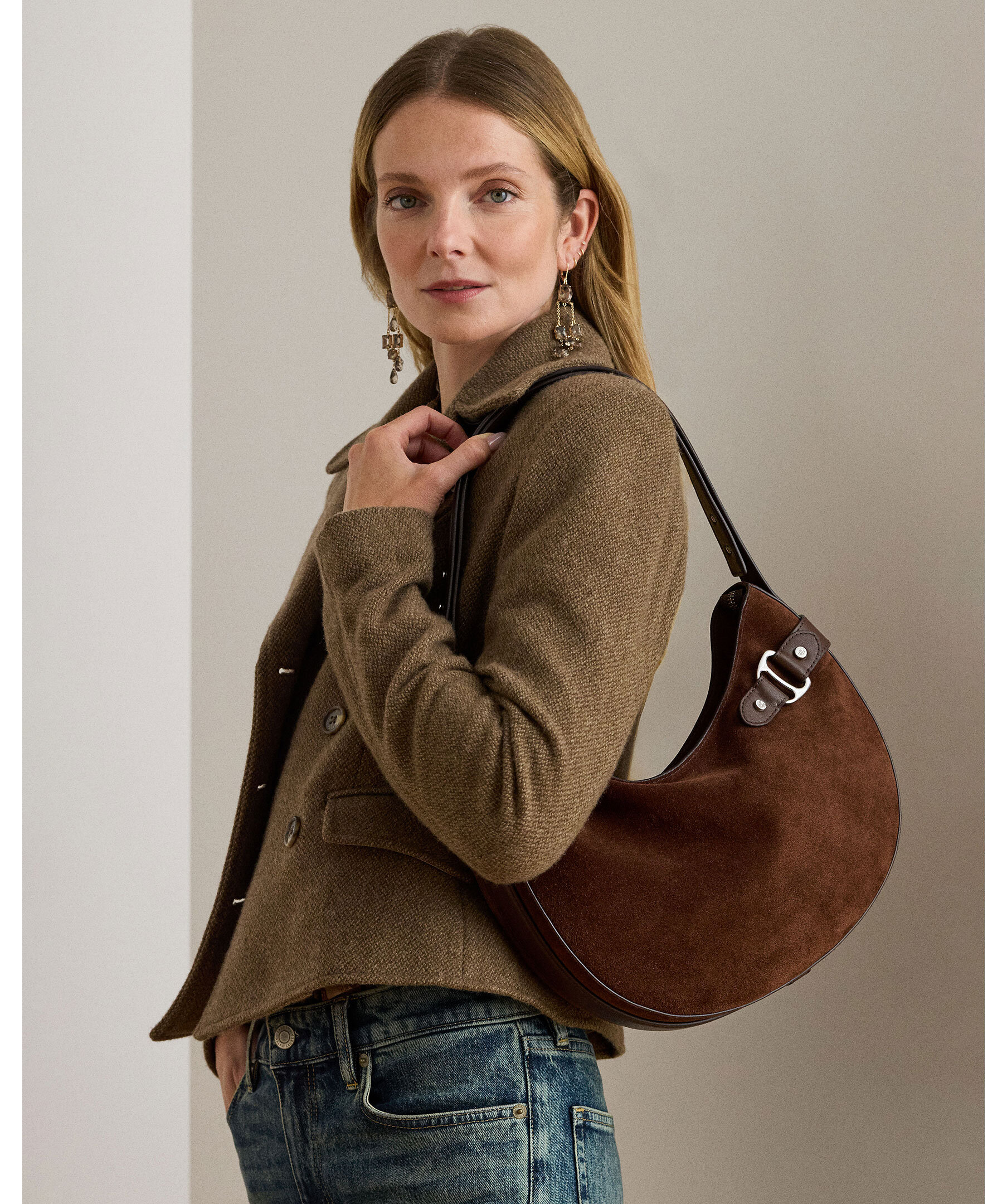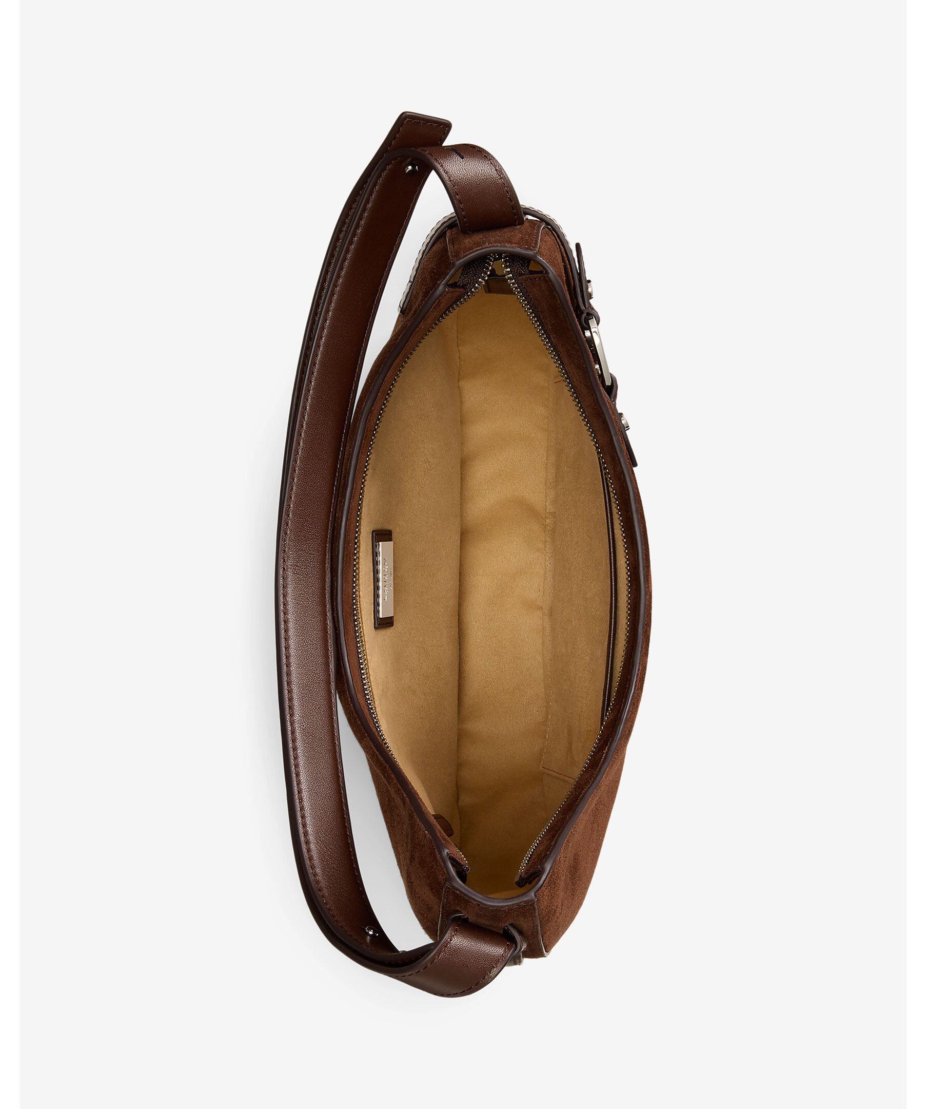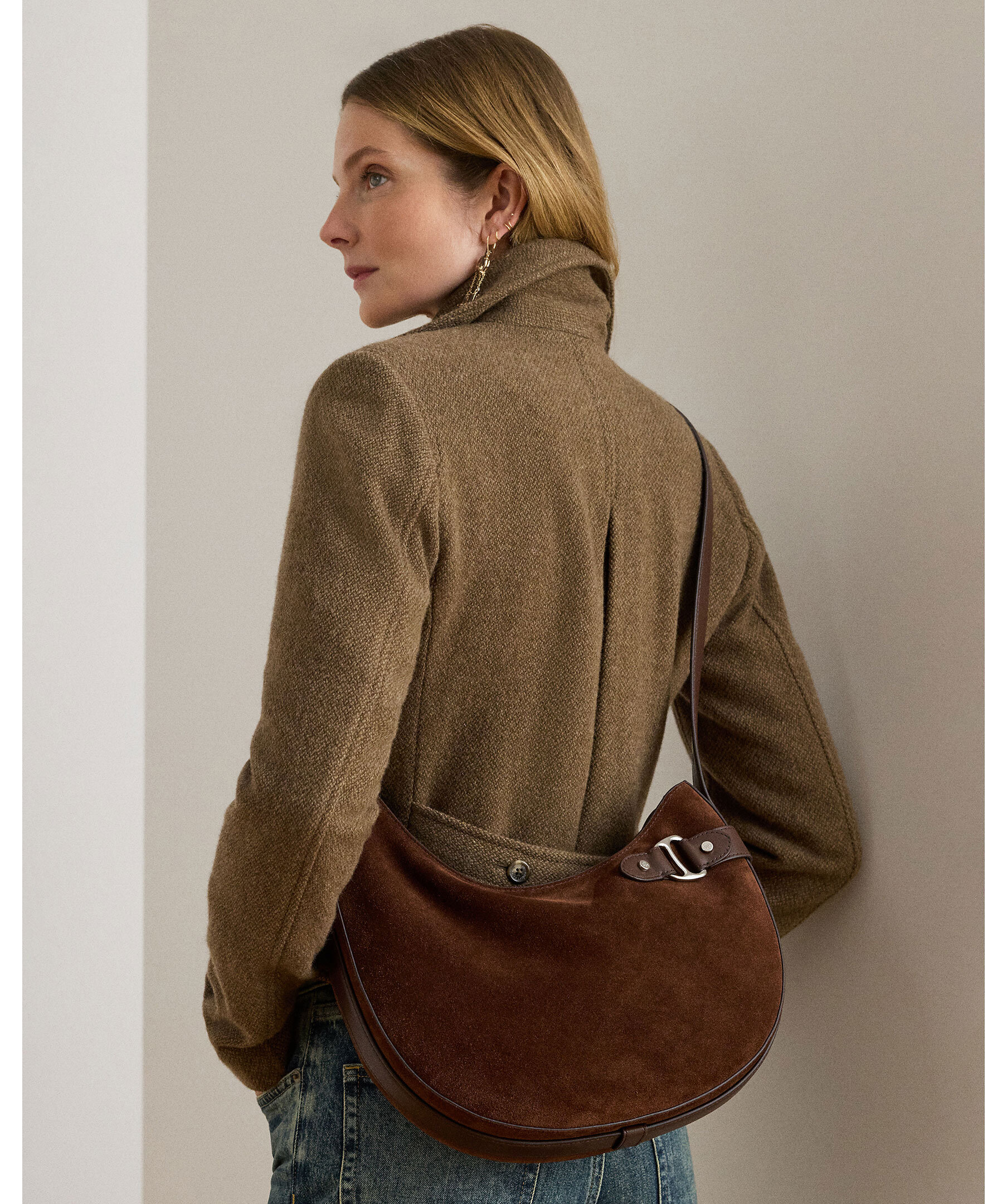 Brun axelväska i mockaläder från Lauren Ralph Lauren. Väskan stängs med dragkedja och har en invändig ficka och foder i polyester. Mått: H 30 cm, B 30 cm, D 6 cm, axelbandshöjd 46cm.