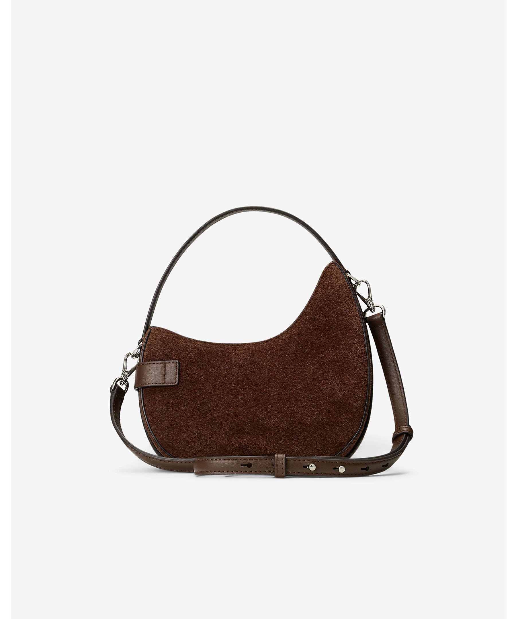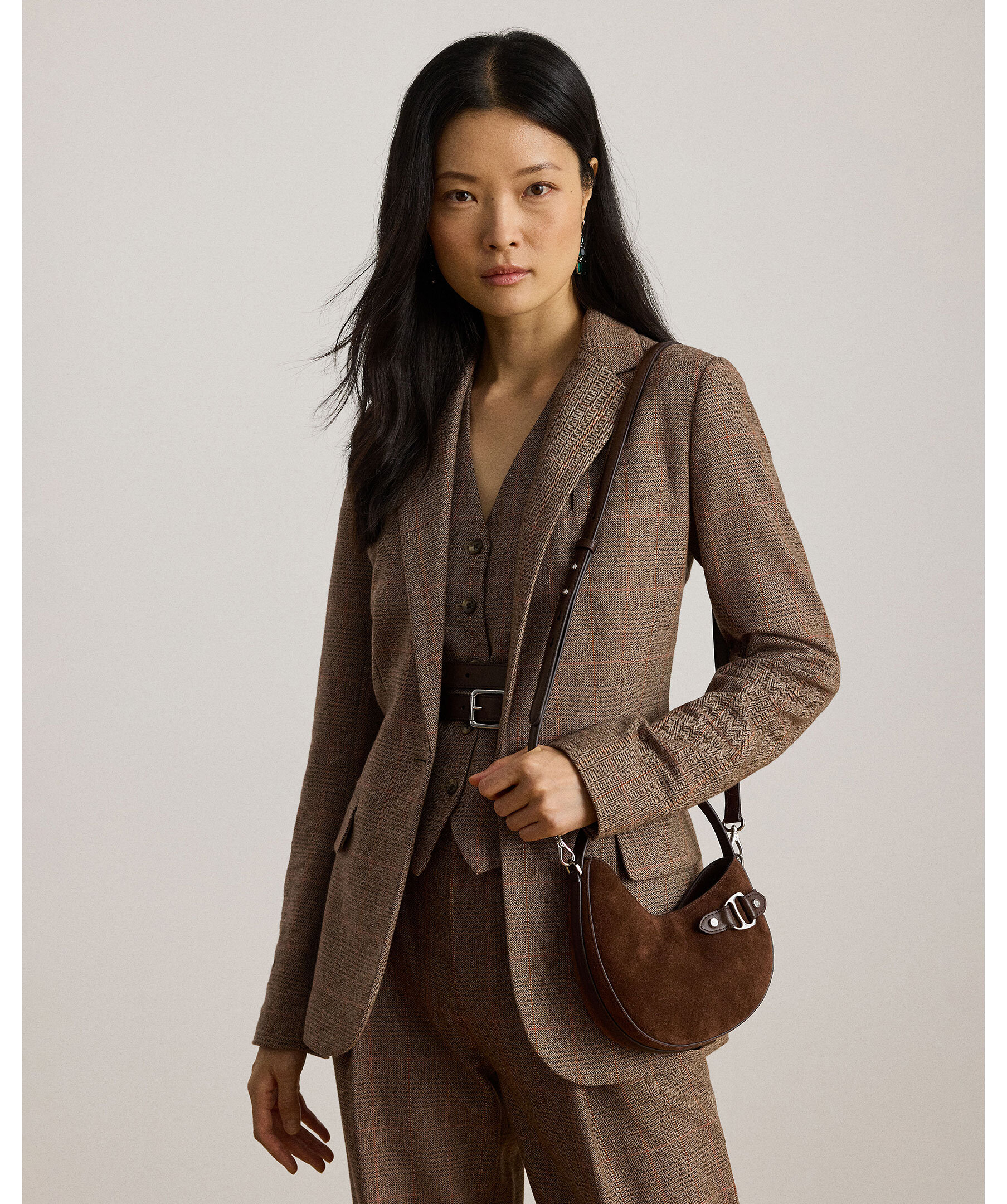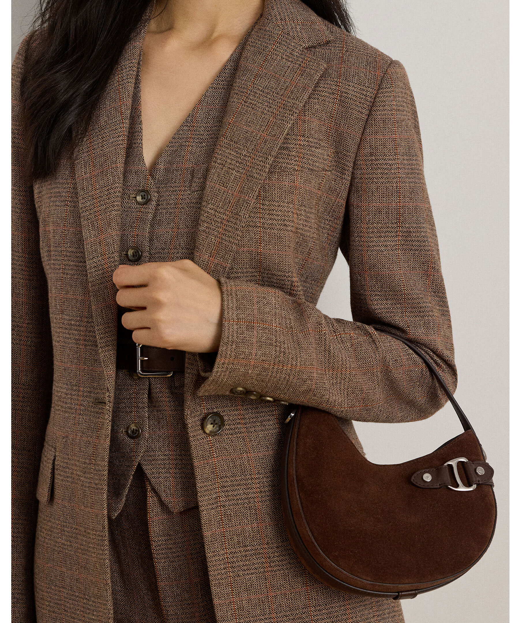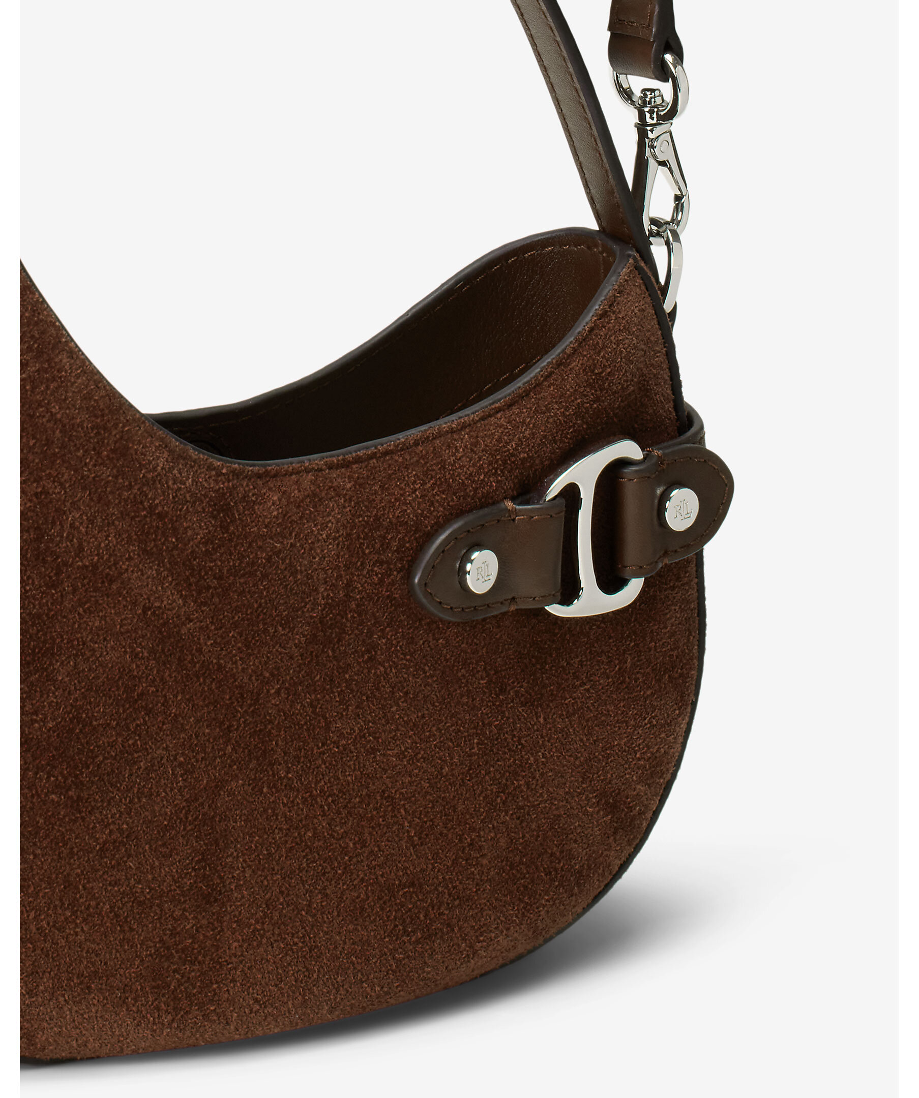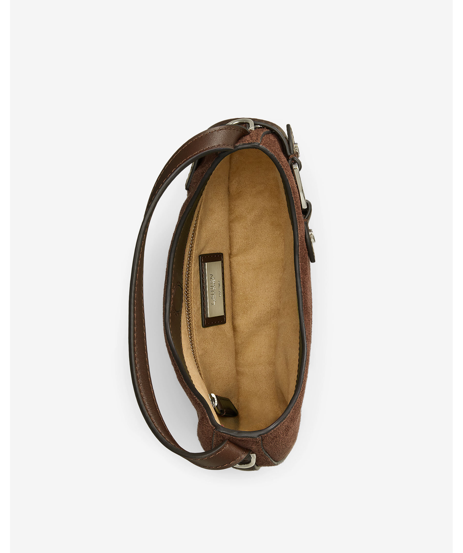 Brun handväska i mockaläder från Lauren Ralph Lauren. Väskan stängs med magnetstängning och har en avtagbar axelrem, invändig ficka och foder i polyester. Mått: H 19,5 cm, B 19,5 cm, D 5 cm, handtag: längd 12,5 cm, axelrem: justerbar och avtagbar, maxlängd 58,5 cm.