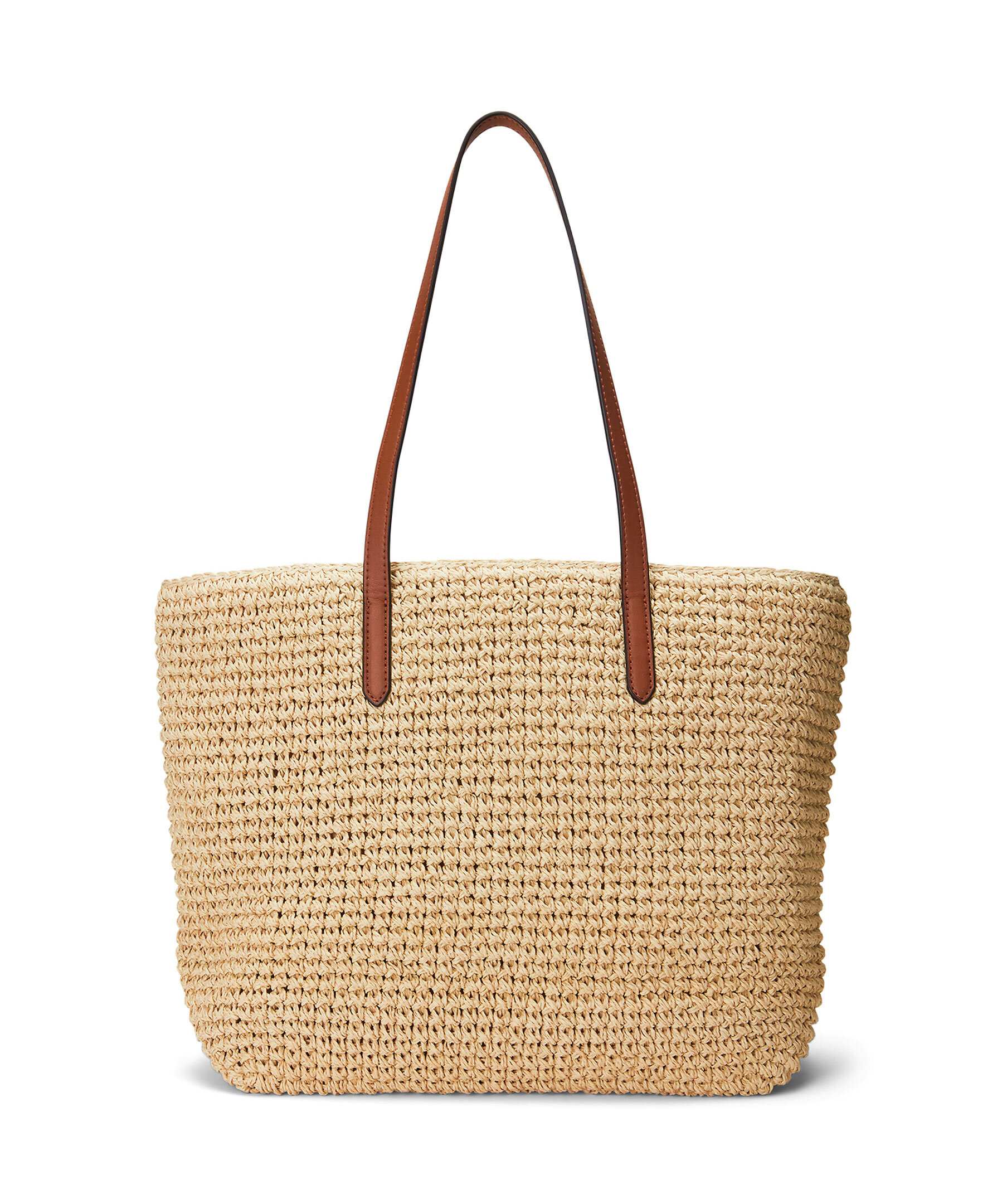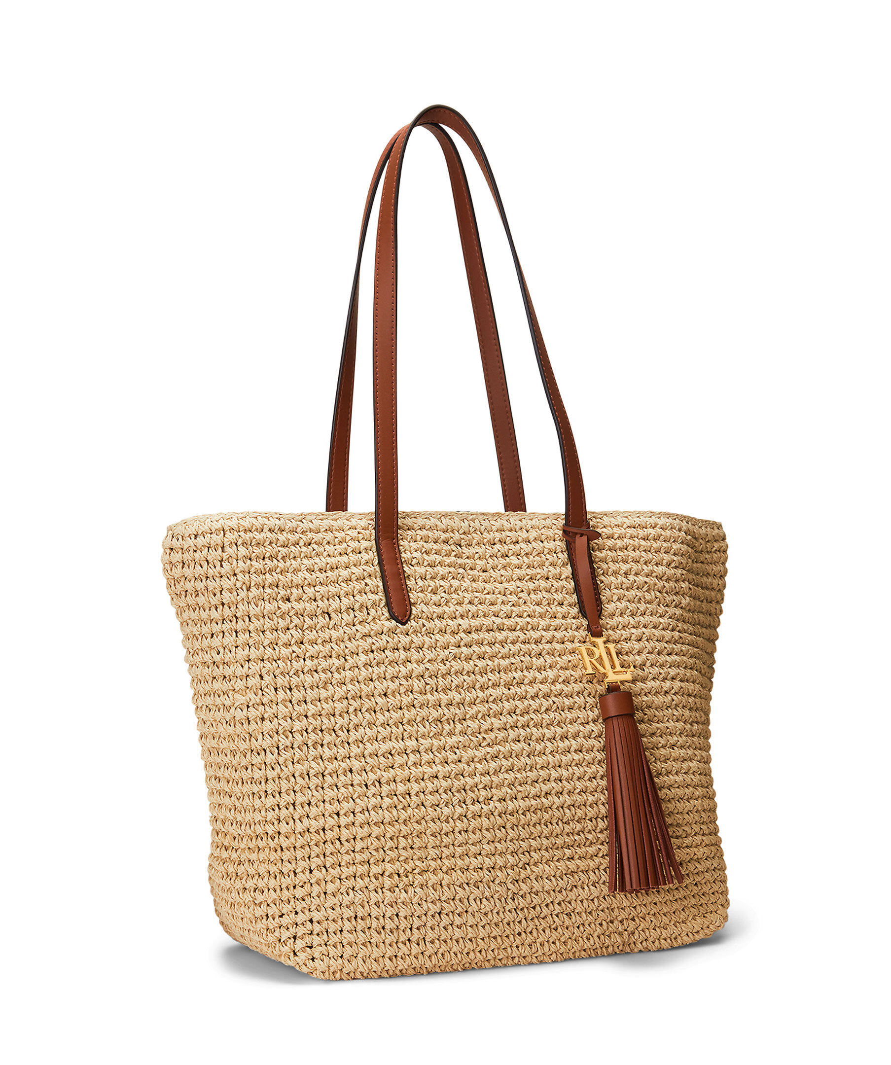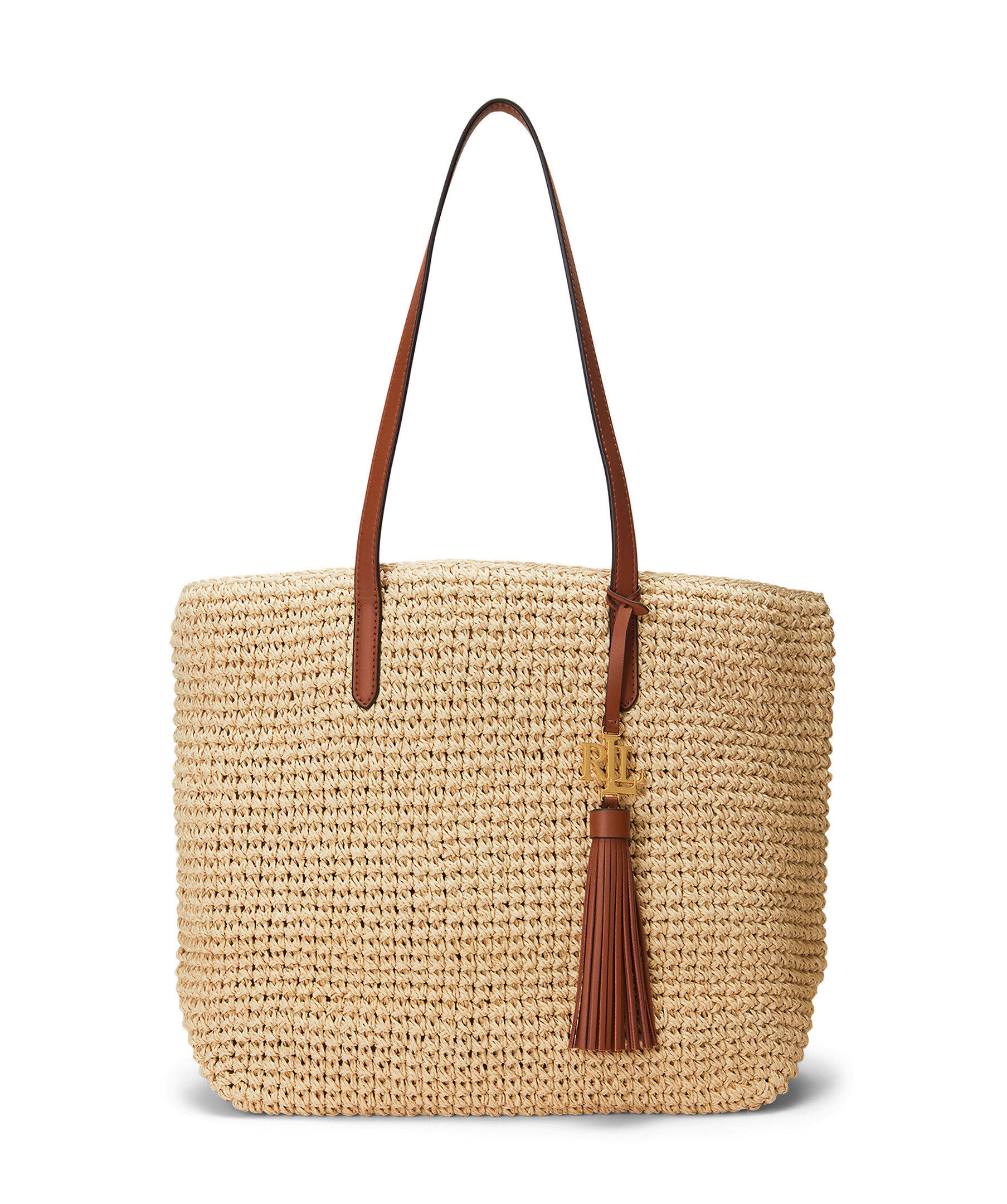 Strandväska från Lauren Ralph Lauren. Väskan har bruna detaljer, en avtagbar "LRL"-väskacharm, två övre handtag och en magnetisk stängning. Den har också ett glidfack och ett blixtlåsficka inuti. Mått: B: 43cm, H: 30cm, D: 12cm.