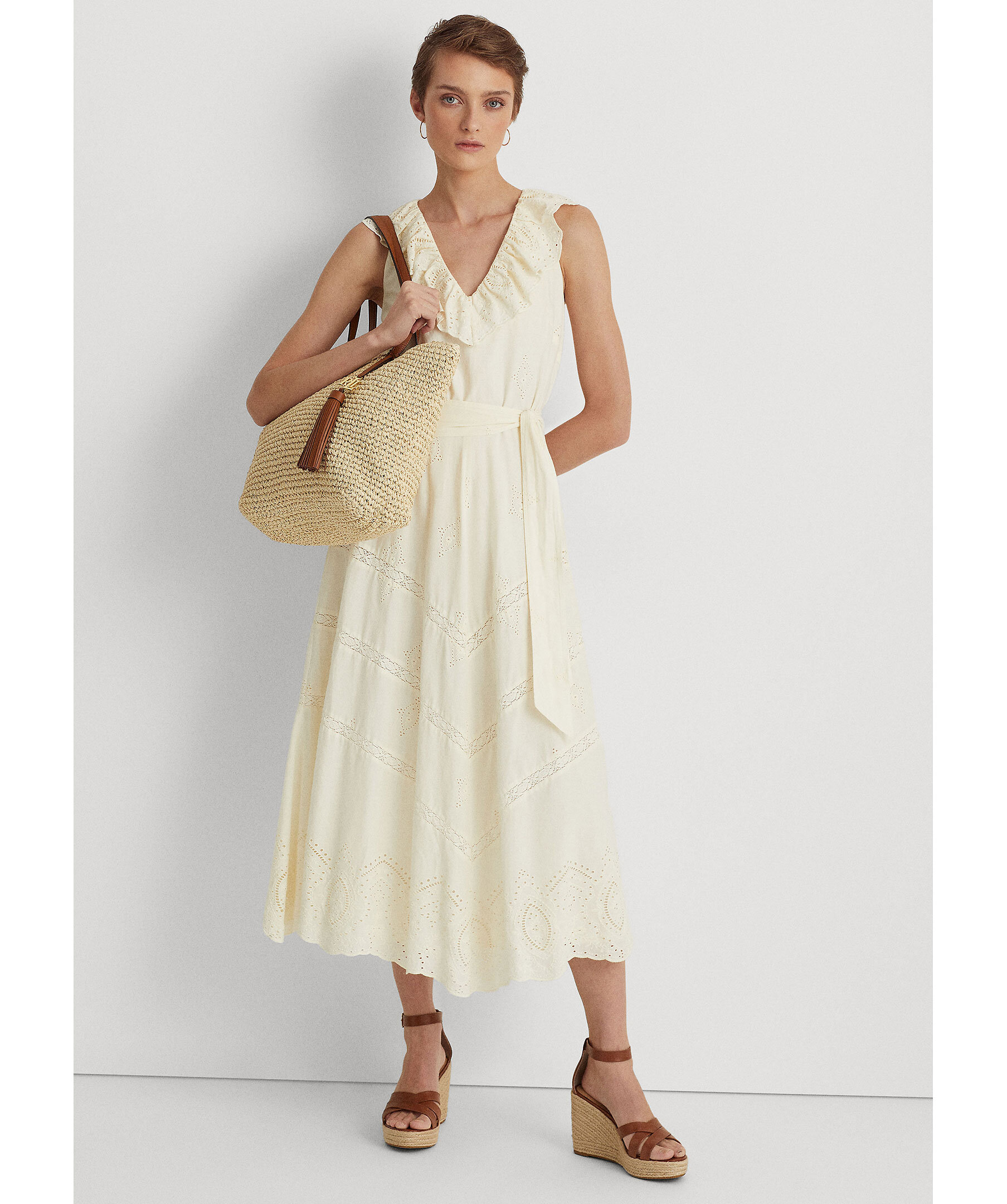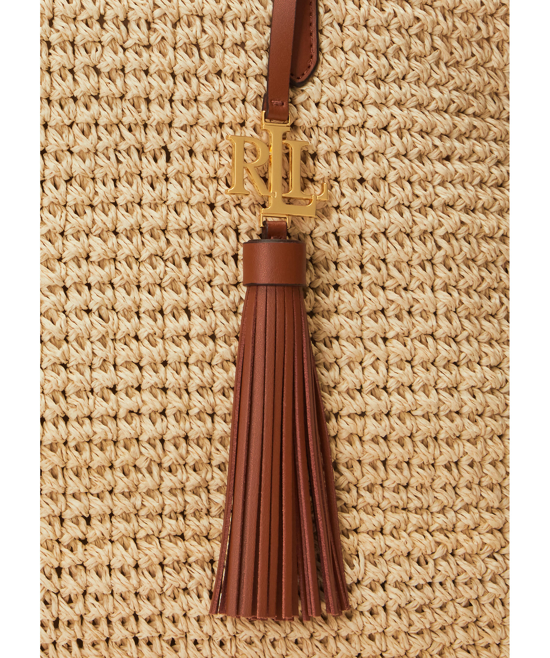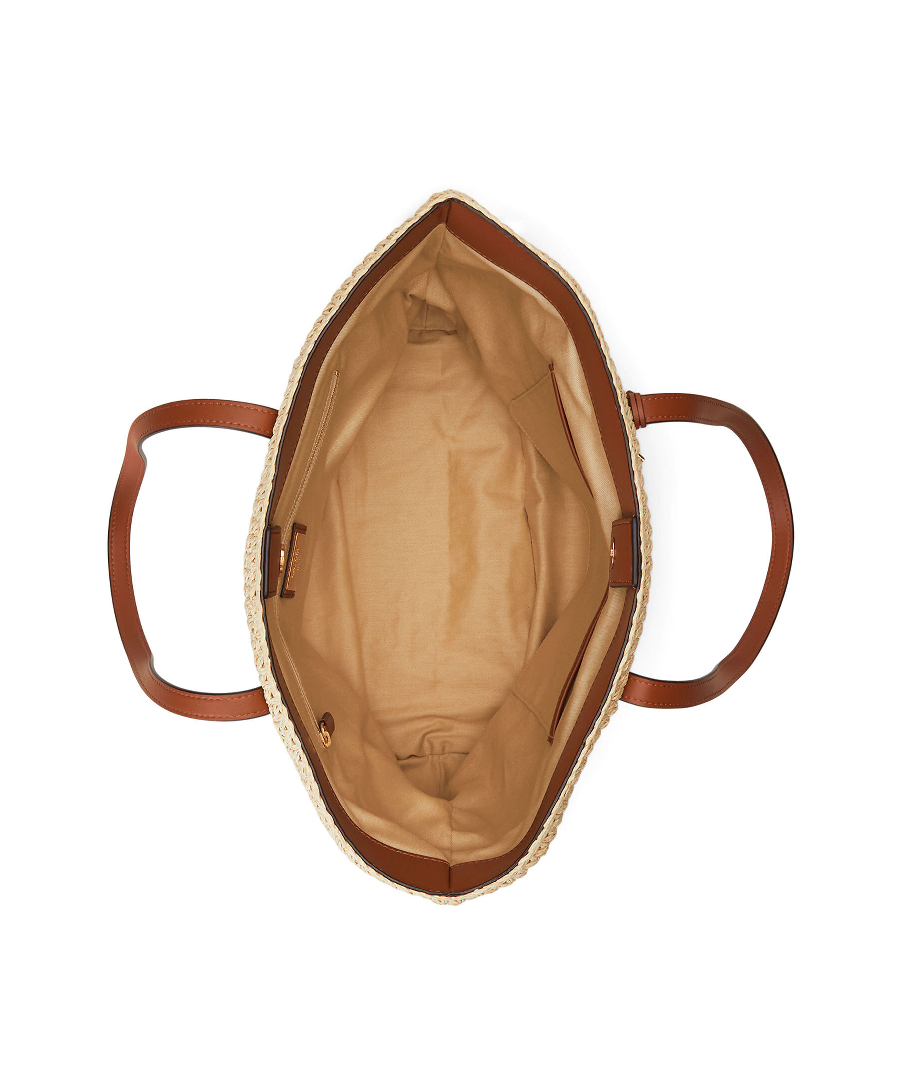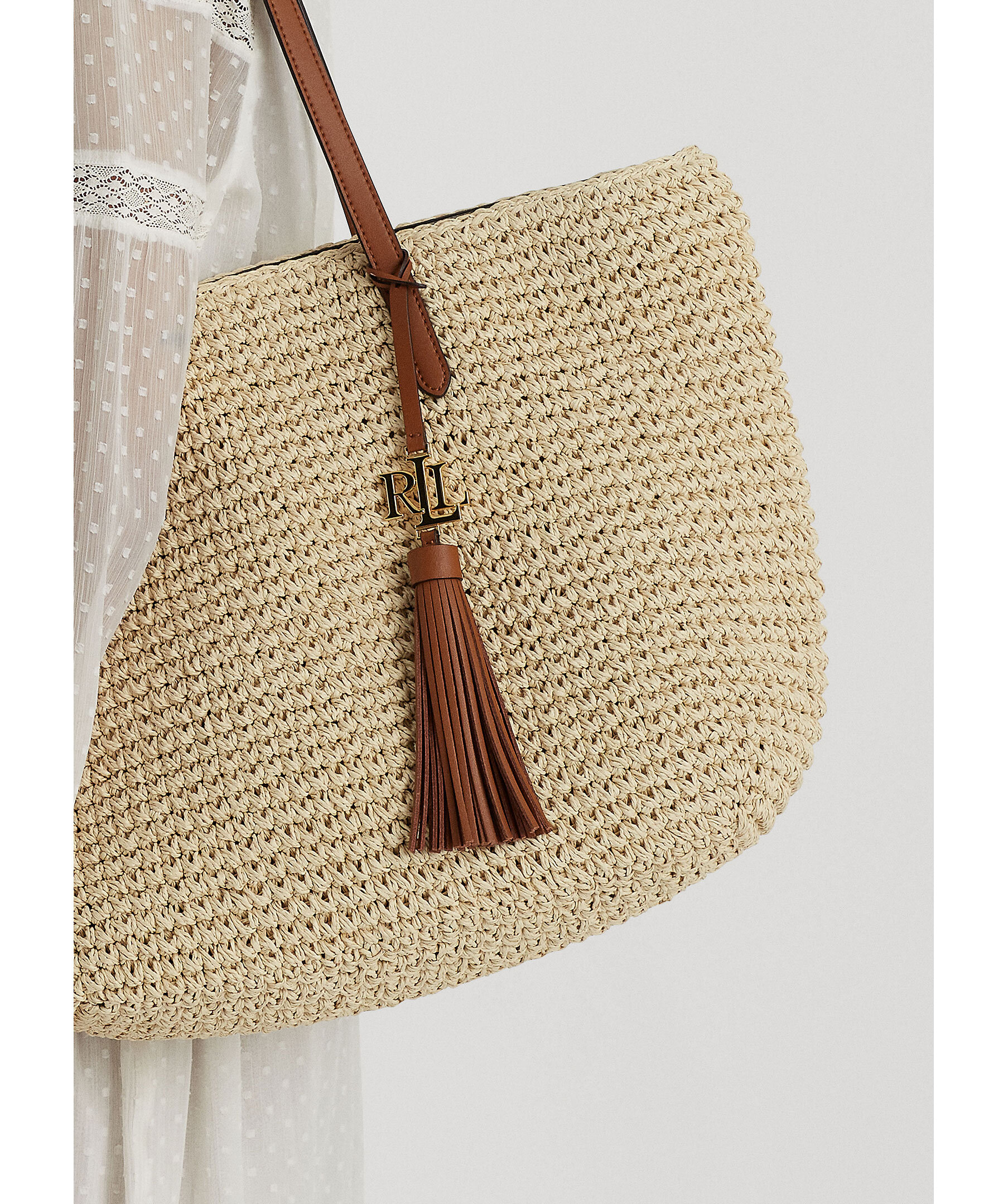 Strandväska från Lauren Ralph Lauren. Väskan har bruna detaljer, en avtagbar "LRL"-väskacharm, två övre handtag och en magnetisk stängning. Den har också ett glidfack och ett blixtlåsficka inuti. Mått: B: 43cm, H: 30cm, D: 12cm.