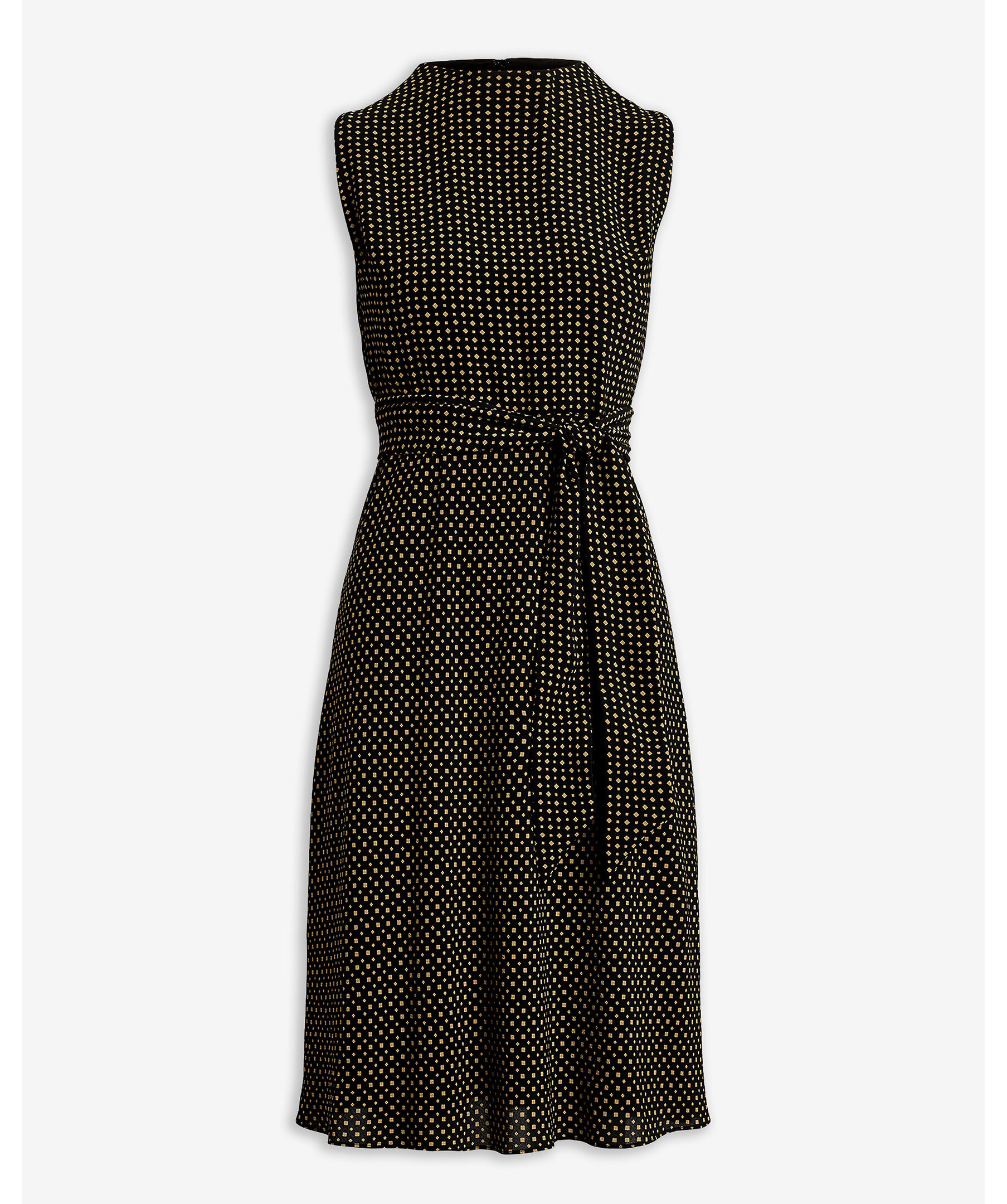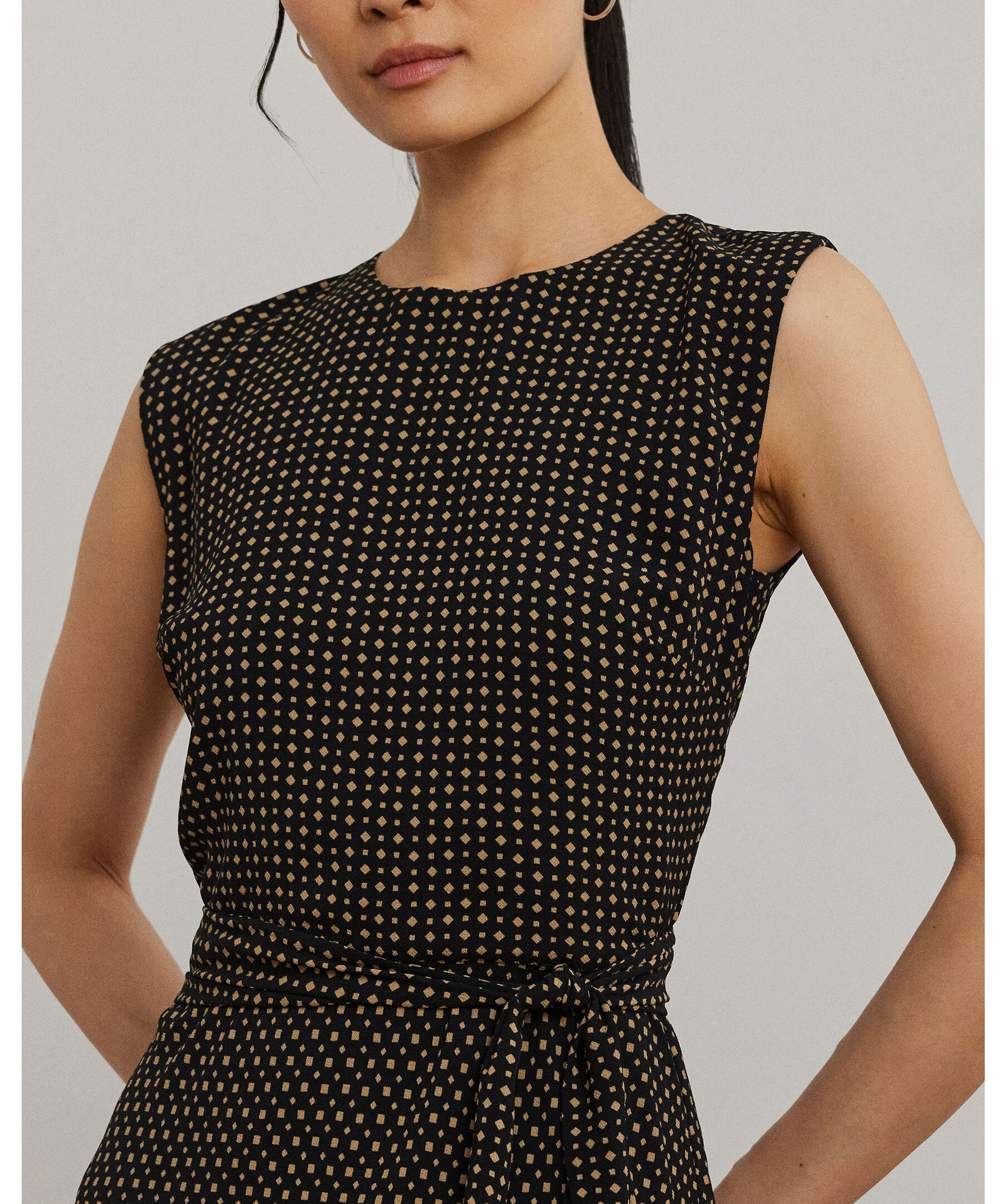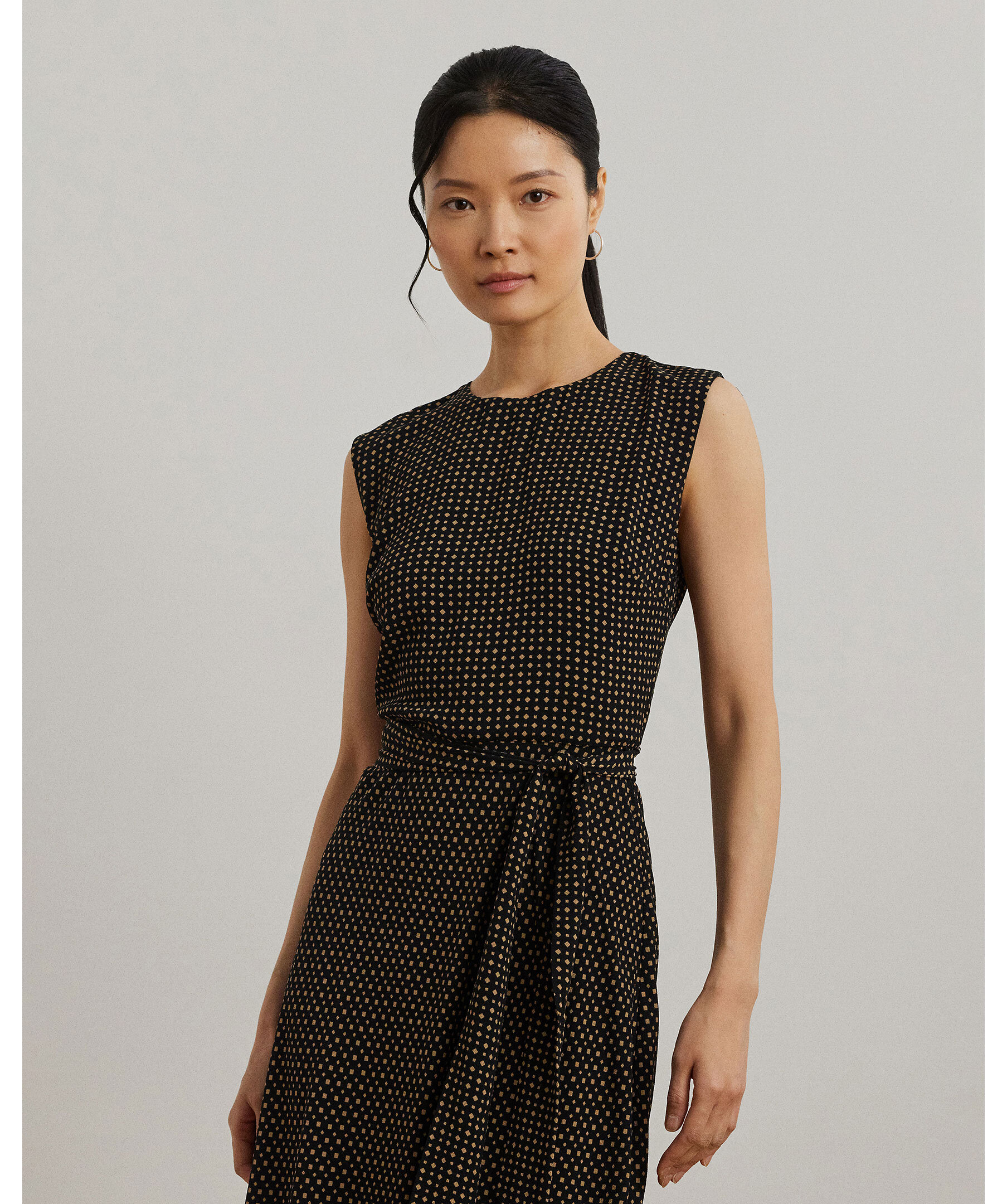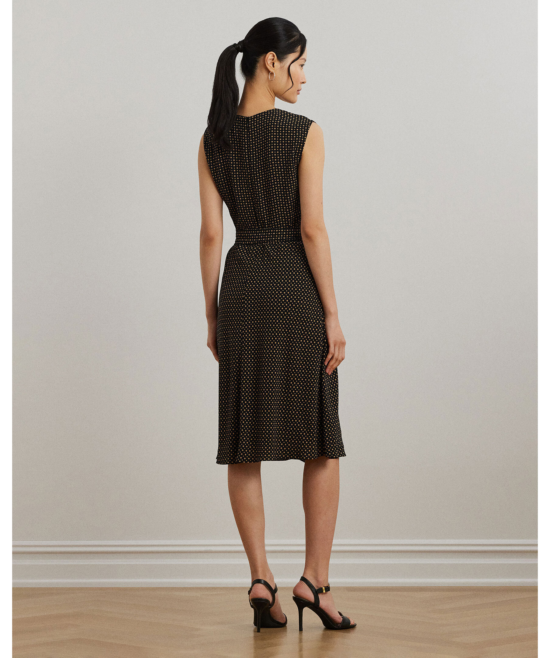 En elegant klänning i bubble crepe med tvåfärgat geometriskt mönster från Lauren Ralph Lauren. Den har cap-ärmar, rund hals och ett avtagbart midjebälte som markerar siluetten. Den A-linjeformade modellen faller strax under knät och ger en luftig, sofistikerad look.