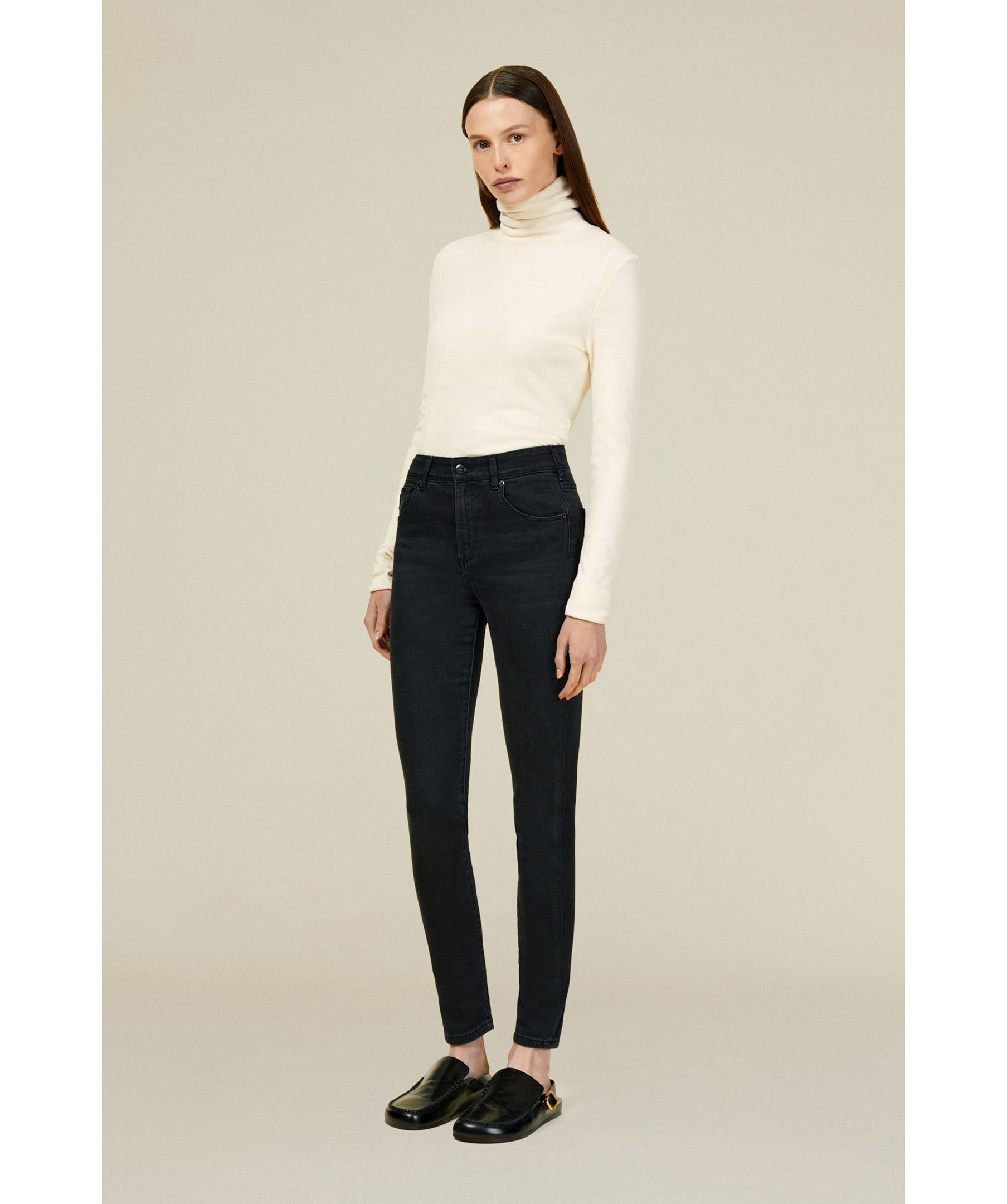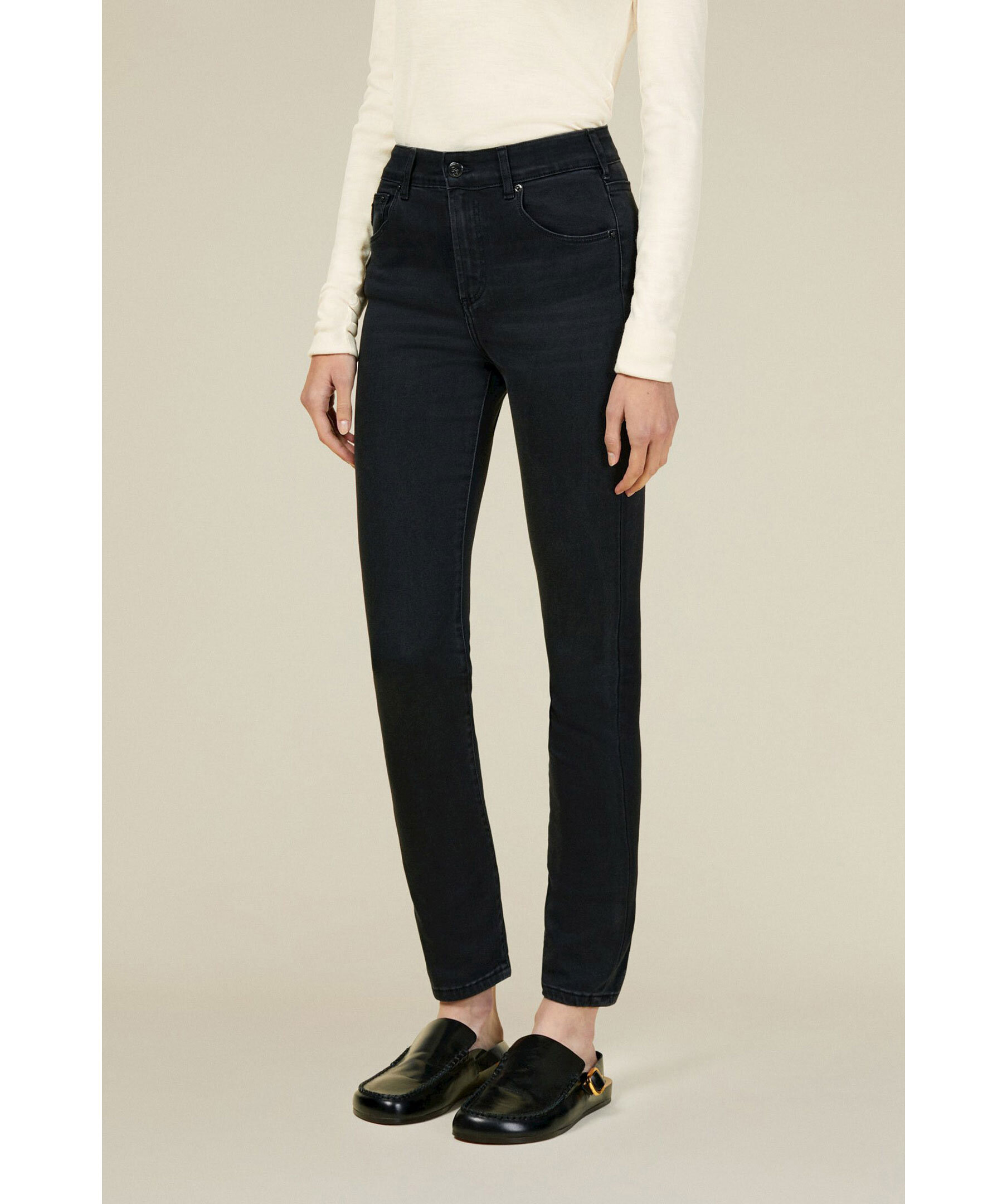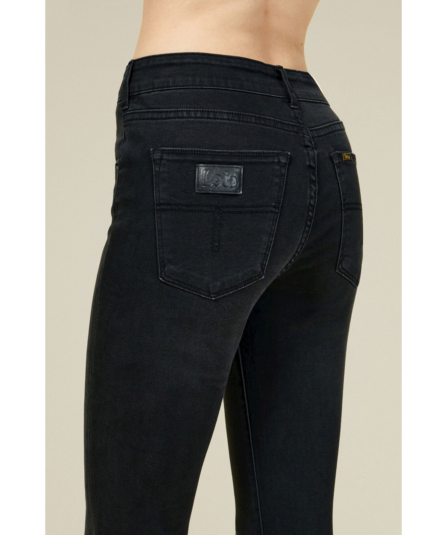 Svarta jeans från Lois. Jeansen slutar vid anklarna och har hög midja, fem fickor, logotyp-patch på ena bakfickan samt bälteshällor i midjan. Smal passform. Tillverkade i en bomullsblandning.