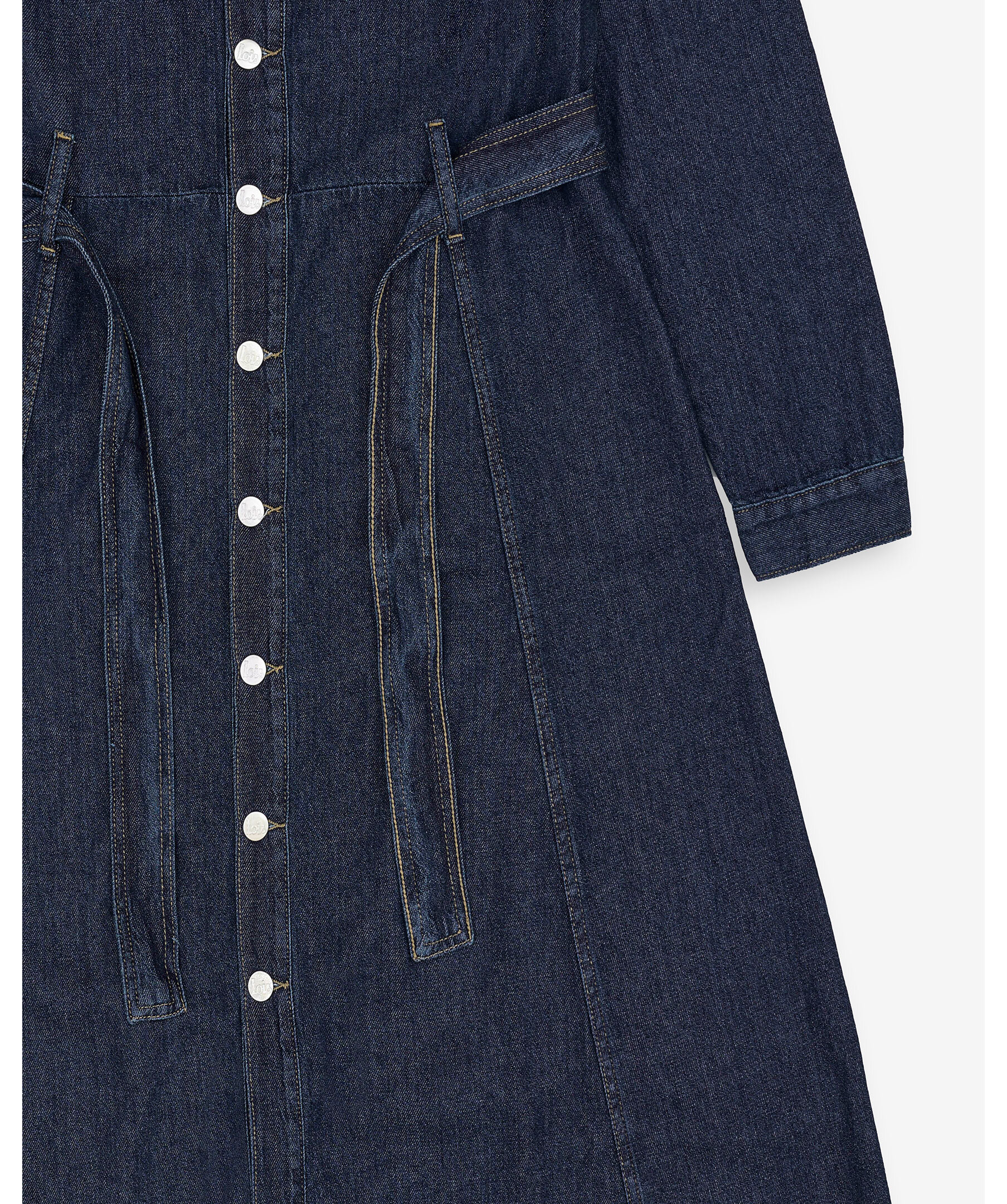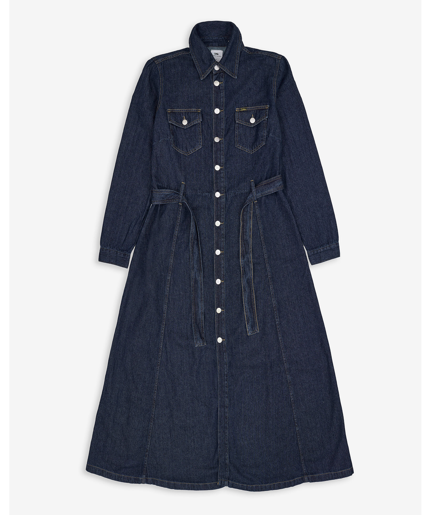 Mörkblå jeansklänning från Lois. Stängs med knappar och har ett avtagbart bälte i midjan. Två bröstfickor, midi-längd.