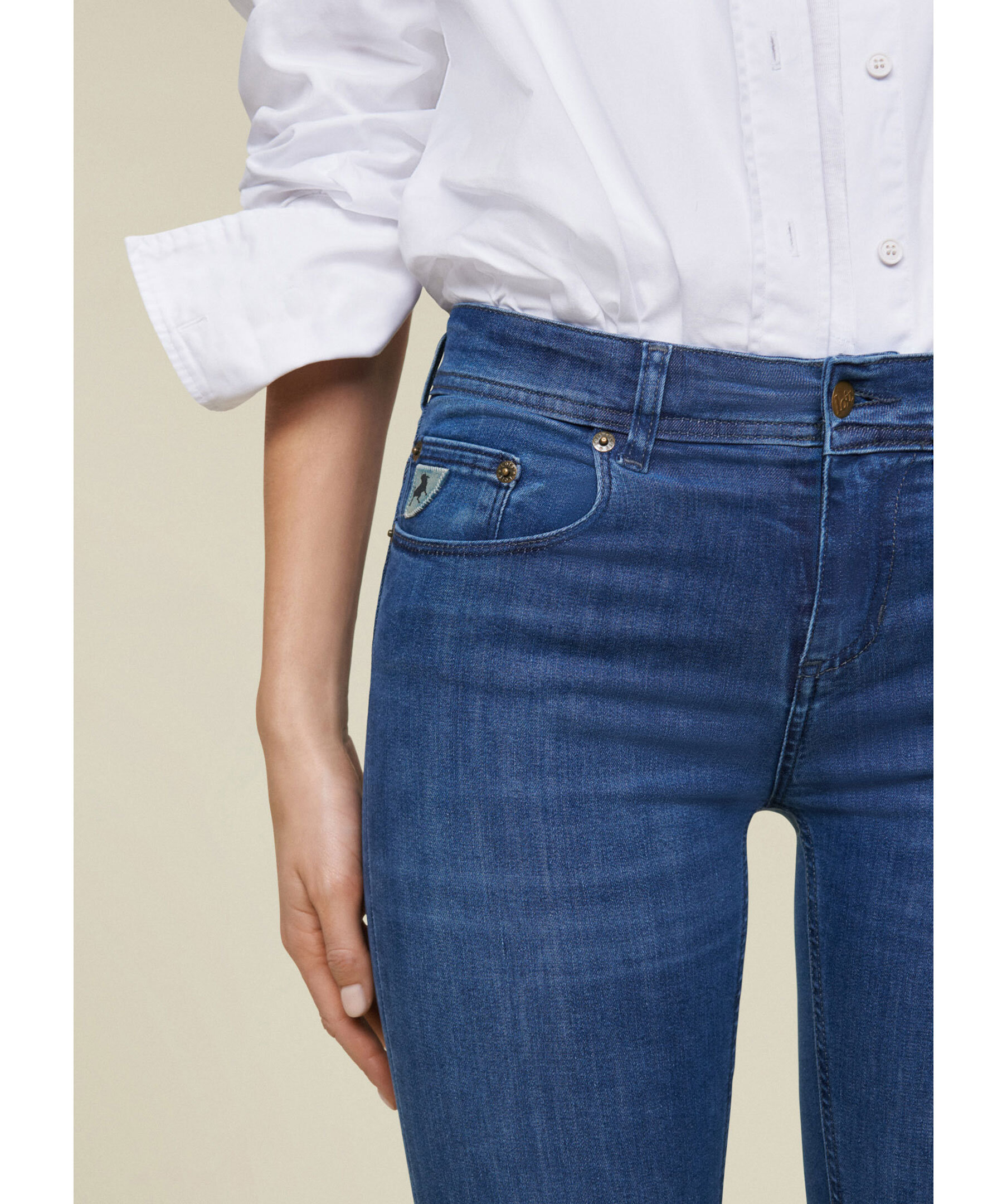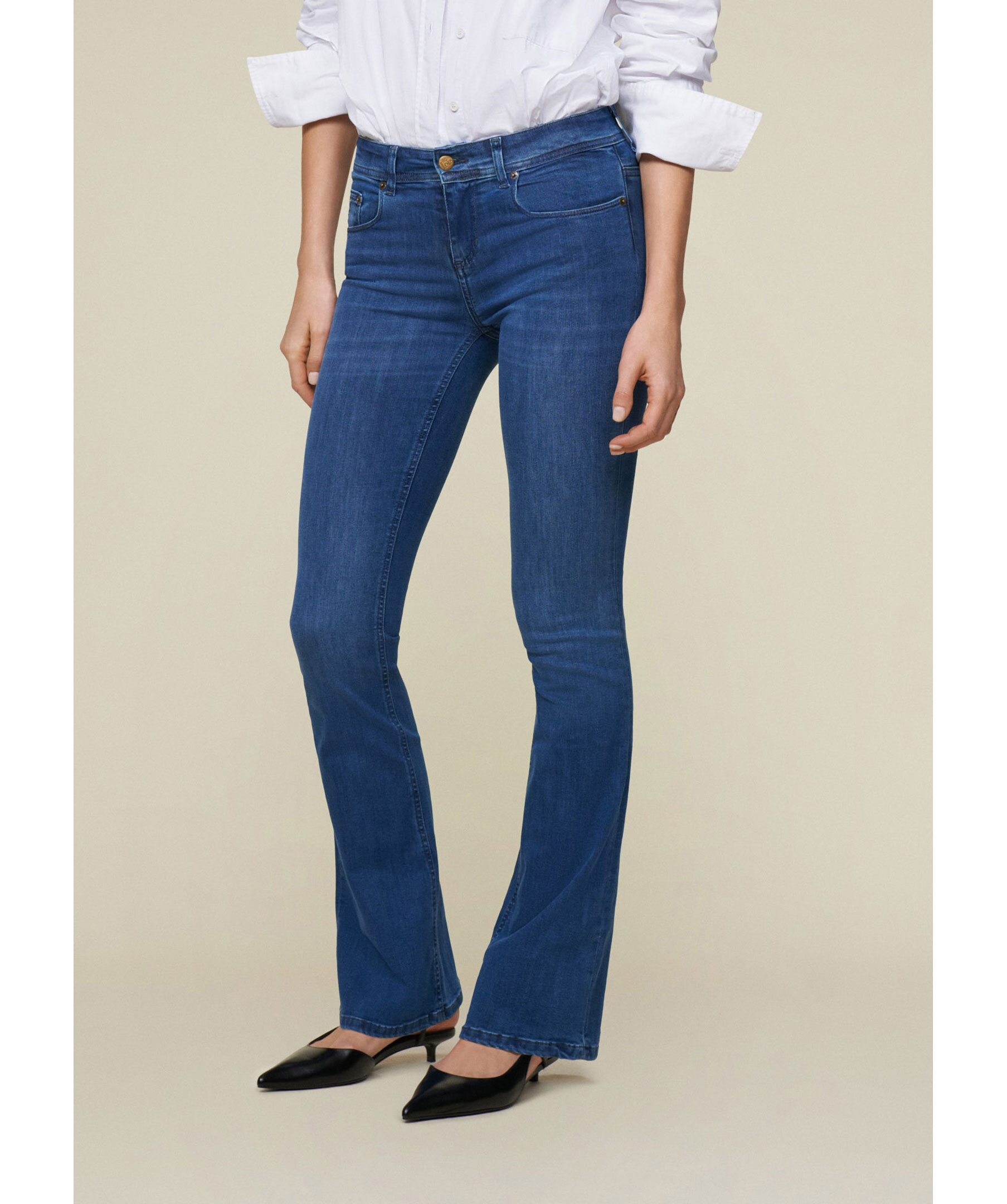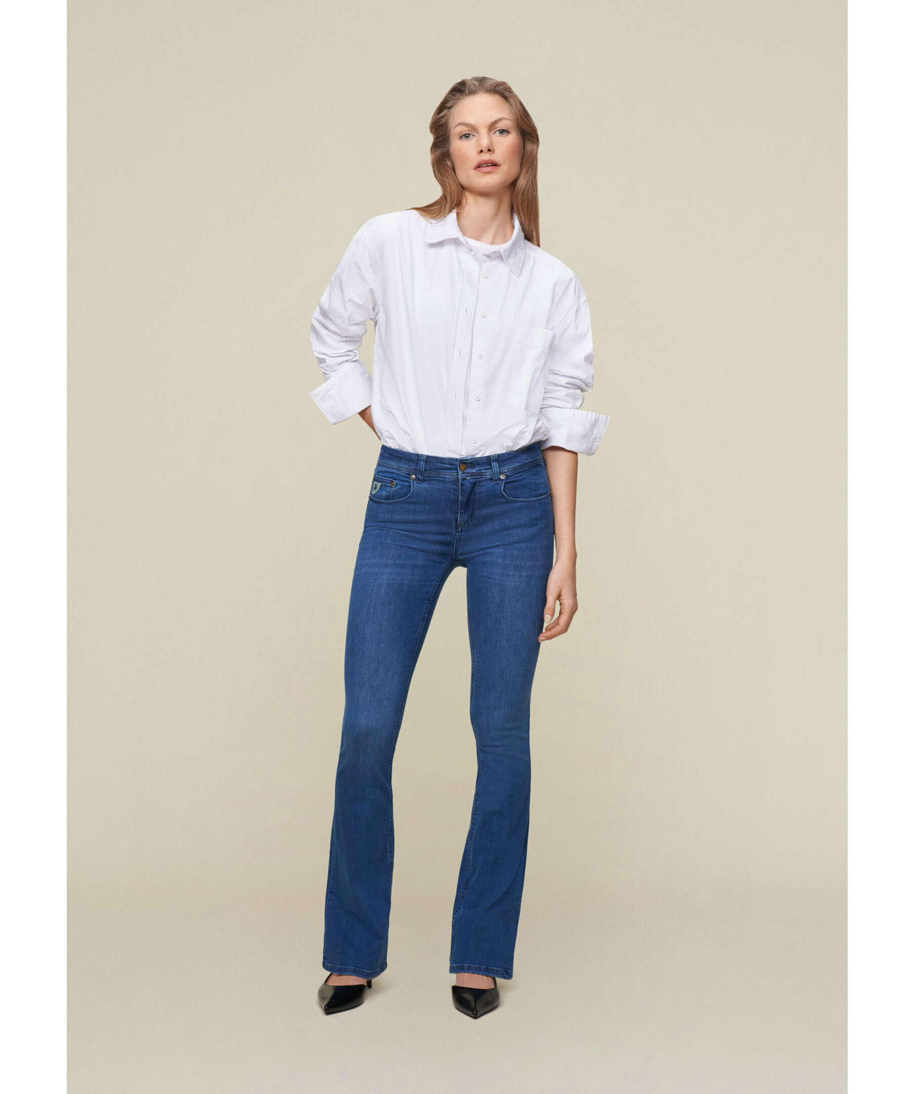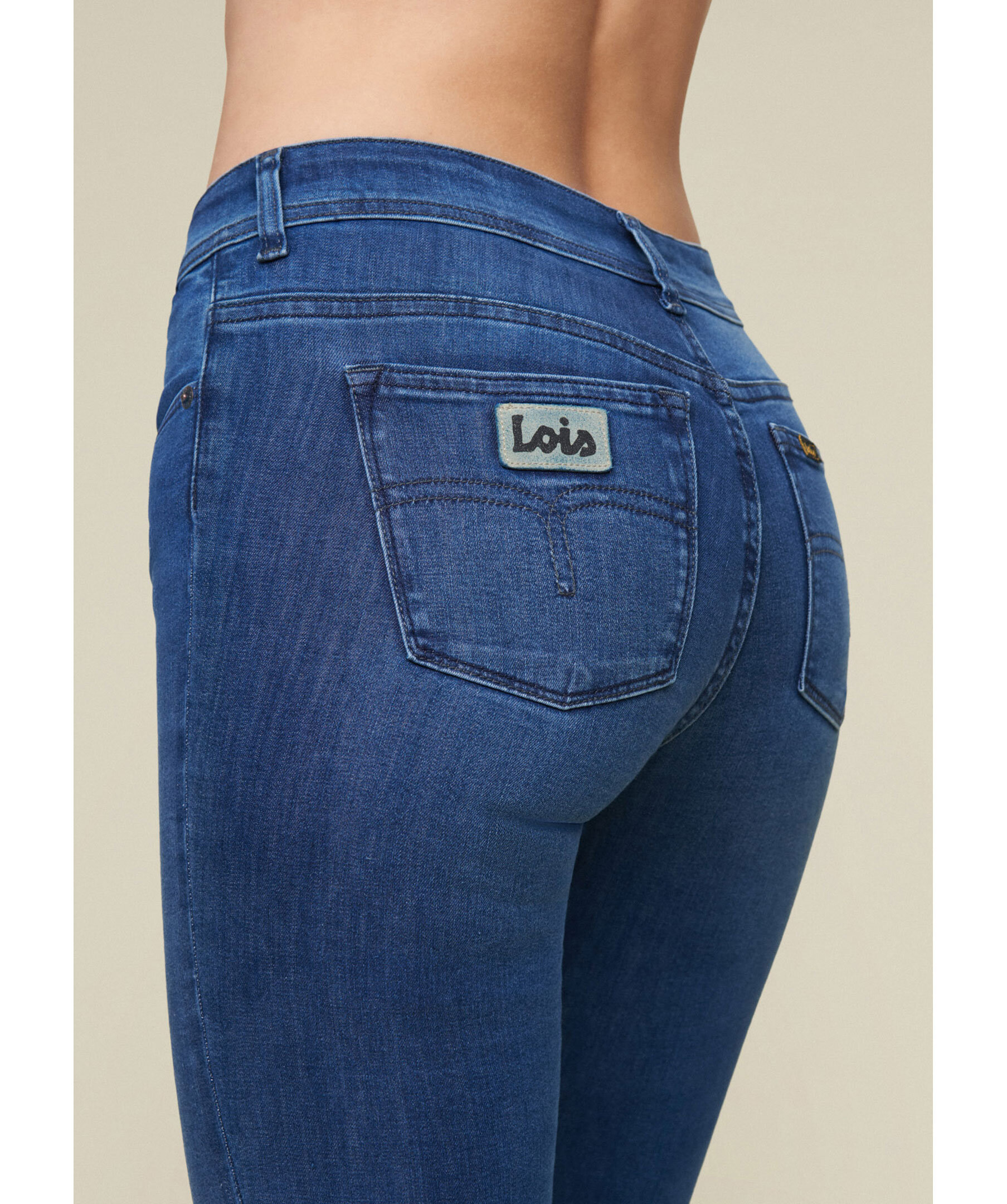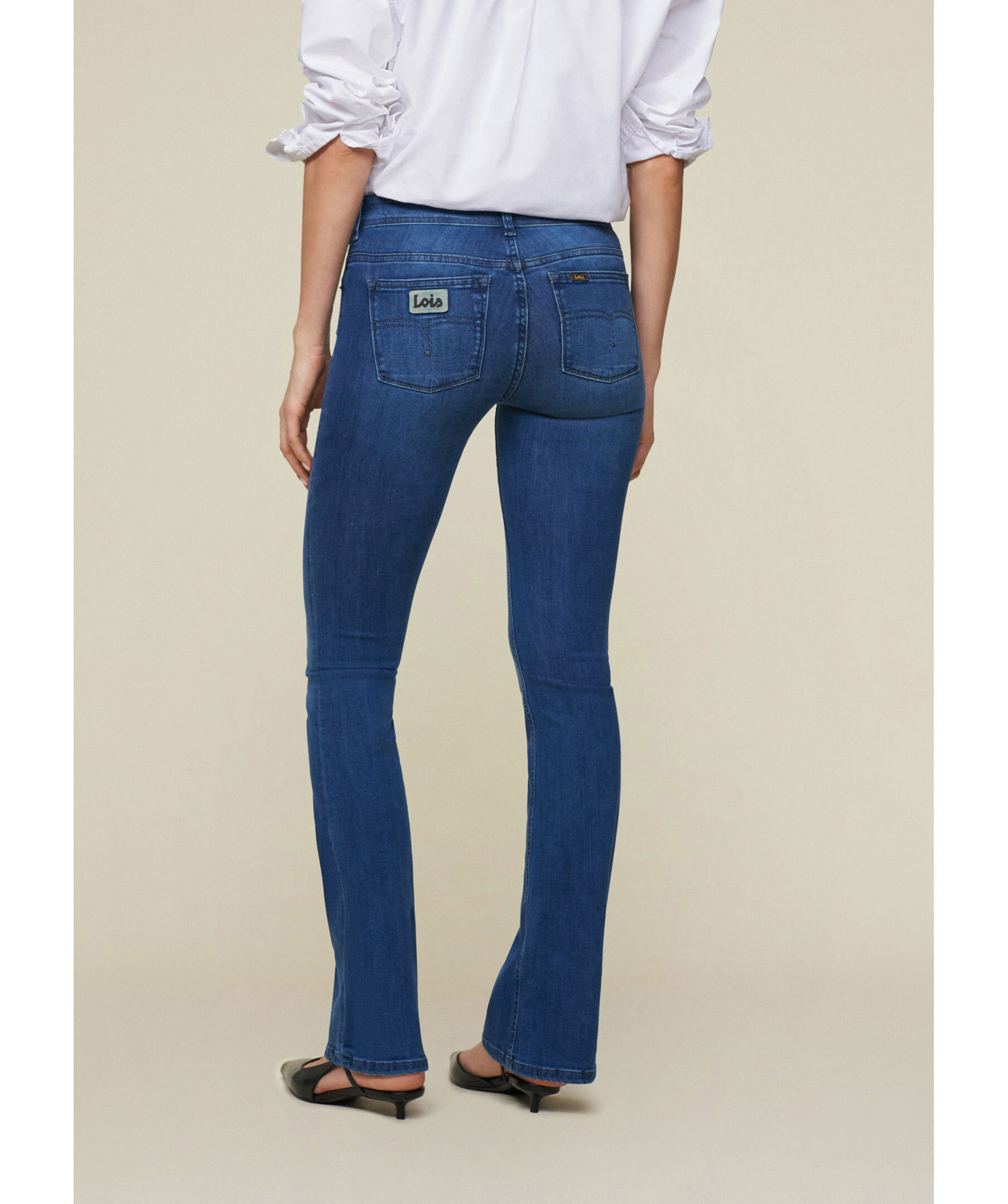 Blåa jeans från Lois. Jeansen har hög midja, fem fickor, logotyp-patch på ena bakfickan samt bälteshällor i midjan. Utsvängda ben. Tillverkade i en bomullsblandning.