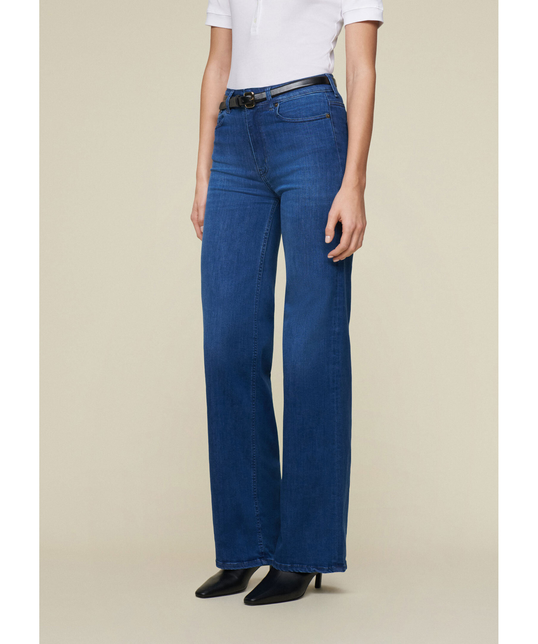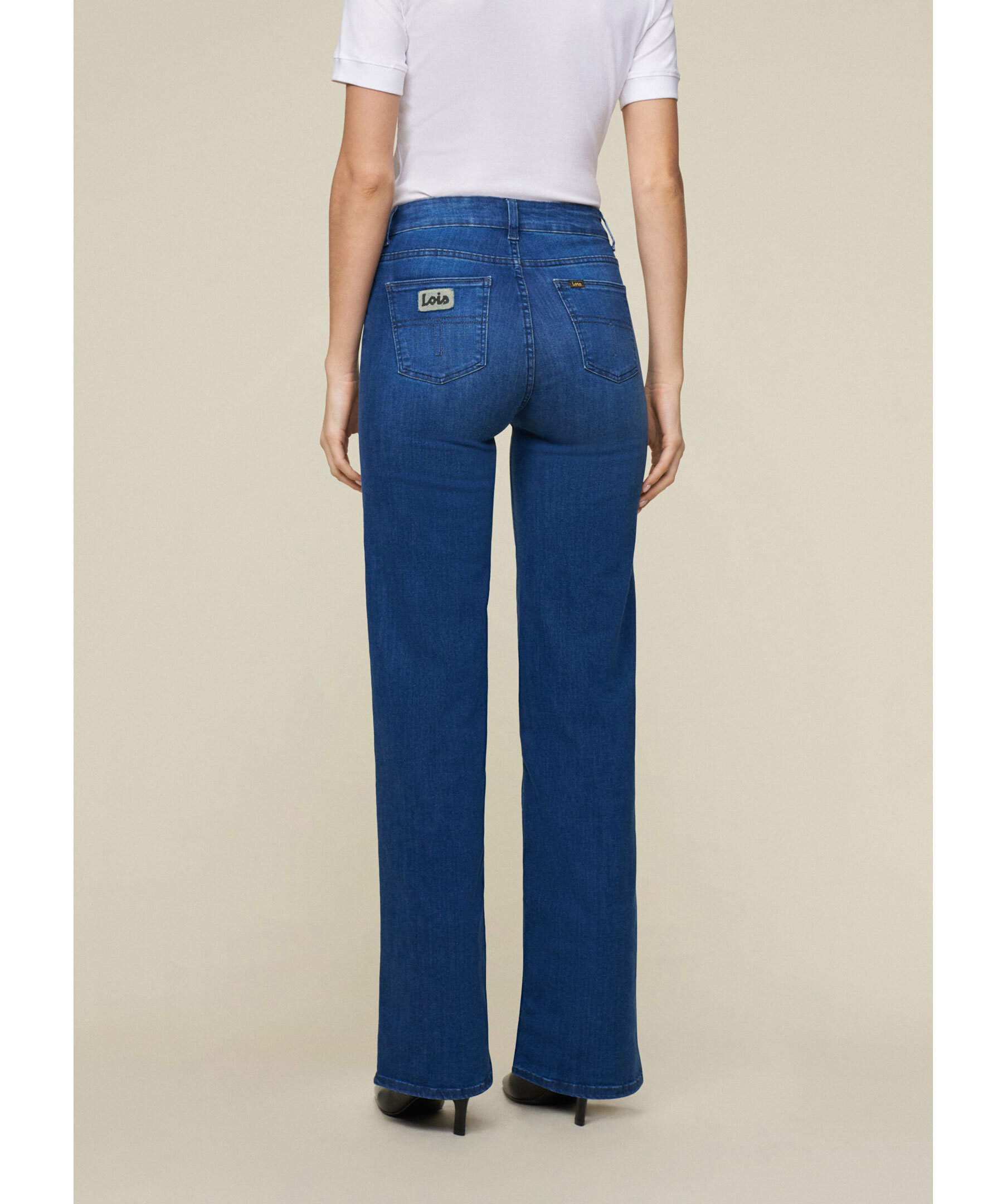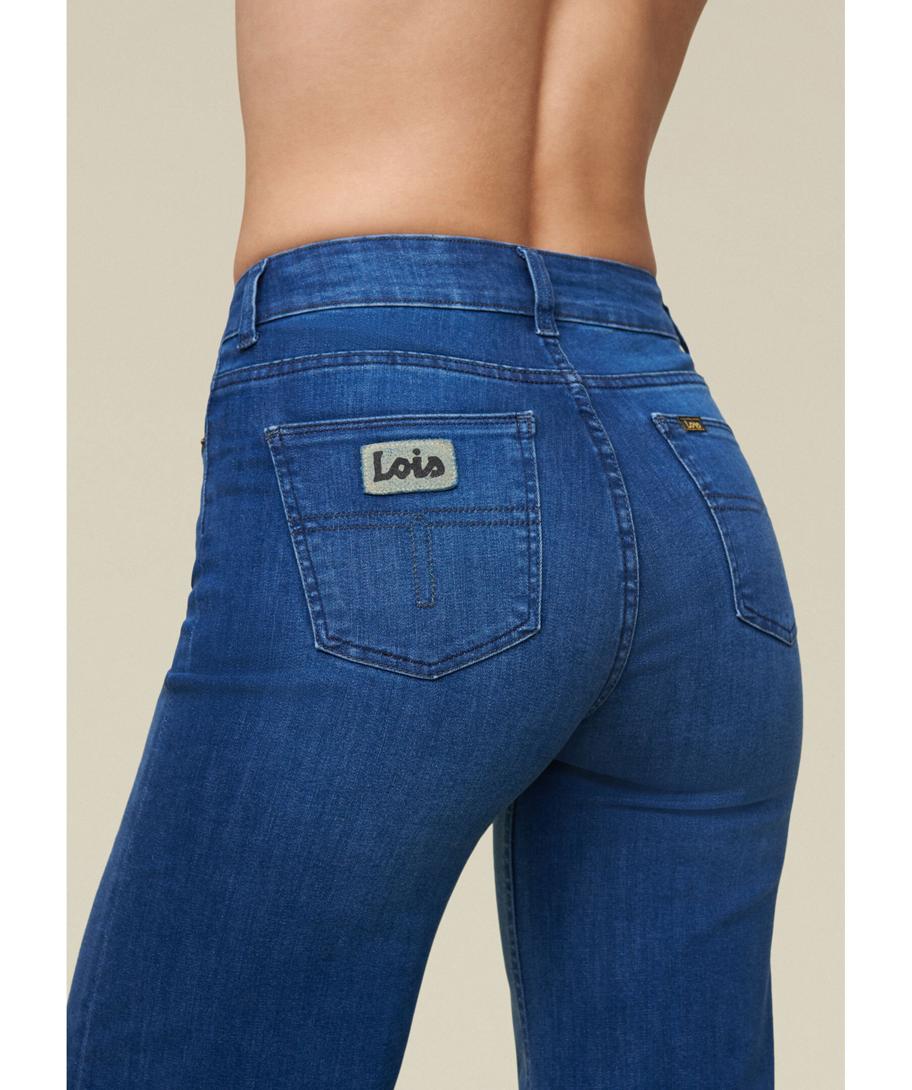 Blåa jeans från Lois. Hög midja med bälteshällor. Fem fickor. Utsvängda ben. Tillverkade i en bomullsblandning.