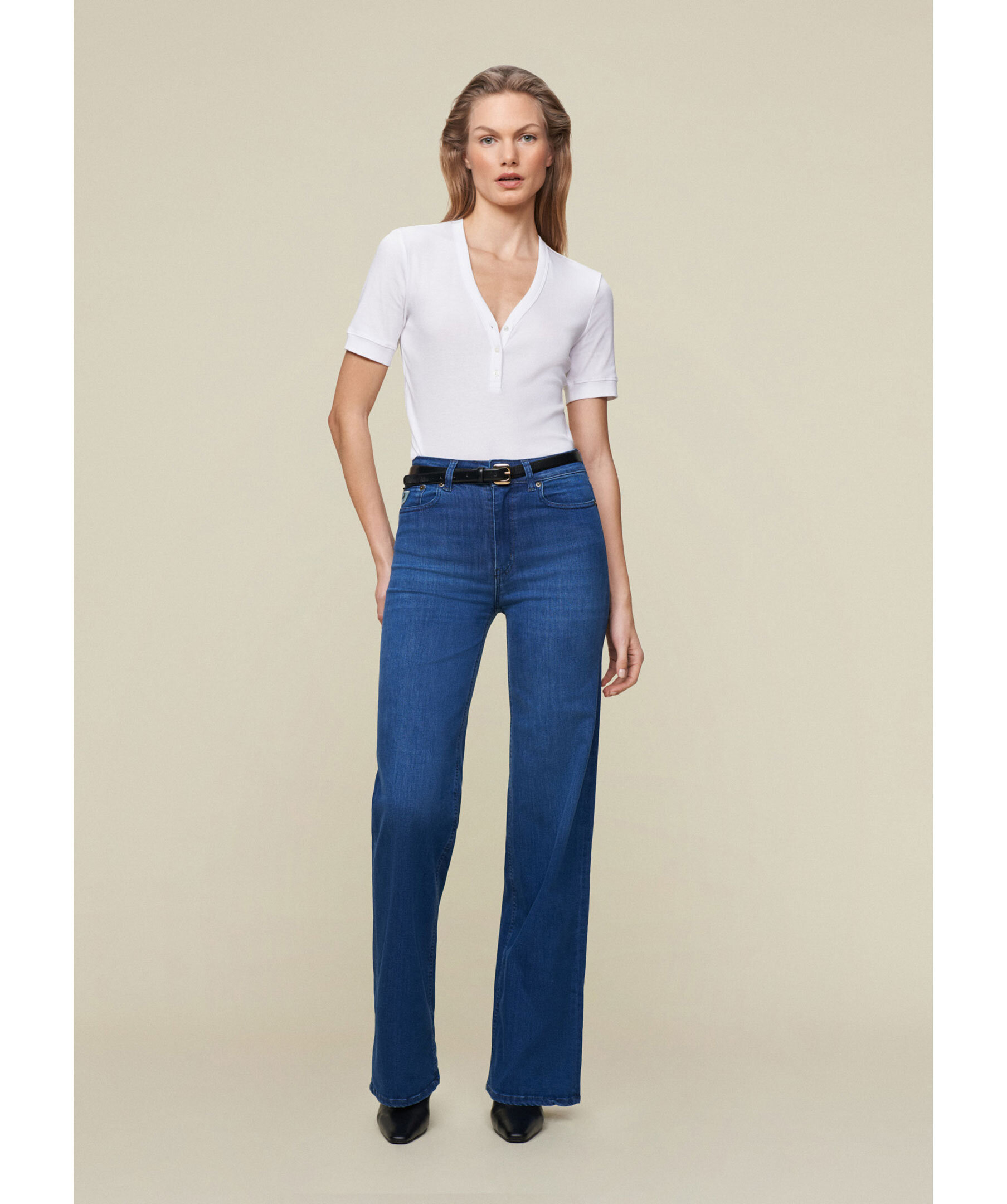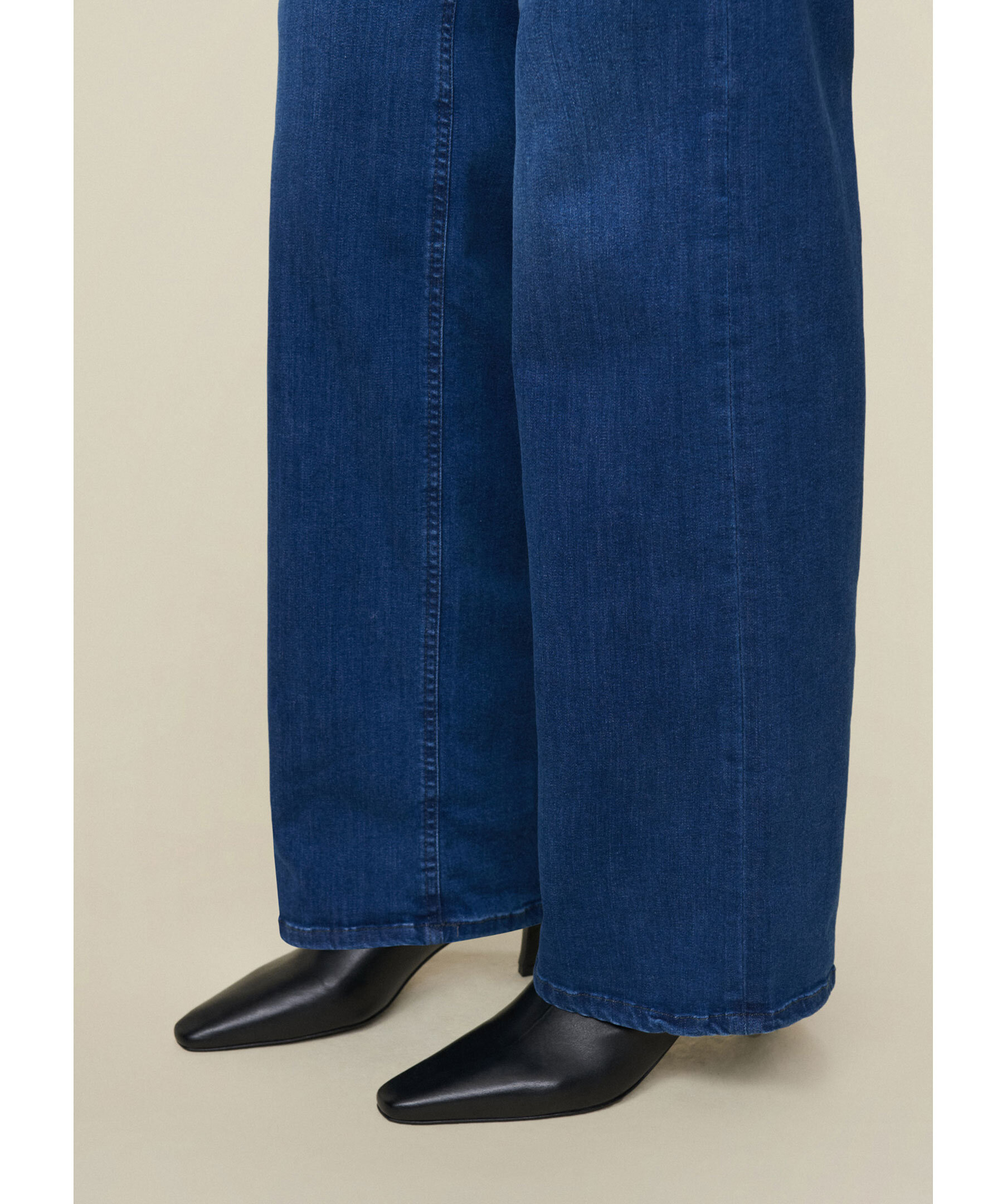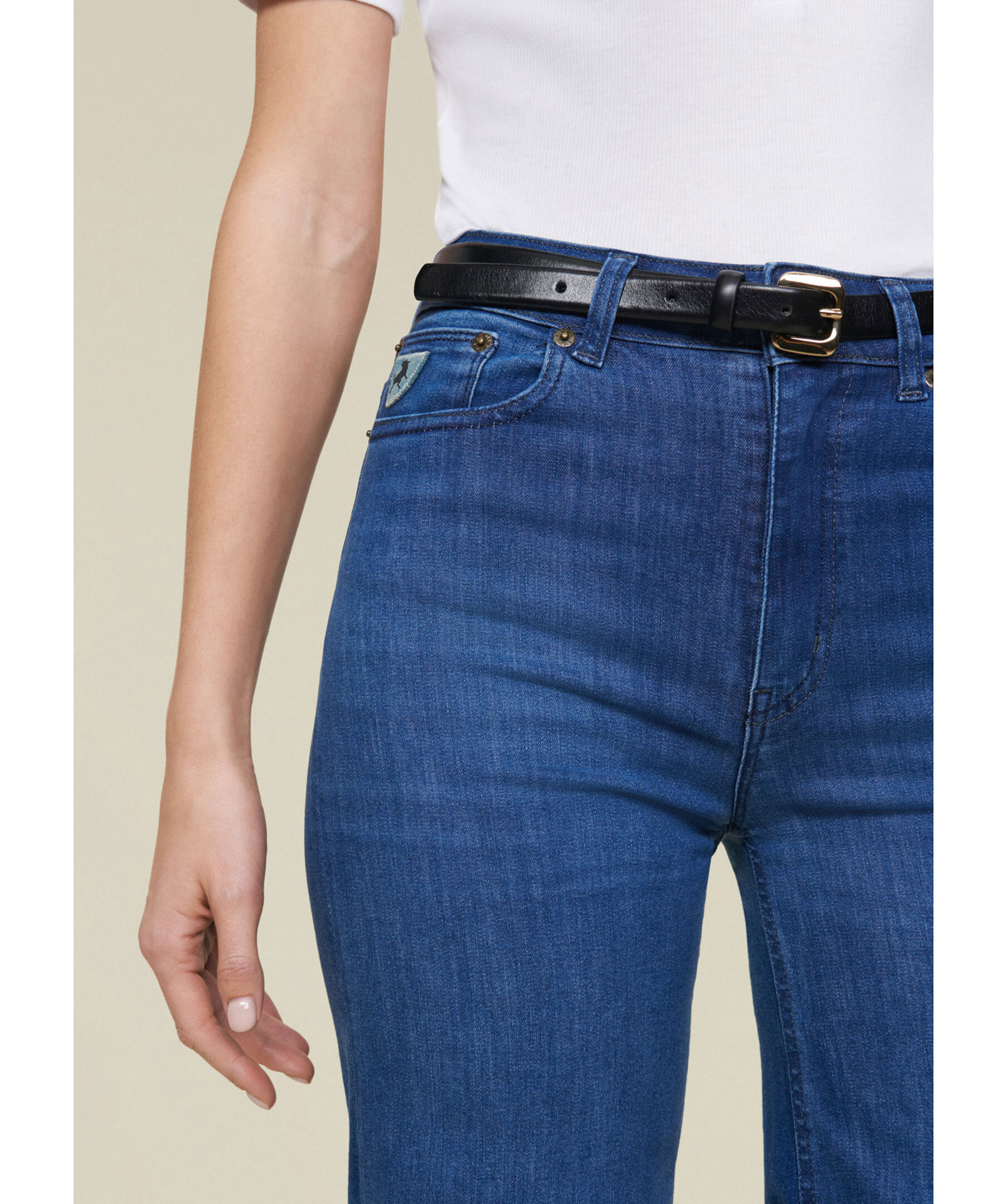 Blåa jeans från Lois. Hög midja med bälteshällor. Fem fickor. Utsvängda ben. Tillverkade i en bomullsblandning.