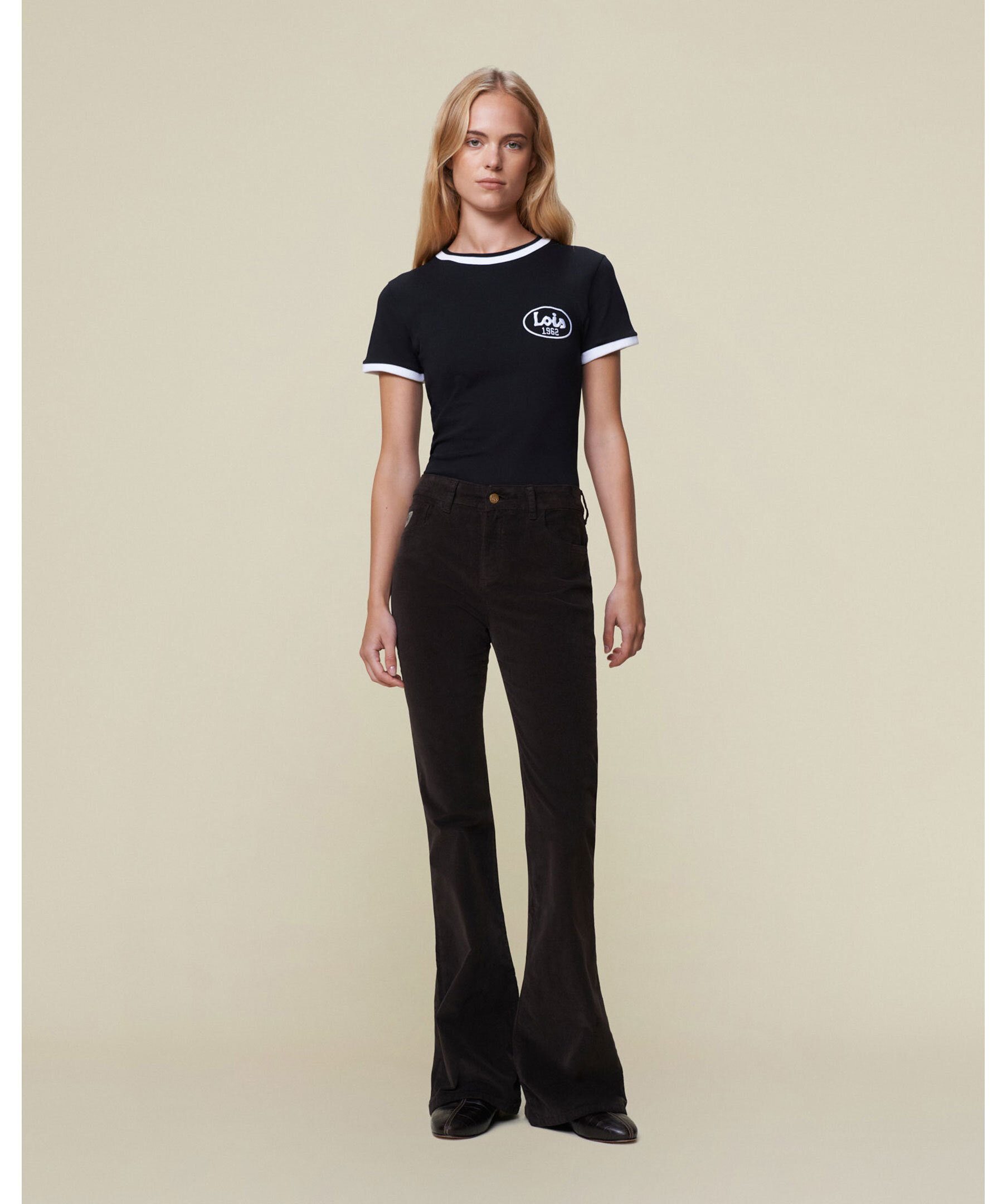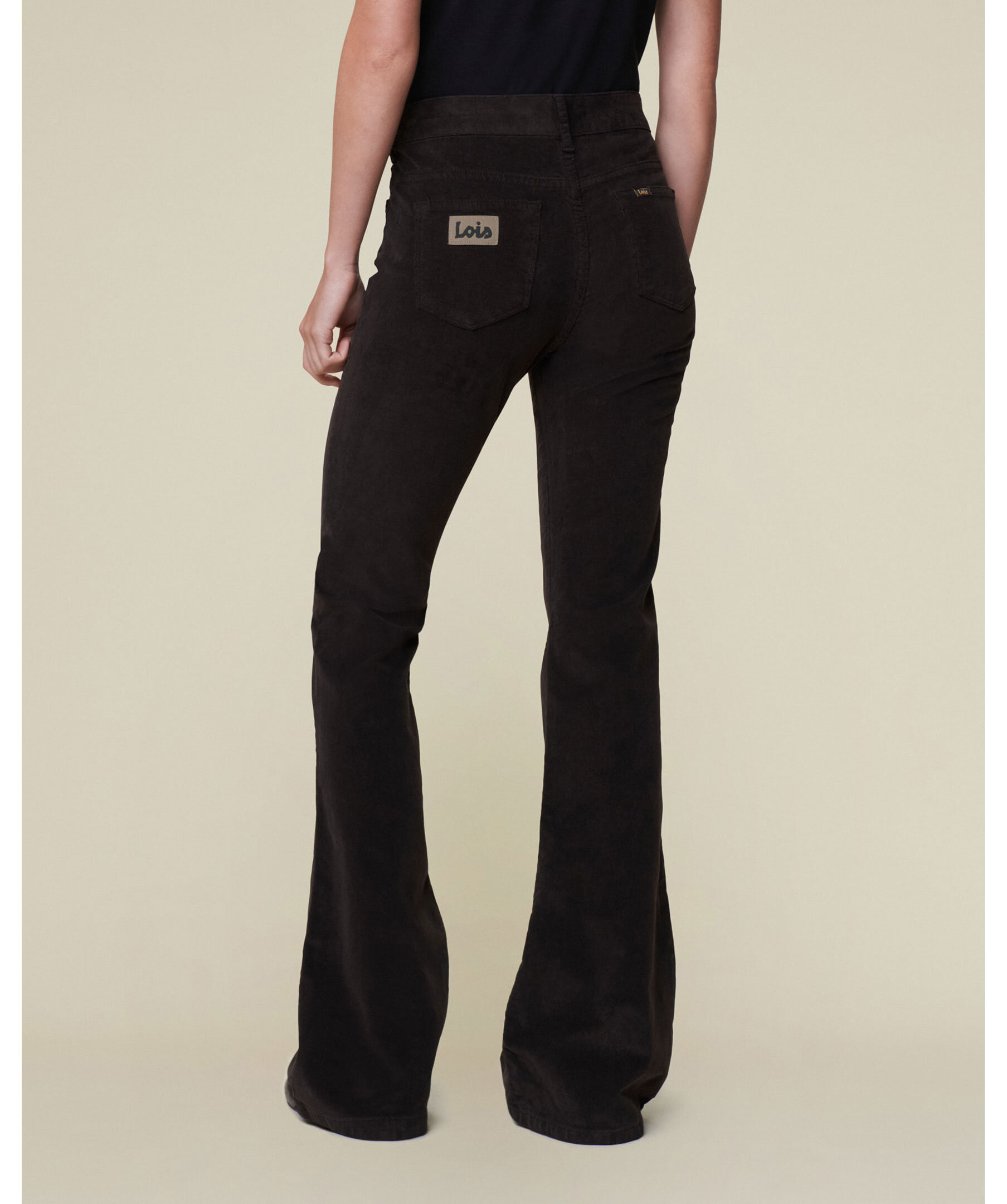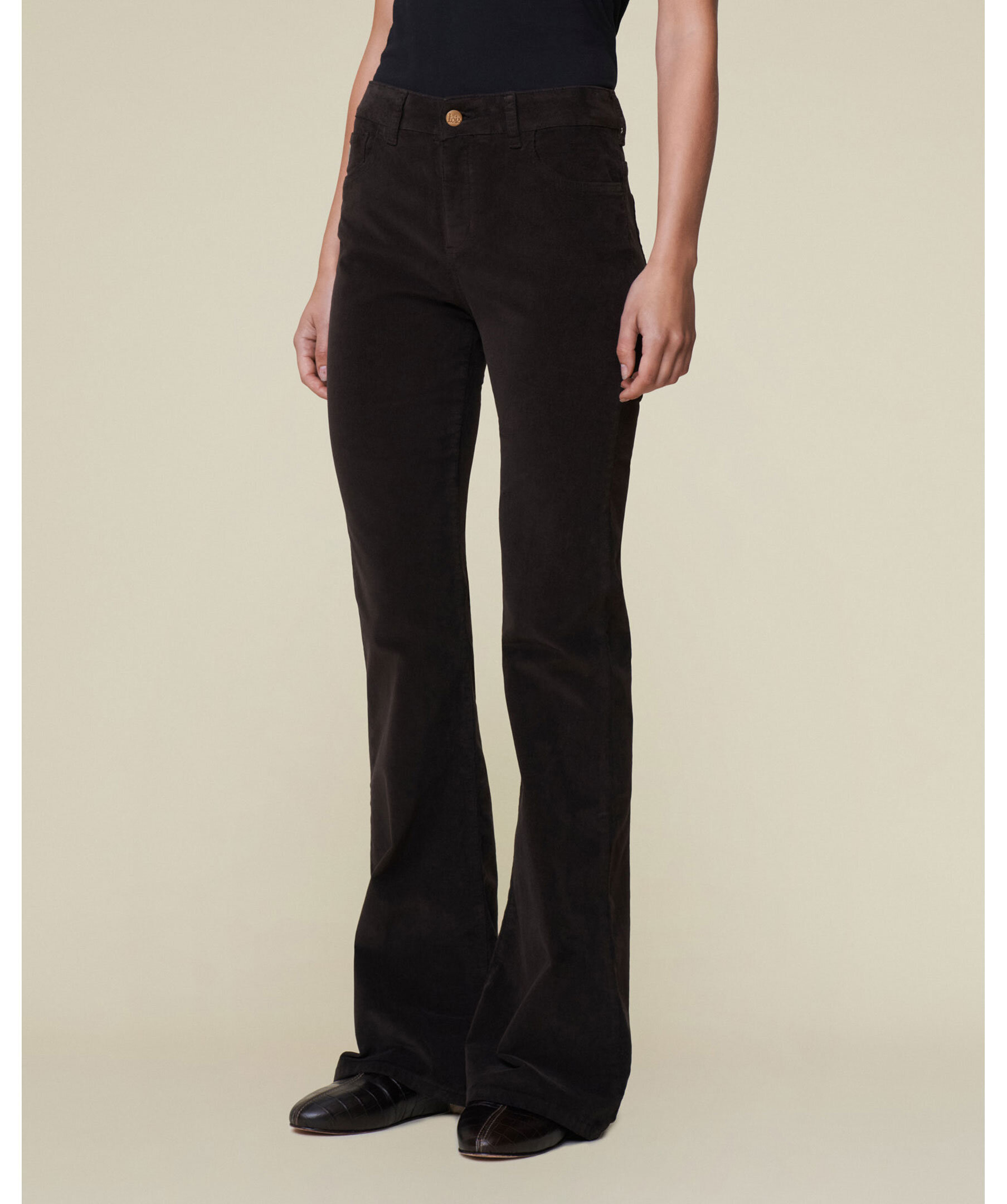 Bruna jeans i smal manchester. Gjorda i en stretchig bomull och lyocellblandning. Hög midja och utsvängda byxben. Modellen är 175 cm lång och har på sig storlek 27/34.