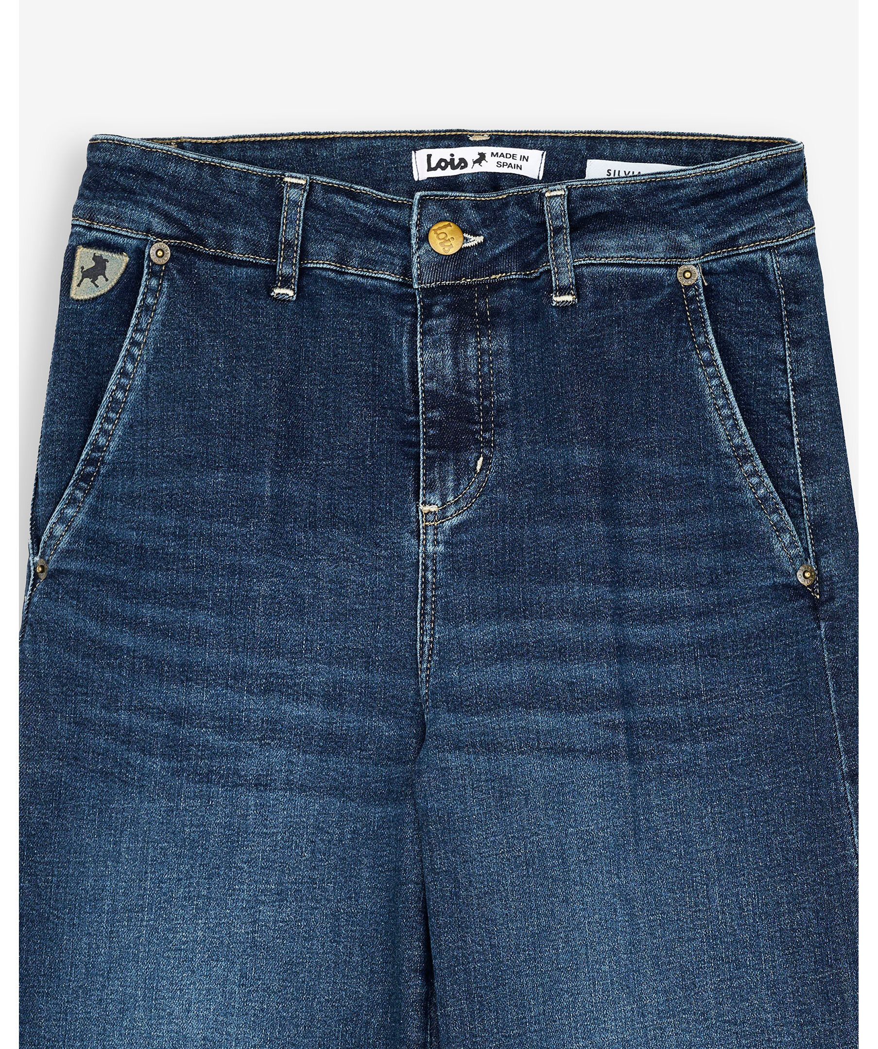 Mörkblå jeans från Lois. Jeansen har en hög midja, smal passform över höften och vida, utsvängda ben som skapar en smickrande siluett. Stretchigt material ger ökad komfort och rörelsefrihet – perfekta för både vardag och fest.