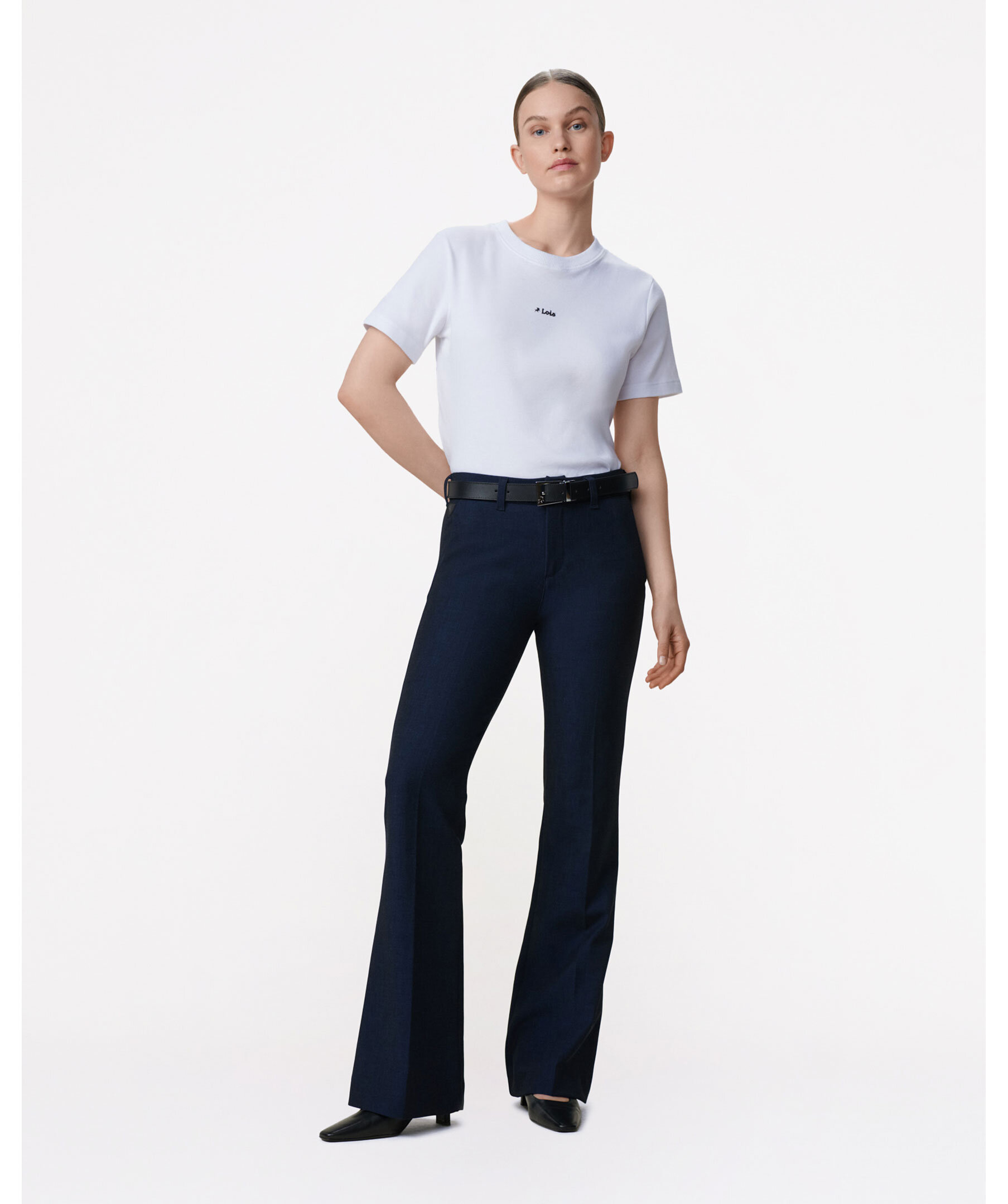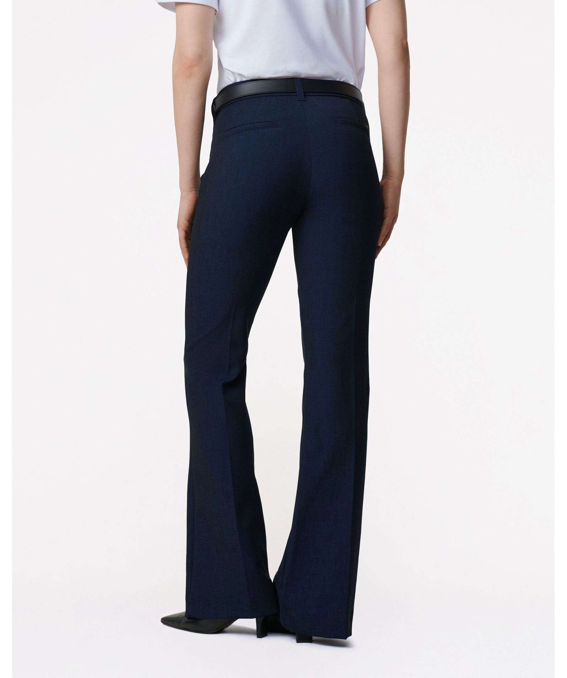 Mörkblå chinos med hög midja och utsvängda ben från Lois. Tillverkad i ett exklusivt tyg med ullkänsla, men med bättre stretch, mjukare mot huden och enkelt att tvätta – perfekt för både vardag och arbete.