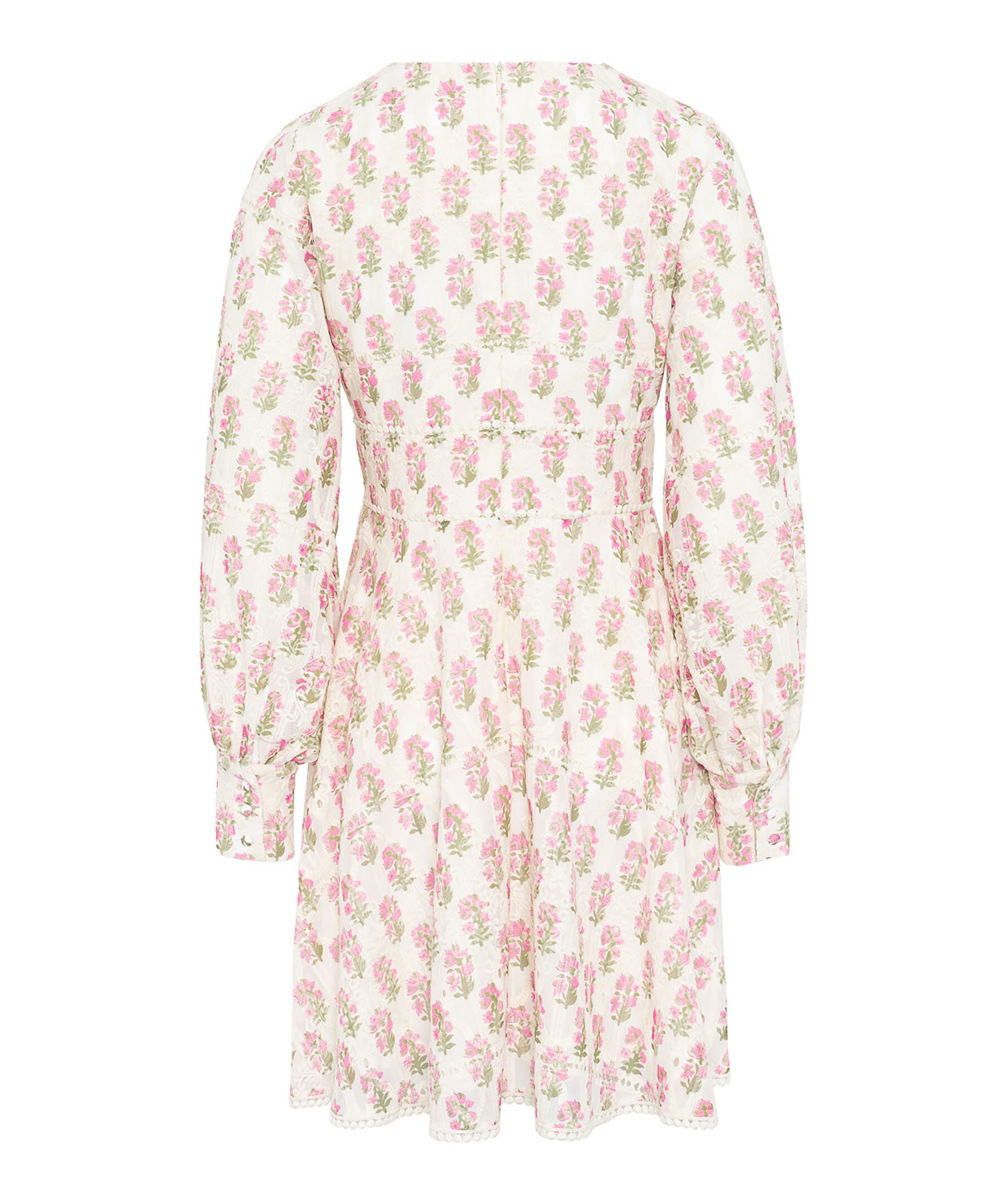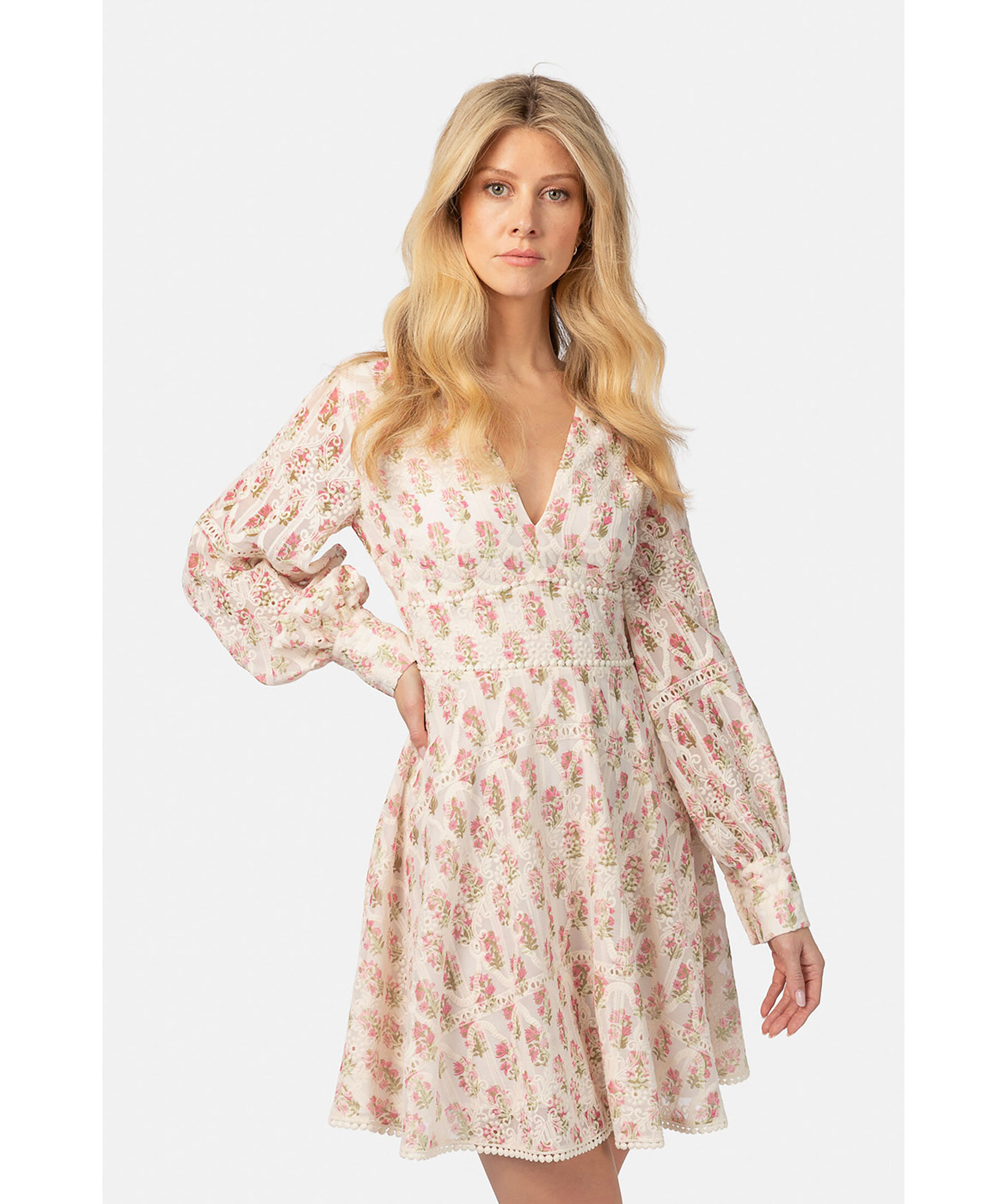 Blommönstrad, kort klänning från Love Lolina. Klänningen slutar strax ovanför knänen och har v-ringad halsringning, långa voluminösa ärmar, samt broderidetaljer. Tillverkad i en bomullsblandning med foder i viskos.