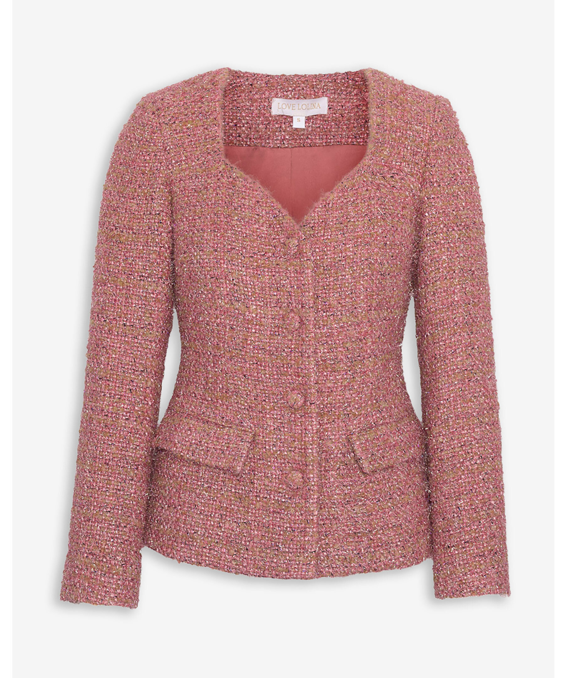 En feminin tweedkavaj från Love Lolina med skulpterad midja och mjukt markerad sweetheart-urringning. Tygklädda knappar, dekorativa fickor och en figurnära passform gör den perfekt för både kontoret och eleganta vardagslooks. En stilfull kavaj som kombinerar klassisk charm med modern siluett.
