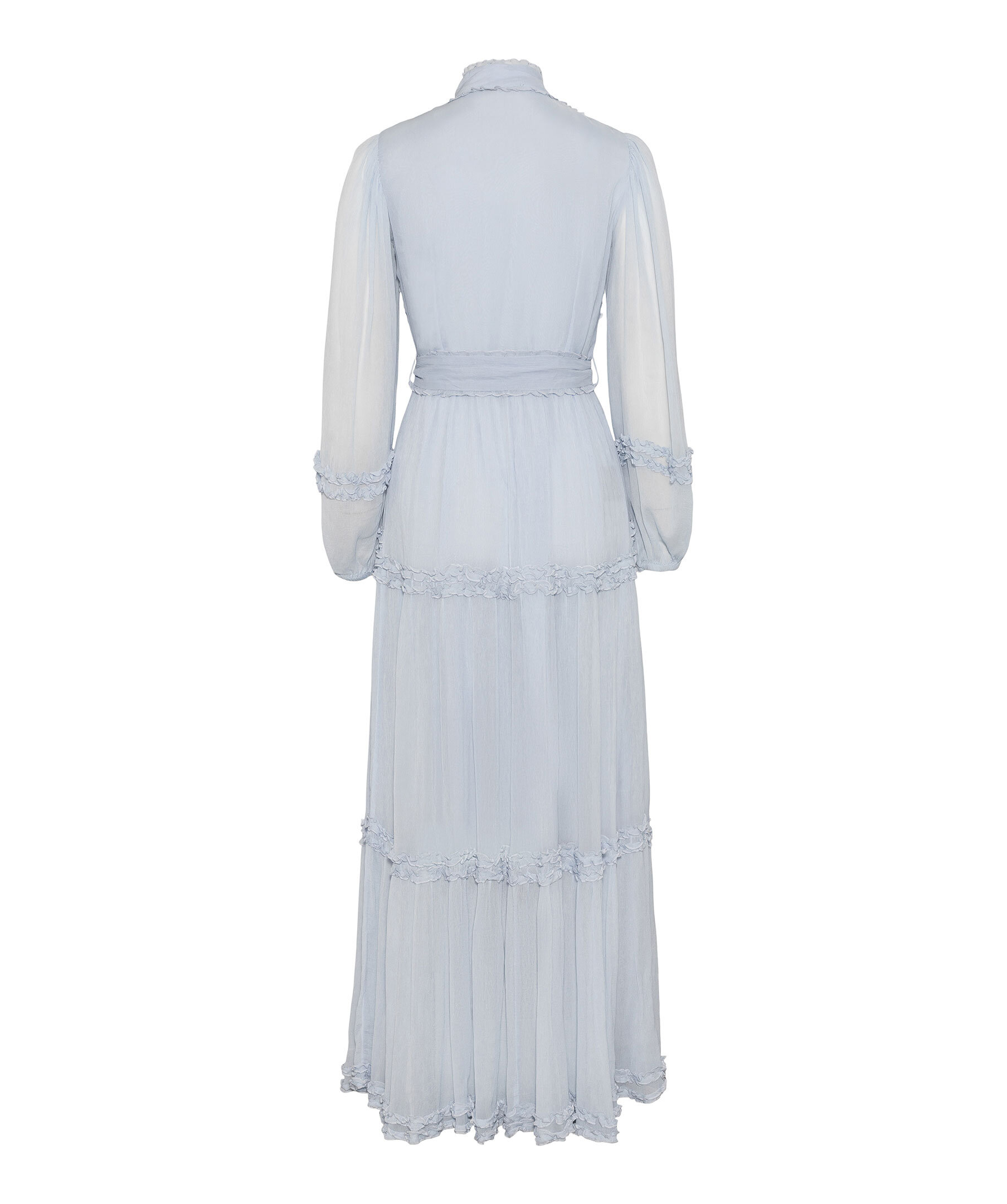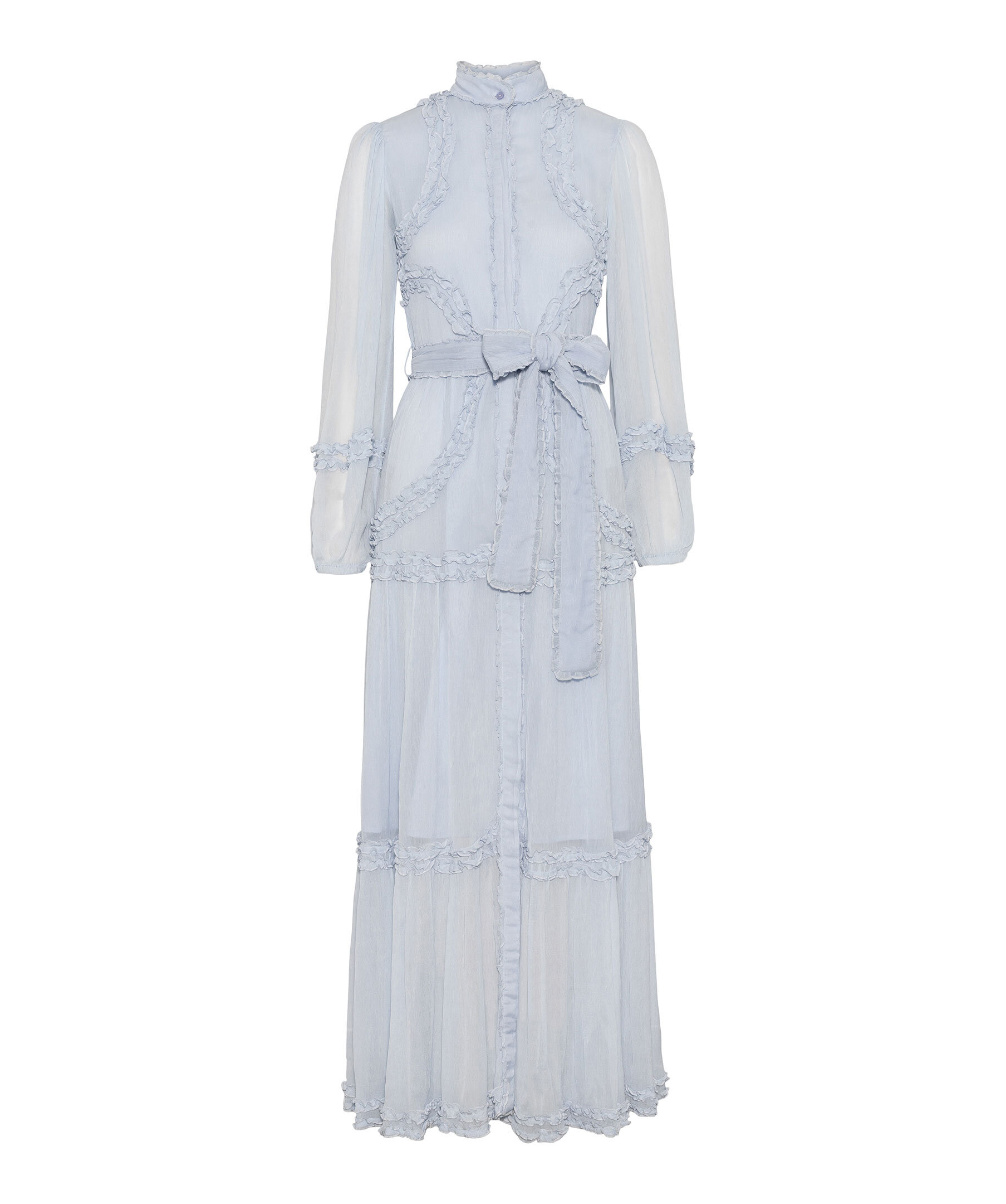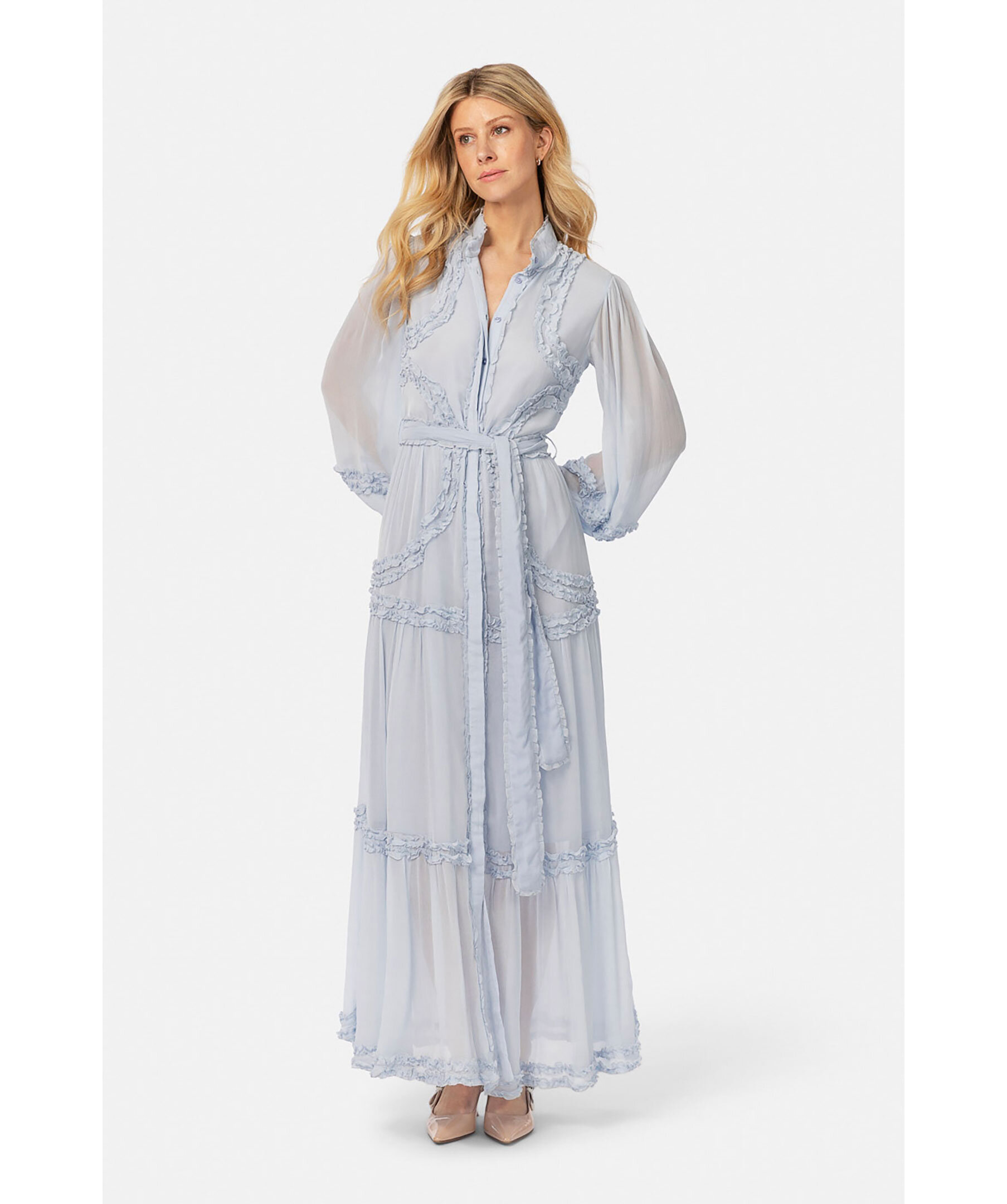 Ljusblå maxiklänning från Love Lolina. Klänningen har något högre krage, långa, semi-transparenta, voluminösa ärmar för en romantisk touch. Den har ett bälte i midjan som framhäver siluetten samt dolda knappar framtill. Utsmyckas med volangdetaljer. Tillverkad i polyester.