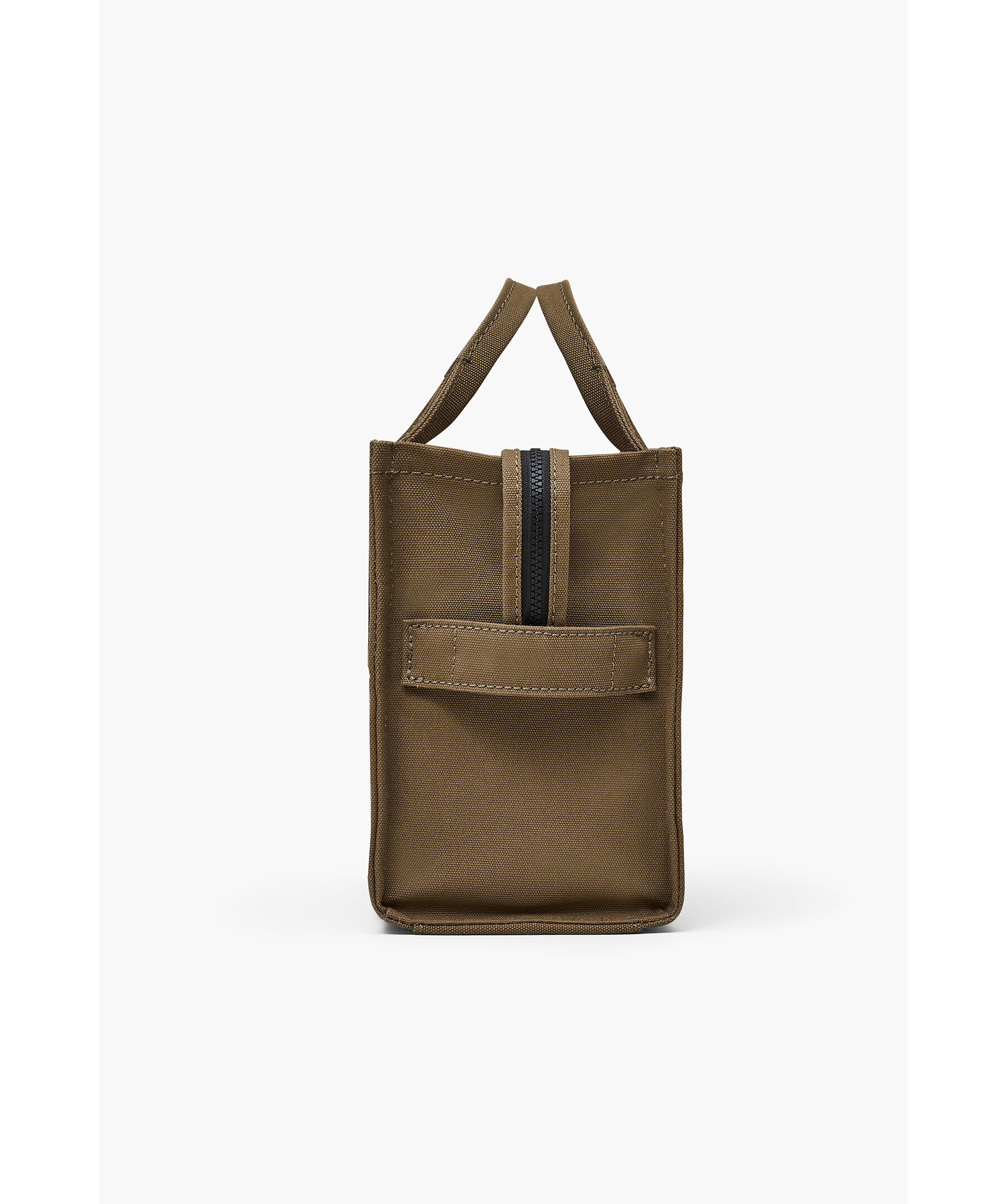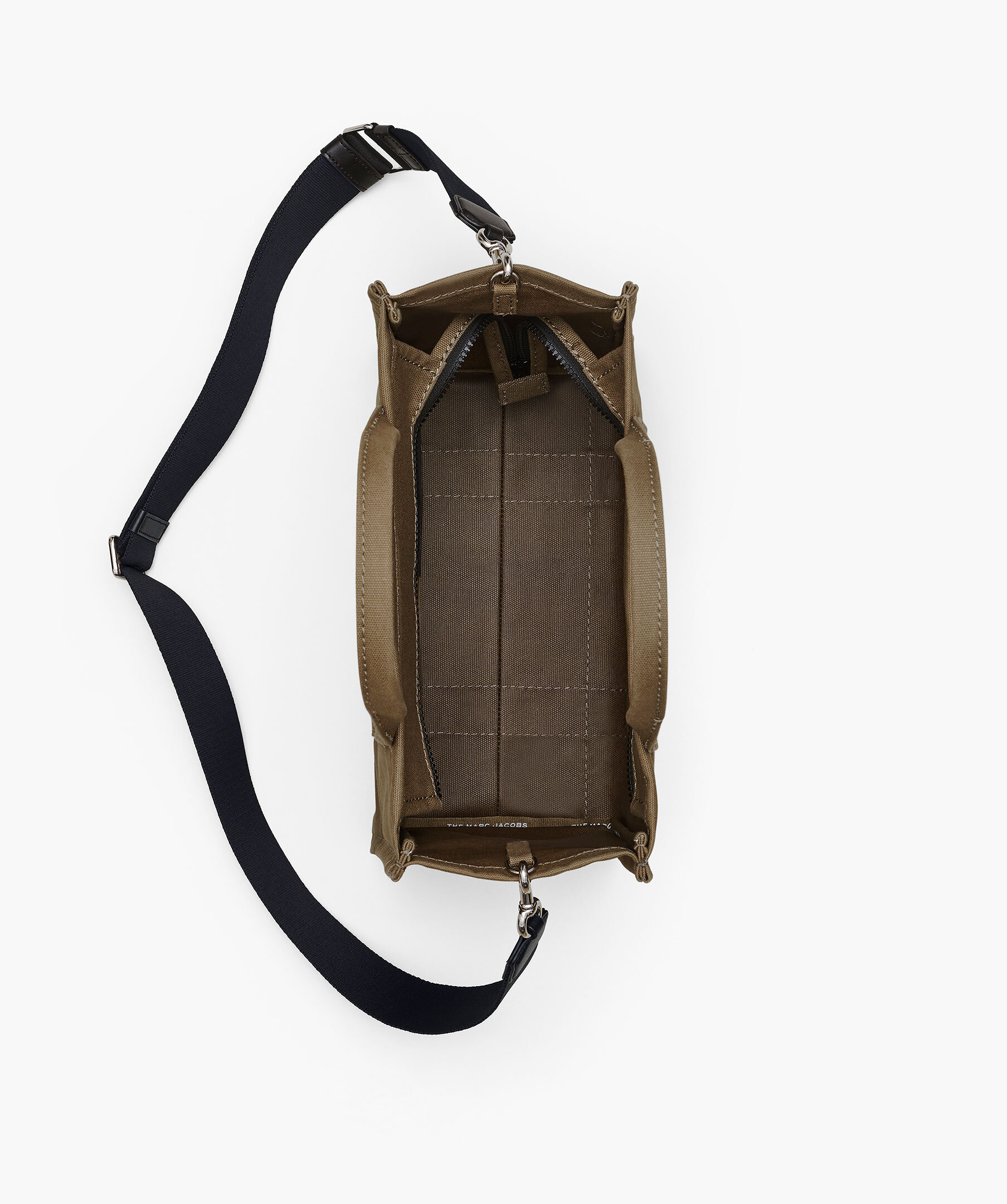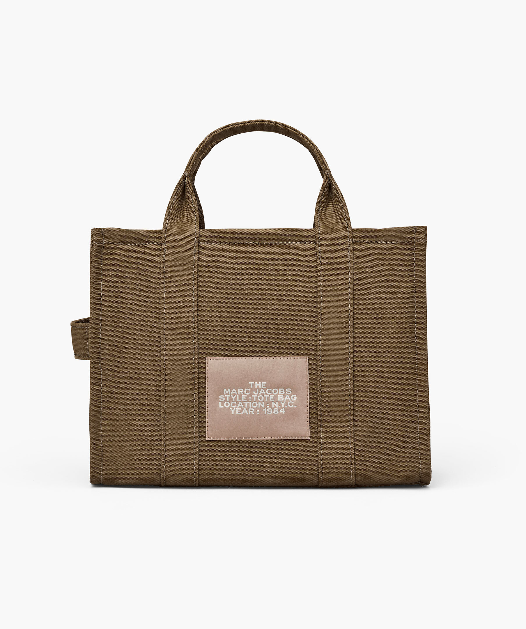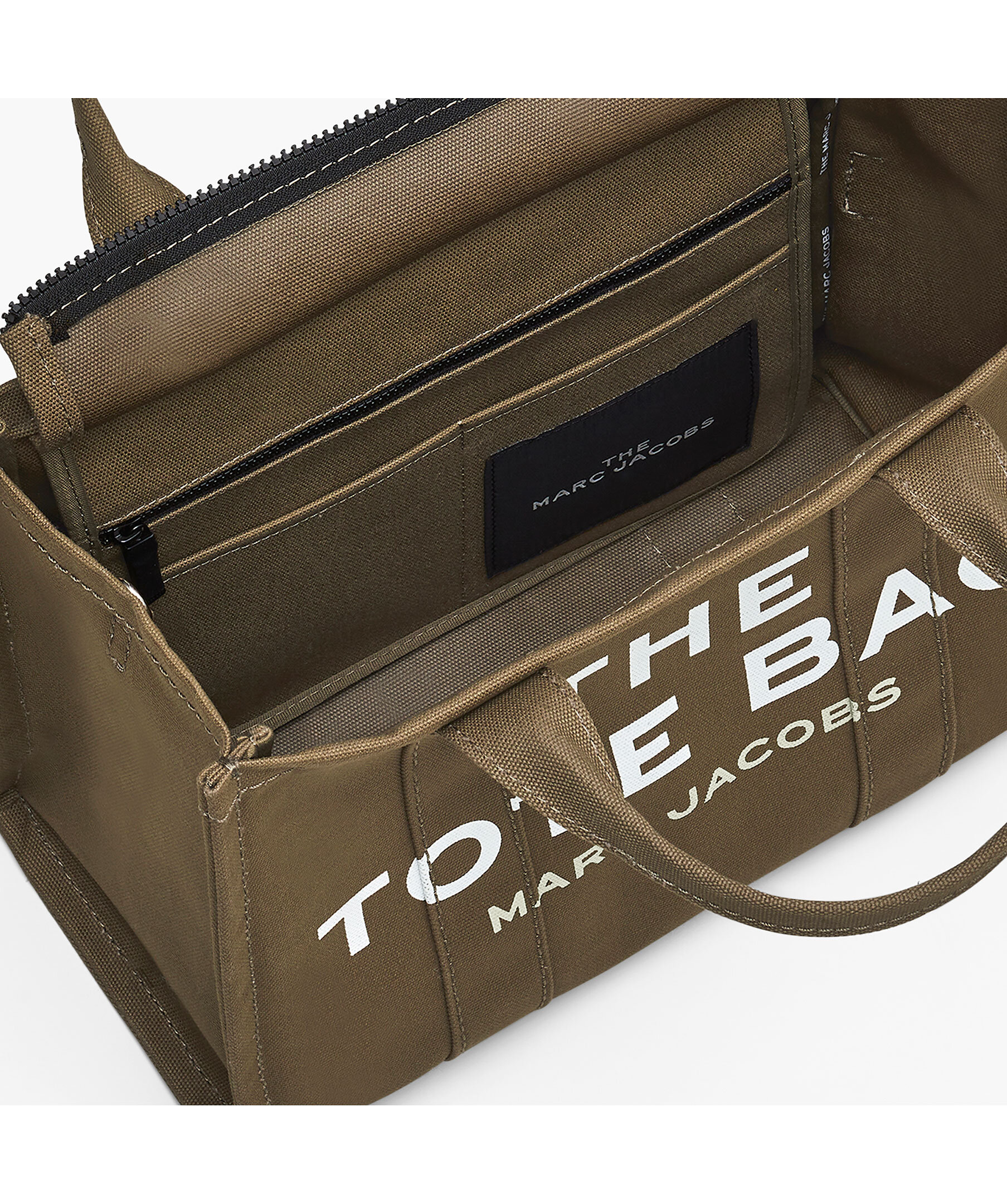 Skogsgrön, canvas-tote i bomull från Marc Jacobs. Vit, tryckt logotyp fram och liten patch med logotyp på baksidan. Stängs med blixtlås och har en innerficka med blixtlås samt två mindre öppna fickor. Axelband tillkommer. Mått: 32cm L x 16cm D x 24cm H, handtag 11cm.