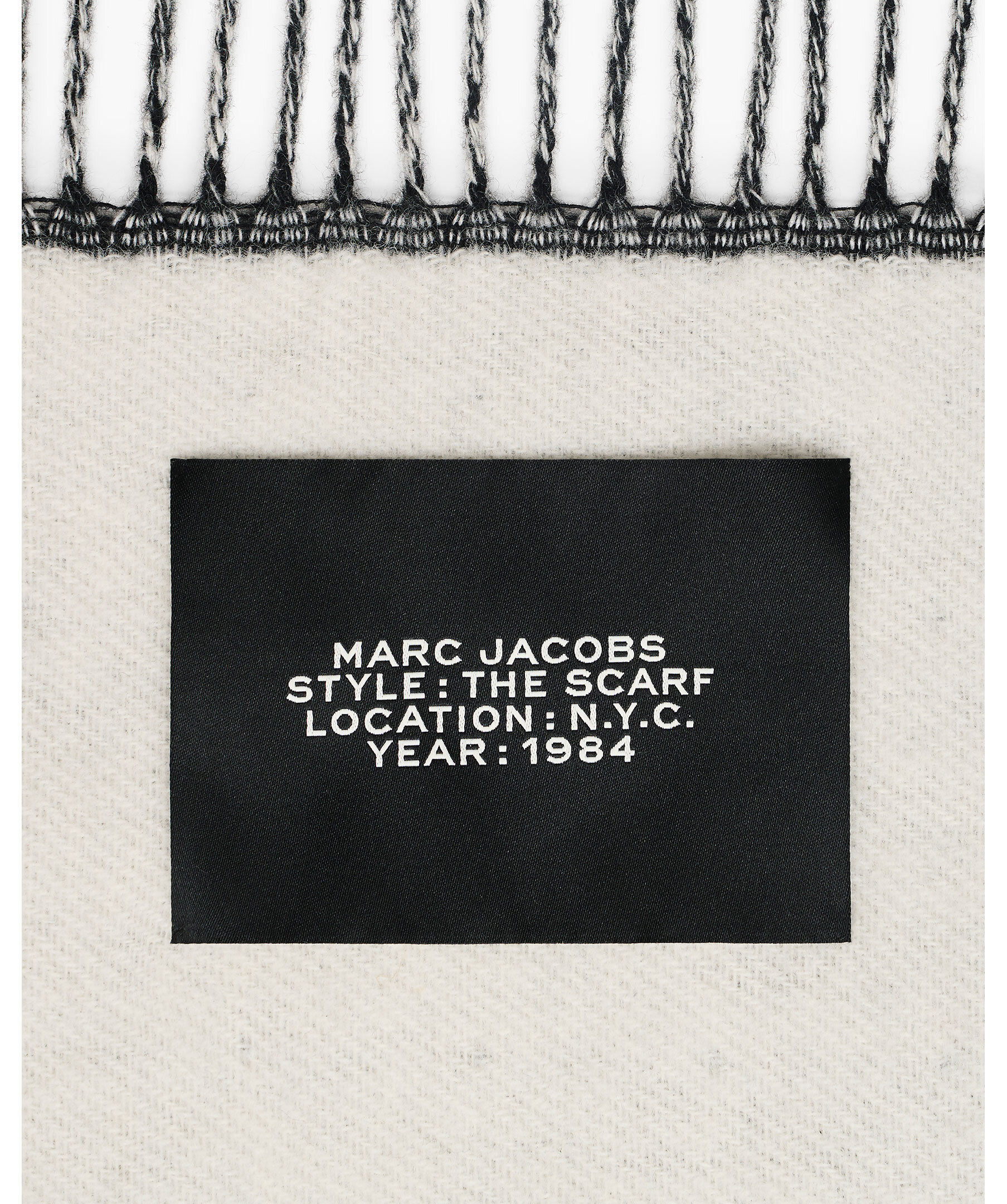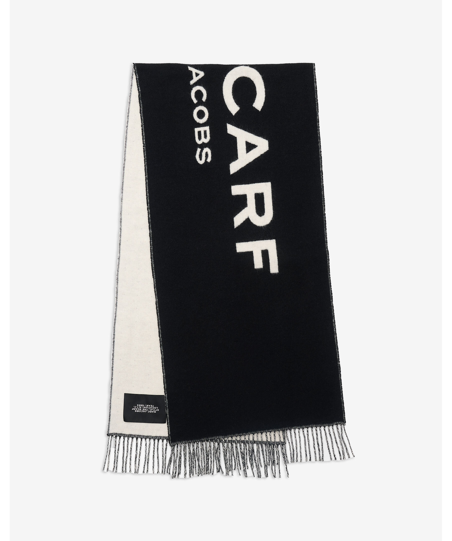Svart och vit halsduk från Marc Jacobs. Halsduken har stor vävd logotyp på båda sidor samt fransar vid kortsidorna. Tillverkad i en ullblandning. Mått: 170 cm x 30 cm.